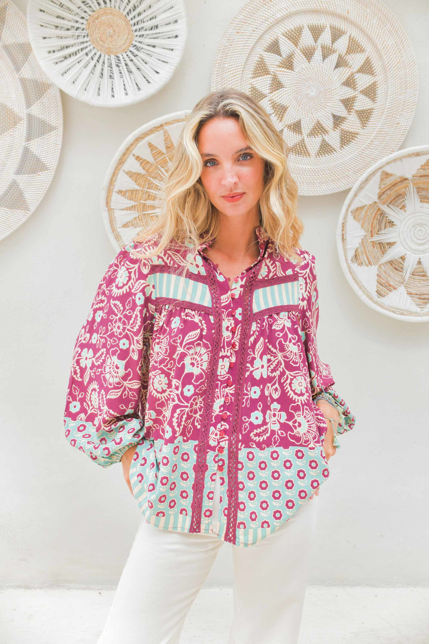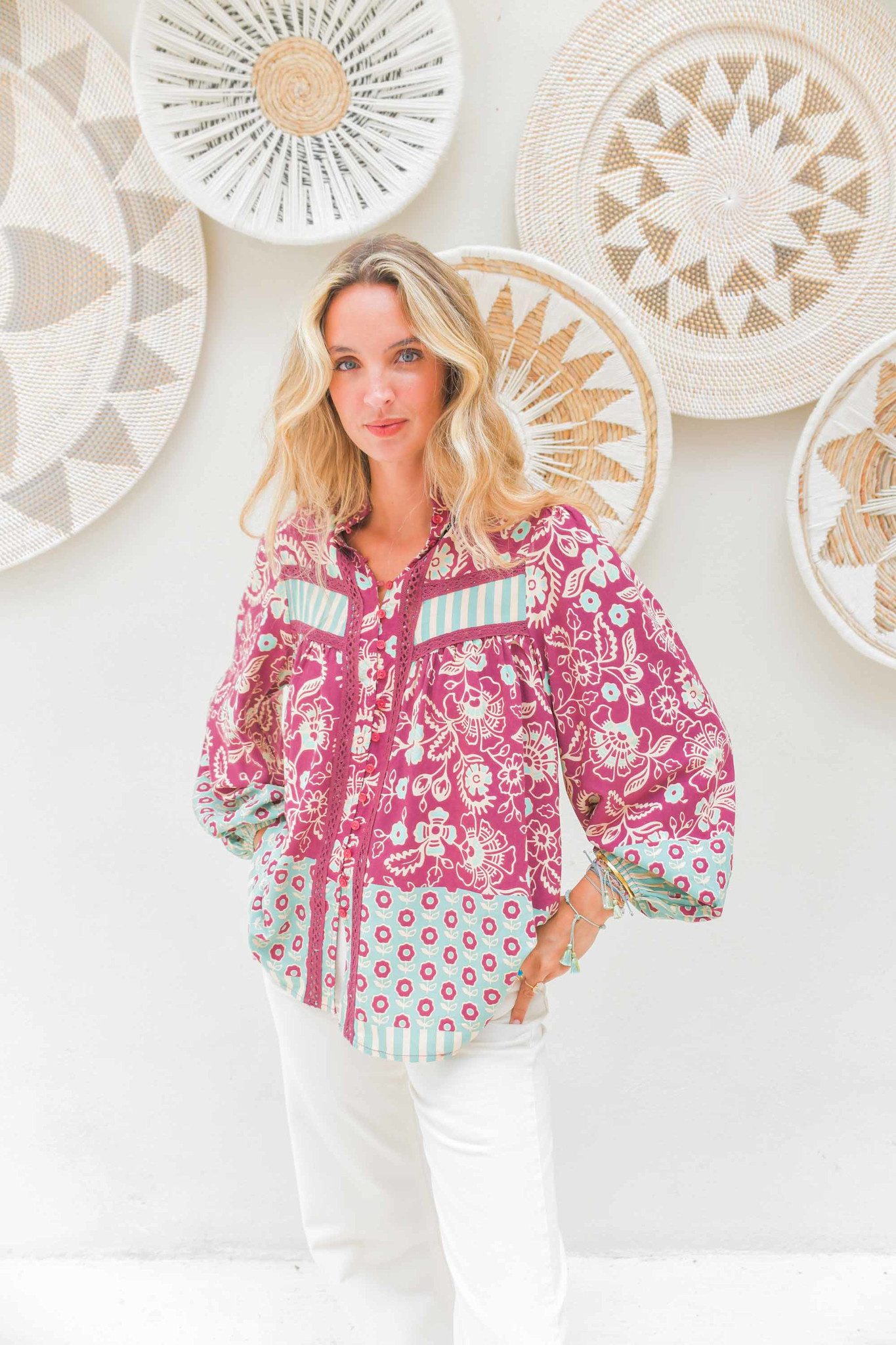 De blouse Athena Bee van het merk Jaase is een losvallende blouse met een opstaand boordje. De blouse heeft een mooie bloemenprint en is afgewerkt met opengewerkte borduursels. De lange mouwen vallen losjes rond de pols.