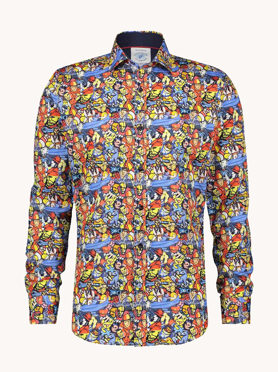 Dit overhemd van A Fish Named Fred is er niet voor de grijze massa. De drukke, kleurrijke print vol actie en details maakt meteen duidelijk: jij kiest niet voor standaard.