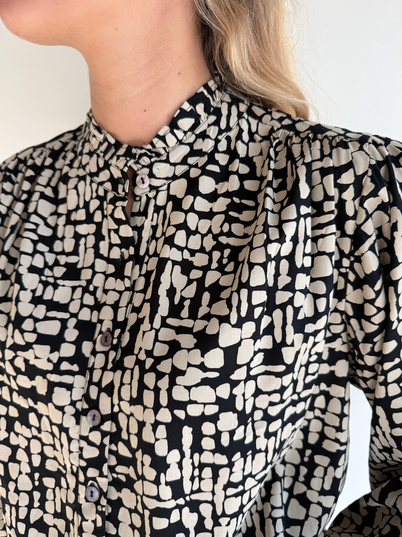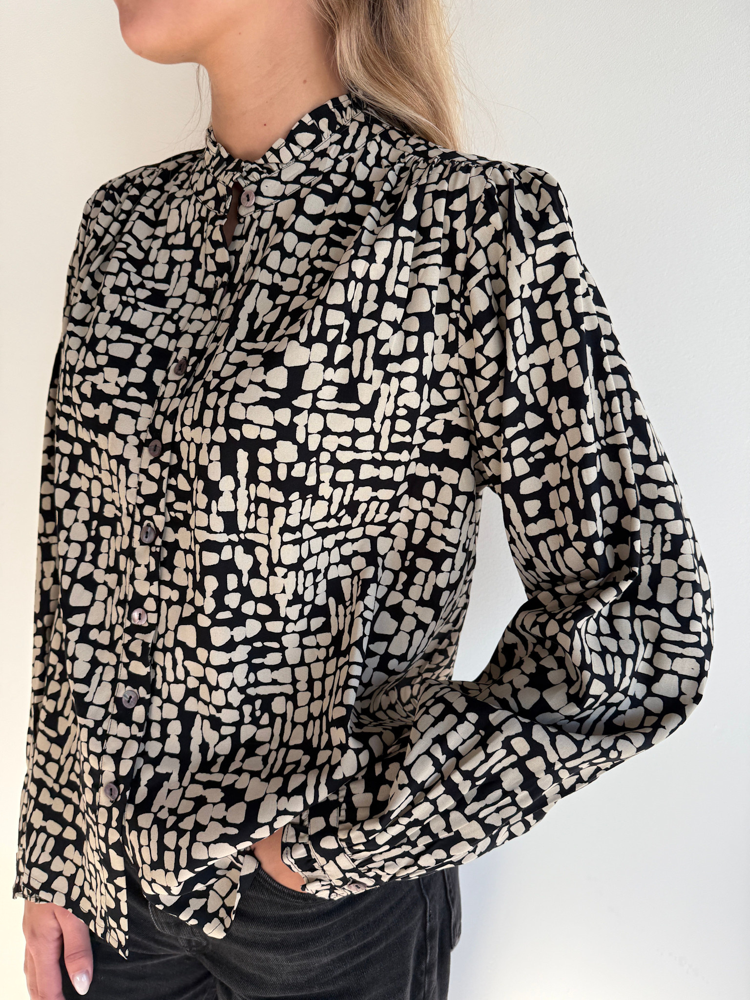 De Esra Poppy blouse van het Nederlandse merk Bindi is een tijdloze zwart-witte blouse met een elegante, vrouwelijke touch. Uitgevoerd met een klein opstaand kraagje, lange mouwen en nauwsluitende manchetten, voor een verfijnde pasvorm. Het doorknoopdetail maakt de blouse veelzijdig en gemakkelijk te combineren, van casual jeans tot een stijlvolle rok voor een chique boho-look.