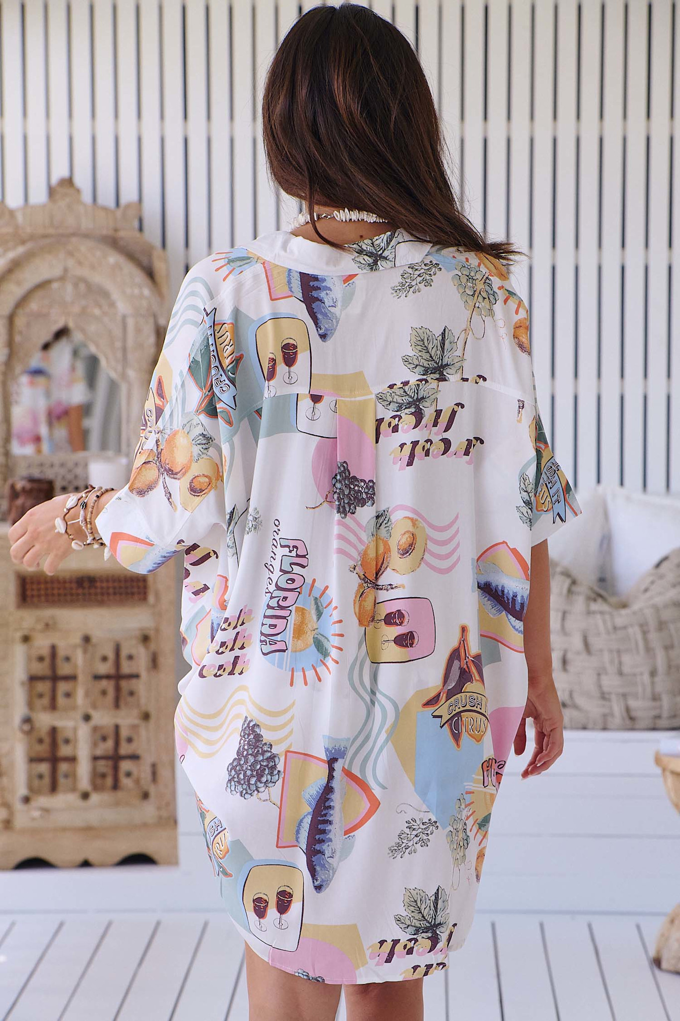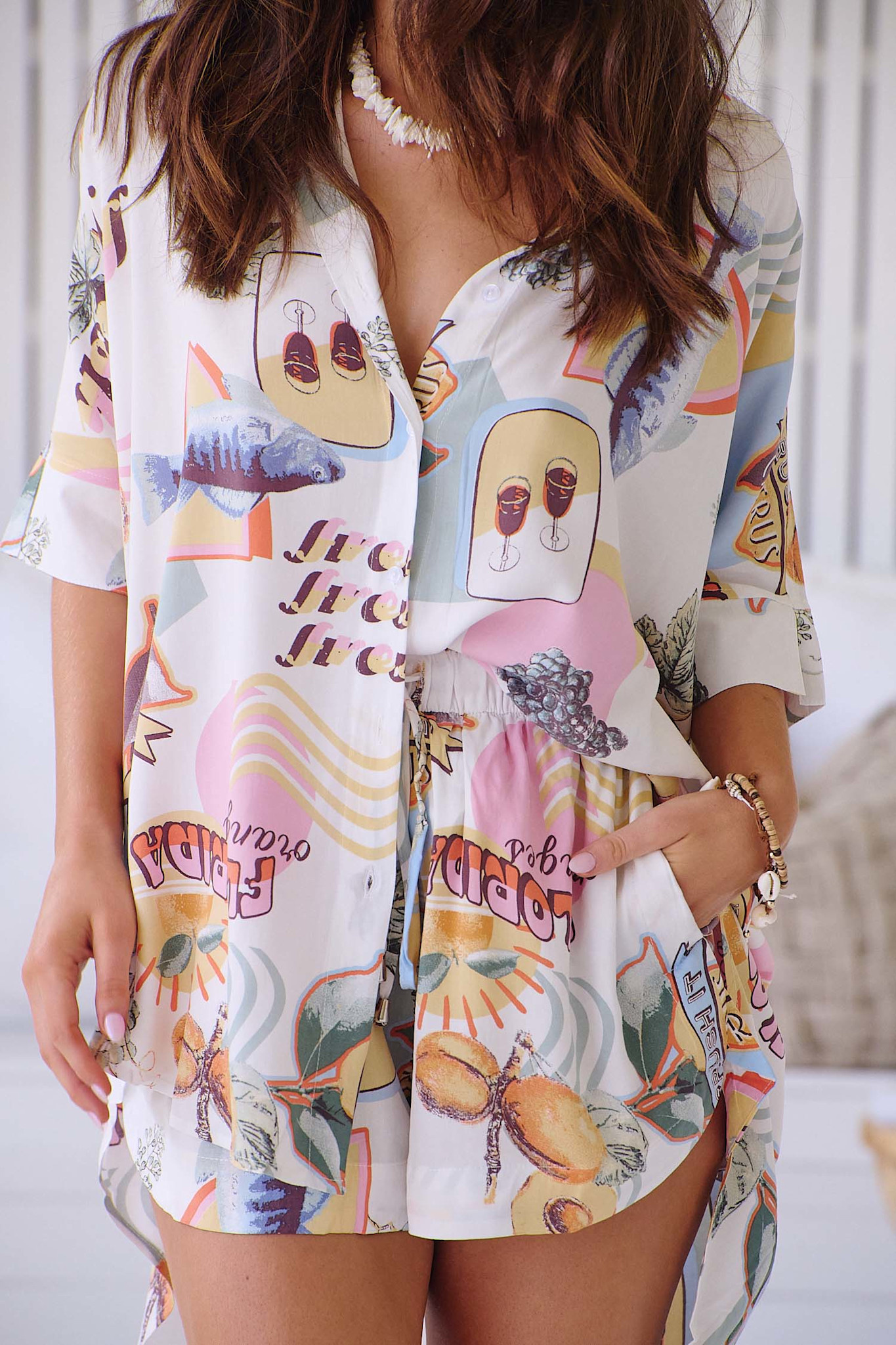 De blouse Florida Feels River van het merk Jaase is een losvallende blouse met korte mouwen en een kraagje. De blouse heeft een uitgesproken zomerse print.
