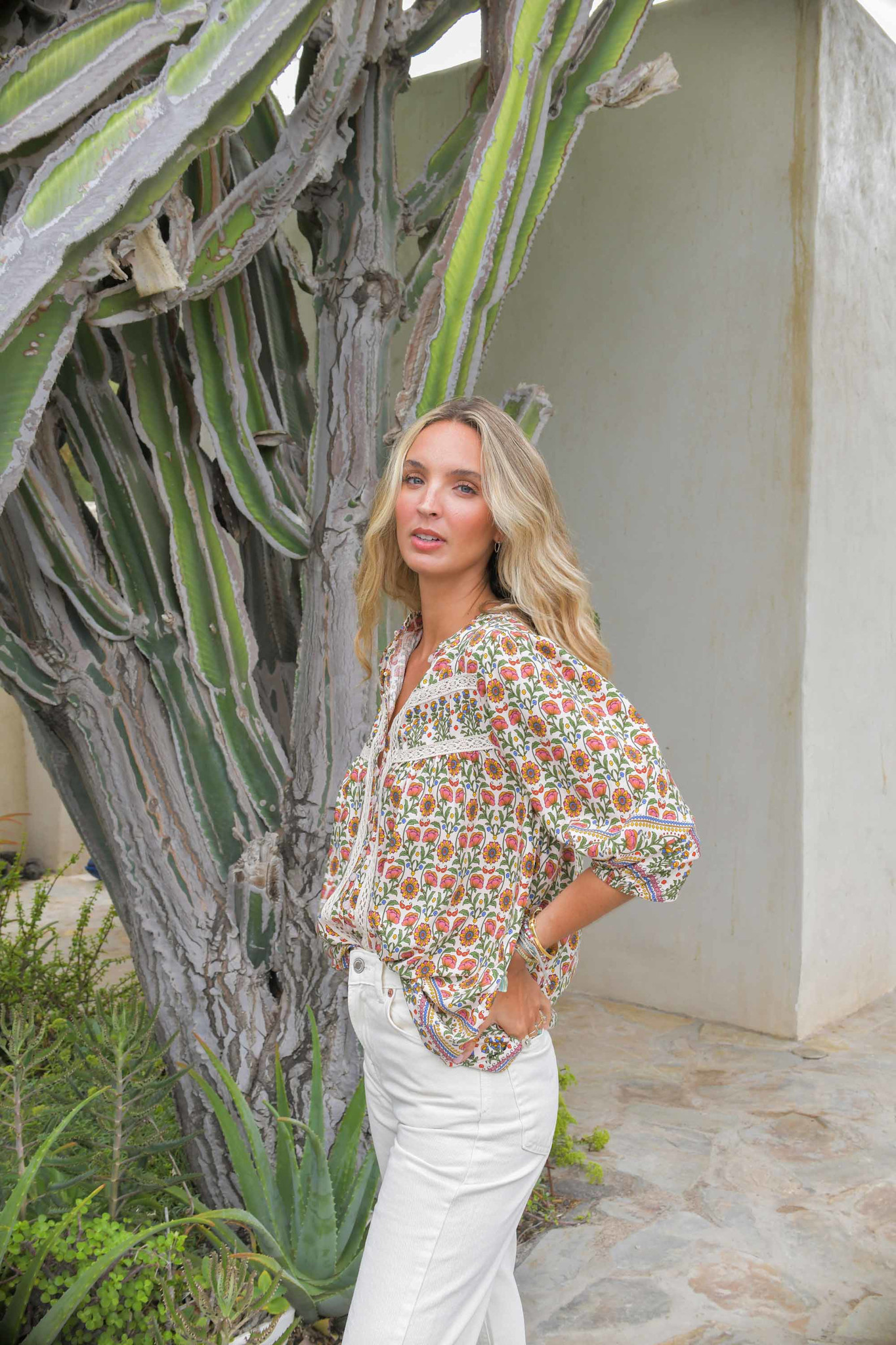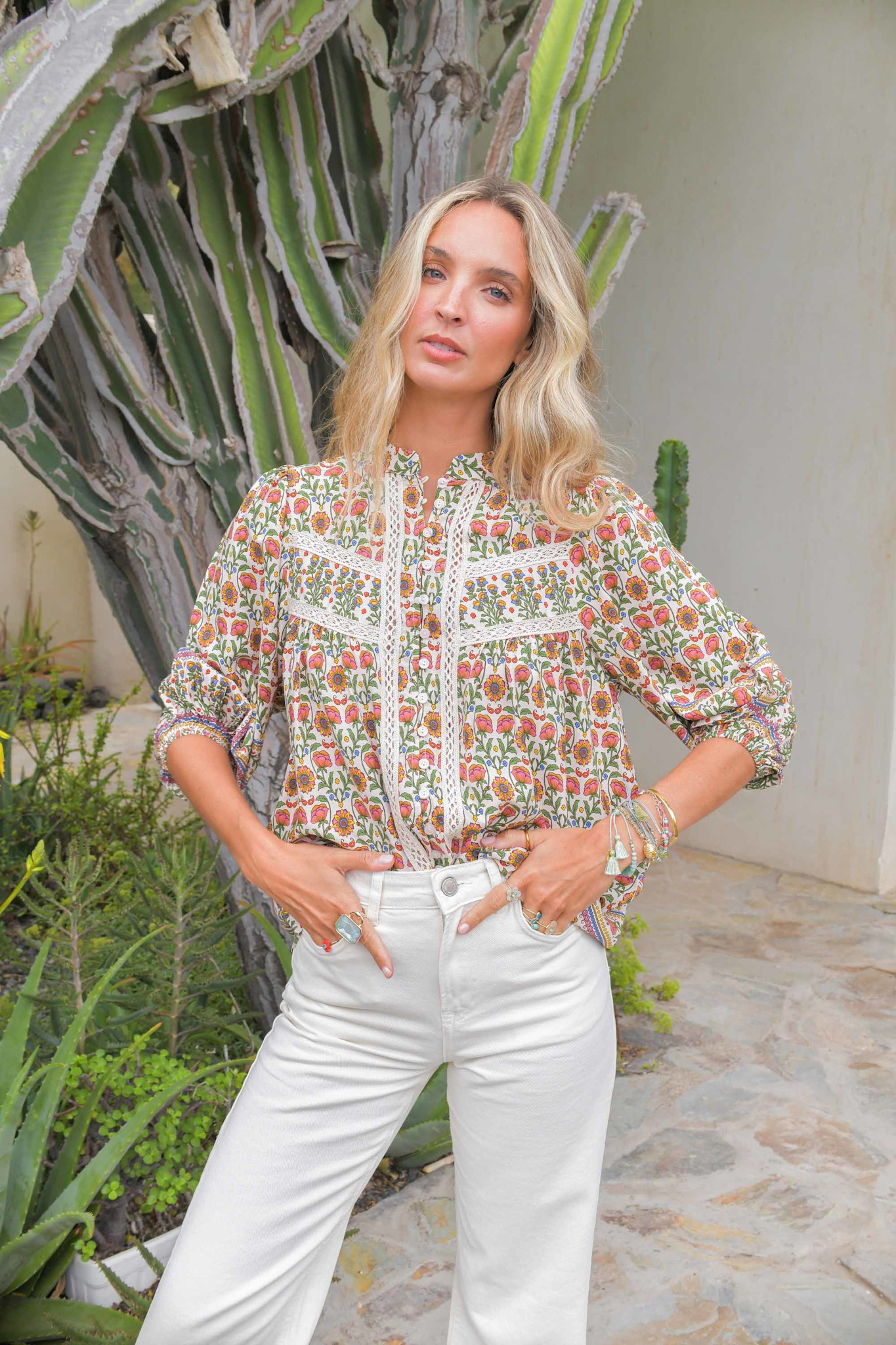 De blouse Harlow Bee van het merk Jaase is een losvallende blouse met een opstaand boordje. De blouse heeft een mooie bloemenprint en is afgewerkt met opengewerkte borduursels. De lange mouwen vallen losjes rond de pols.