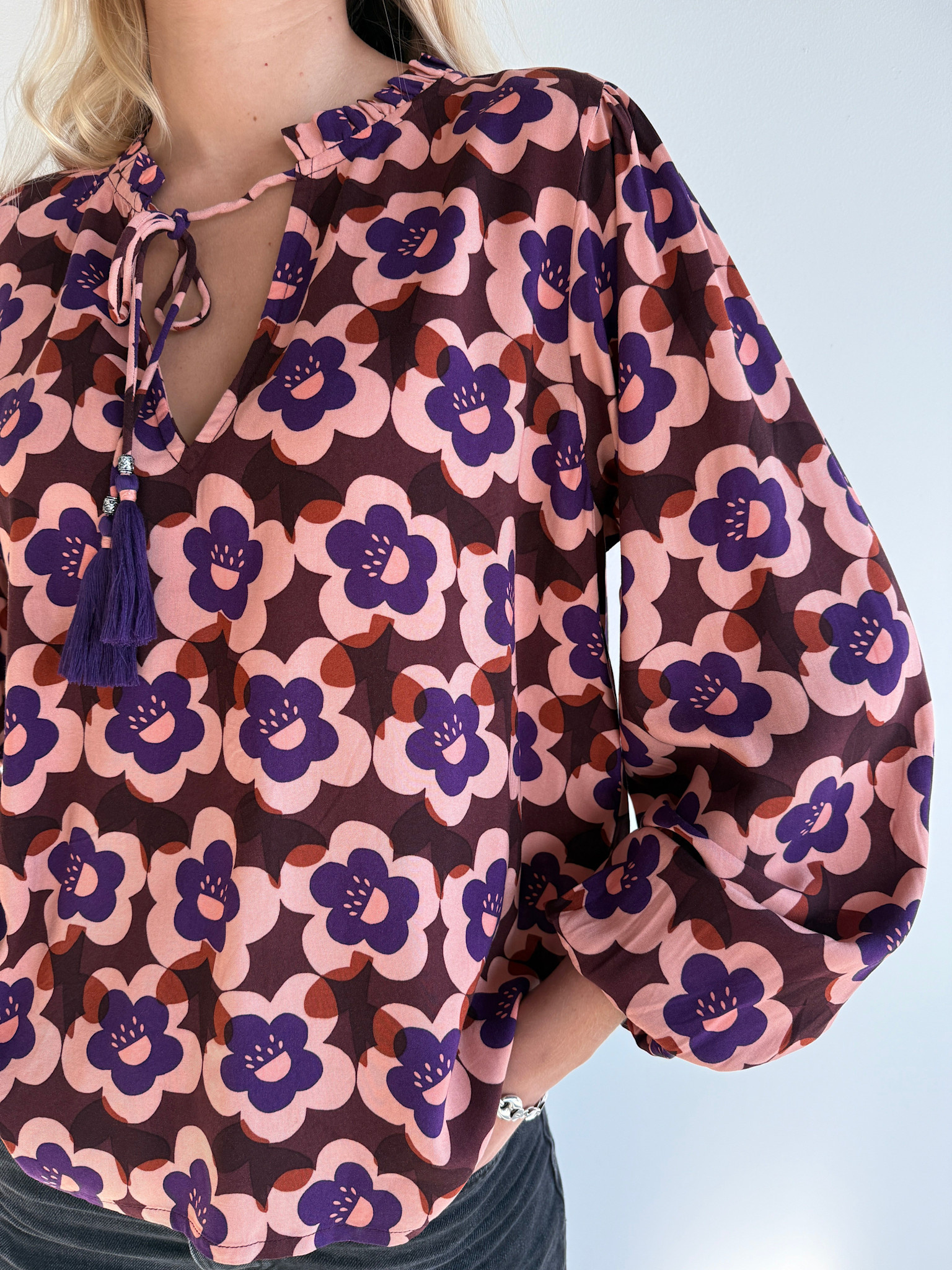 De Esra Poppy blouse van het Nederlandse merk Bindi is een speelse printblouse met een frisse sixties-vibe. Uitgevoerd met een V-hals en een klein opstaand kraagje, dat je subtiel kunt sluiten met elegante koordjes. Combineer deze blouse eenvoudig met jeans, rok of broek voor een tijdloze boho-look.
