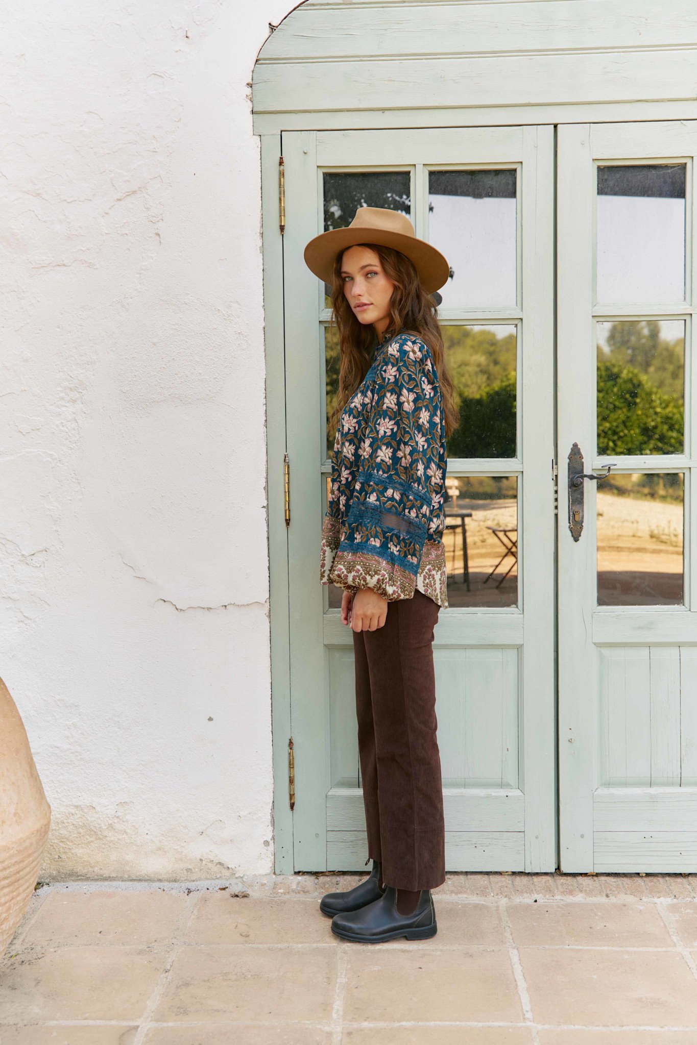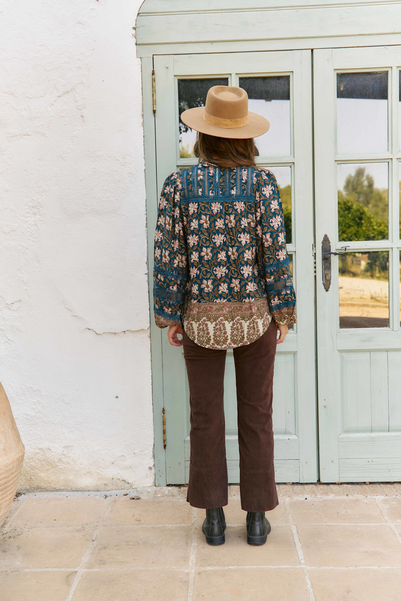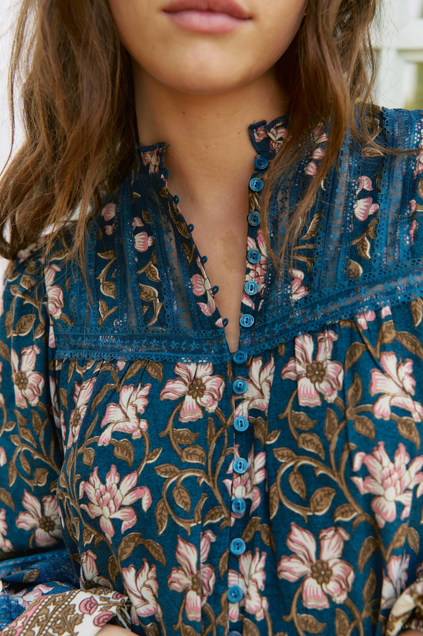 De blouse Nomade Nadia van het merk Jaase is een volledig doorgeknoopte blouse met een klein opstaand boordje. De blouse heeft een mooie paisley en bloemenprint en is afgewerkt met opengewerkte borduursels.