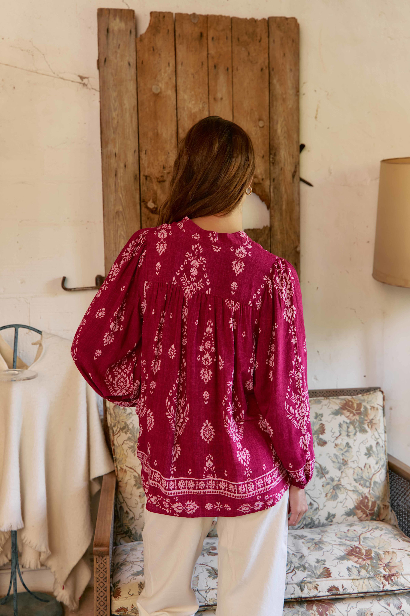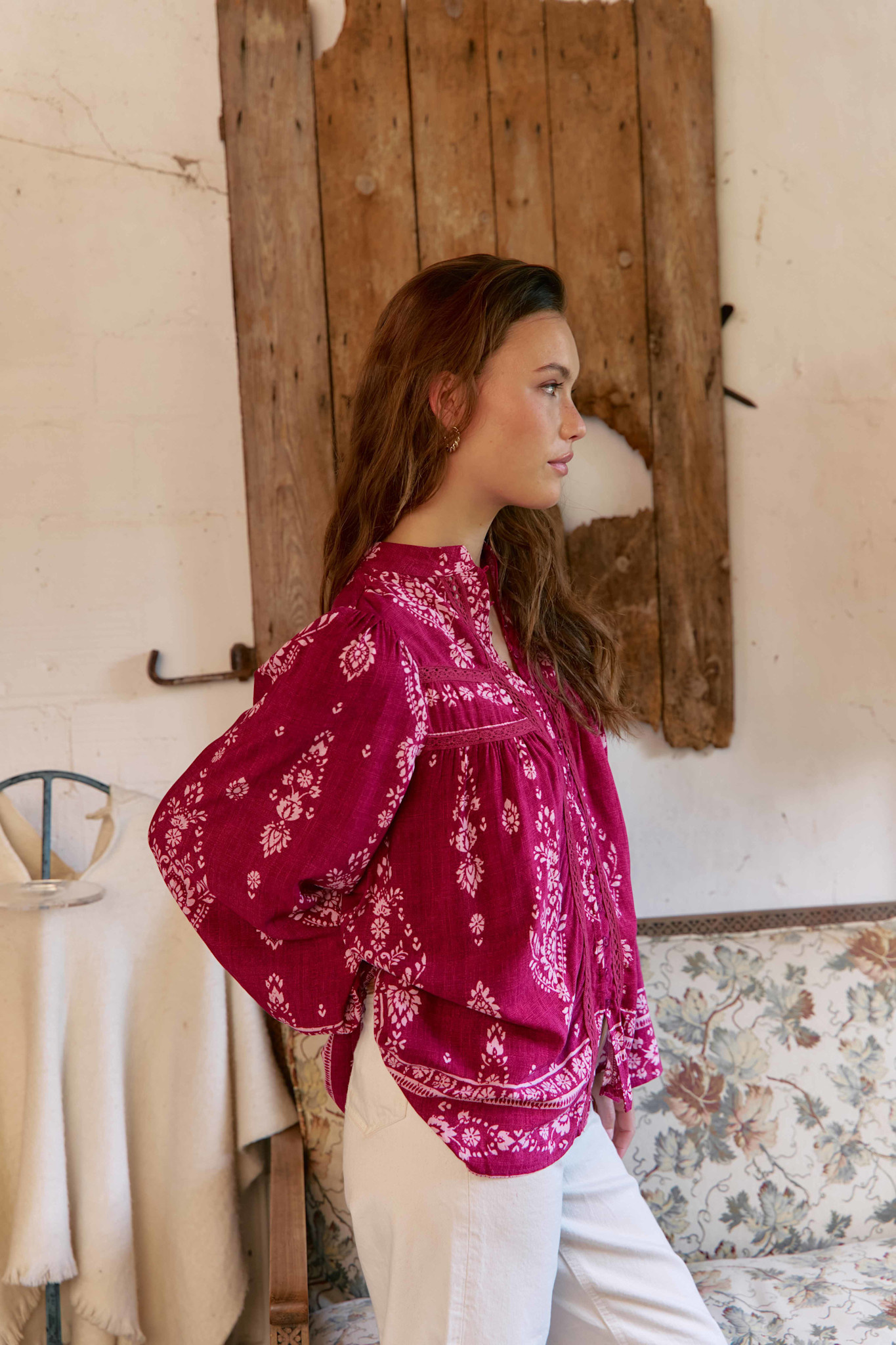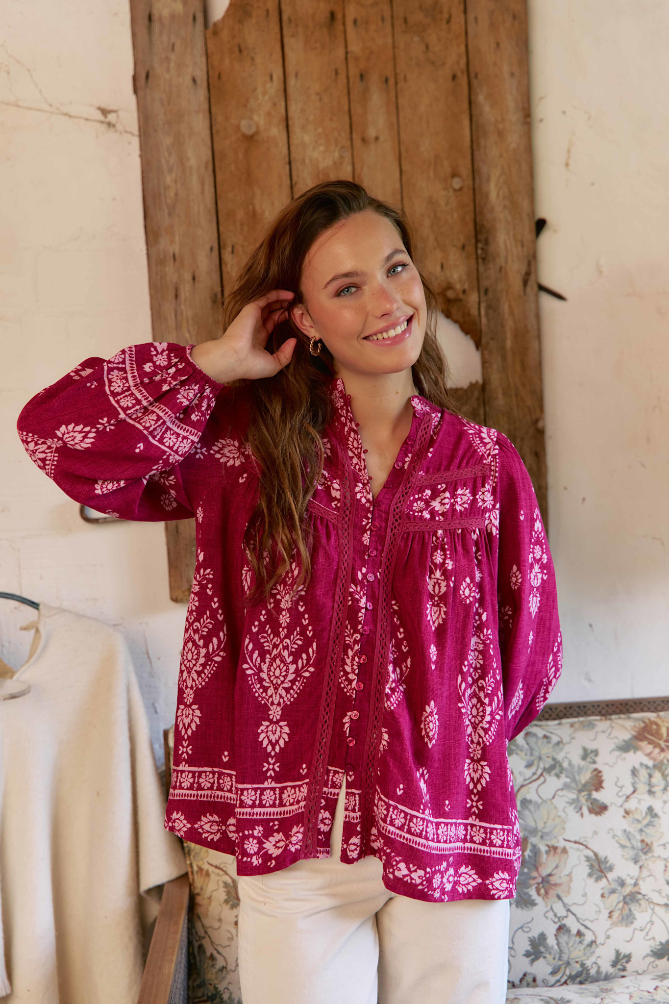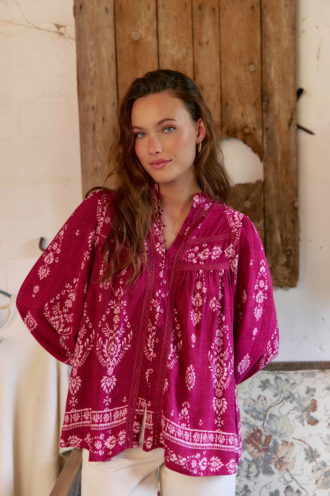 De blouse Rhubarb Bree van het merk Jaase is een losvallende blouse met een opstaand boordje. De blouse heeft een mooie roodpaarse kleur en is afgewerkt met opengewerkte borduursels.
