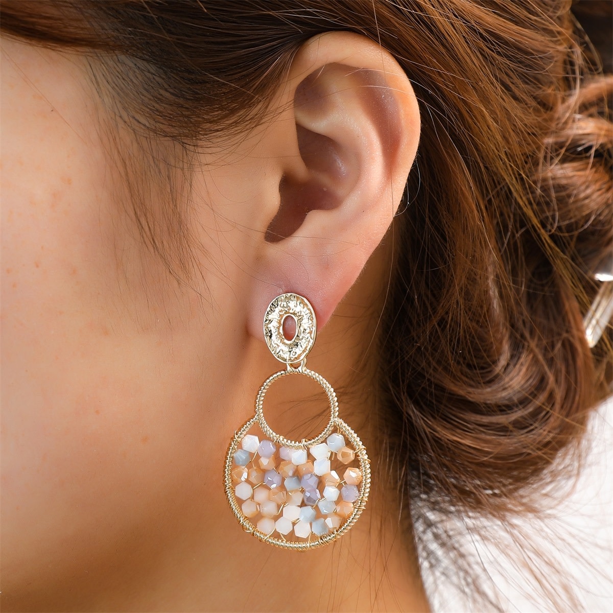 Oorhangers met kralen in blauw- en beigetinten. De combinatie van kleuren geeft deze oorbellen een speels detail dat makkelijk te combineren is. De lengte is 50mm en de breedte is 29mm.