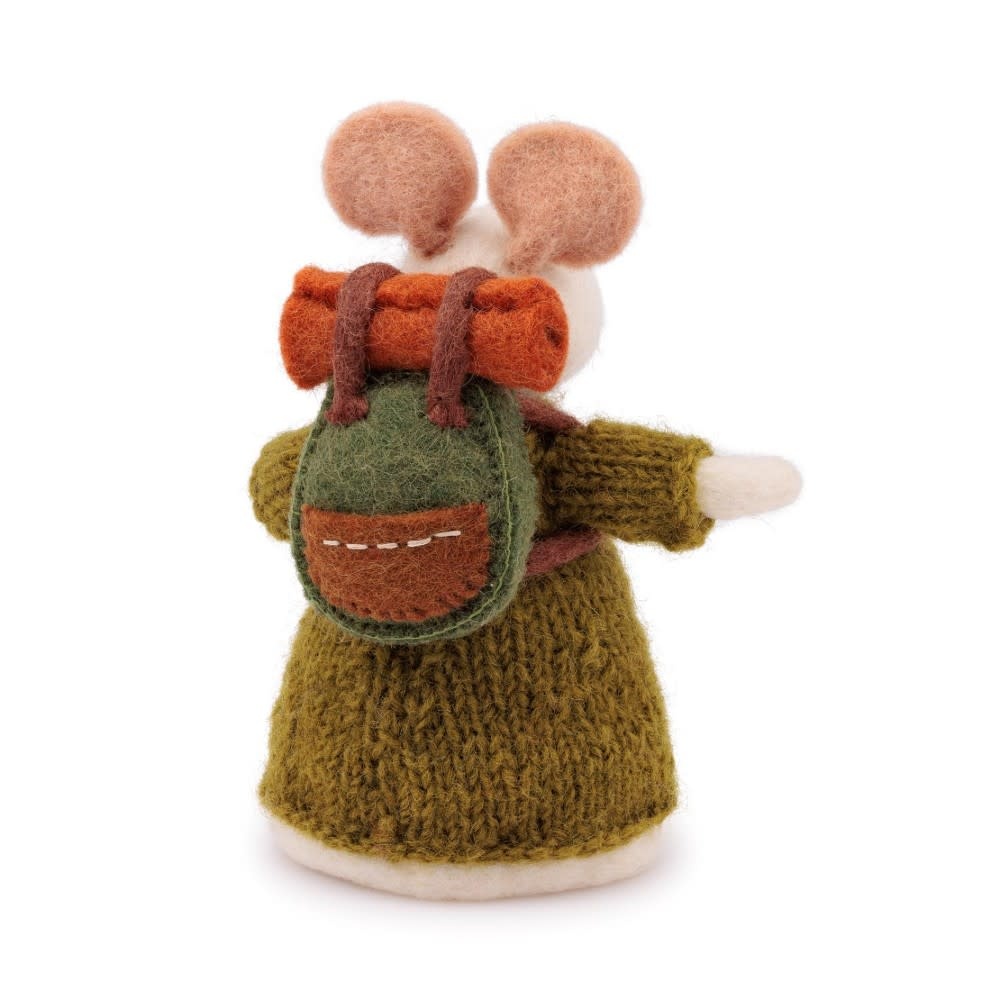 Vilten wandelmuis met lichtgroene gebreide trui en rugzak met oranje matje. Klaar voor avontuur in bos of bergen, een sfeervolle toevoeging aan je herfstdecoratie of cadeau voor avonturiers.