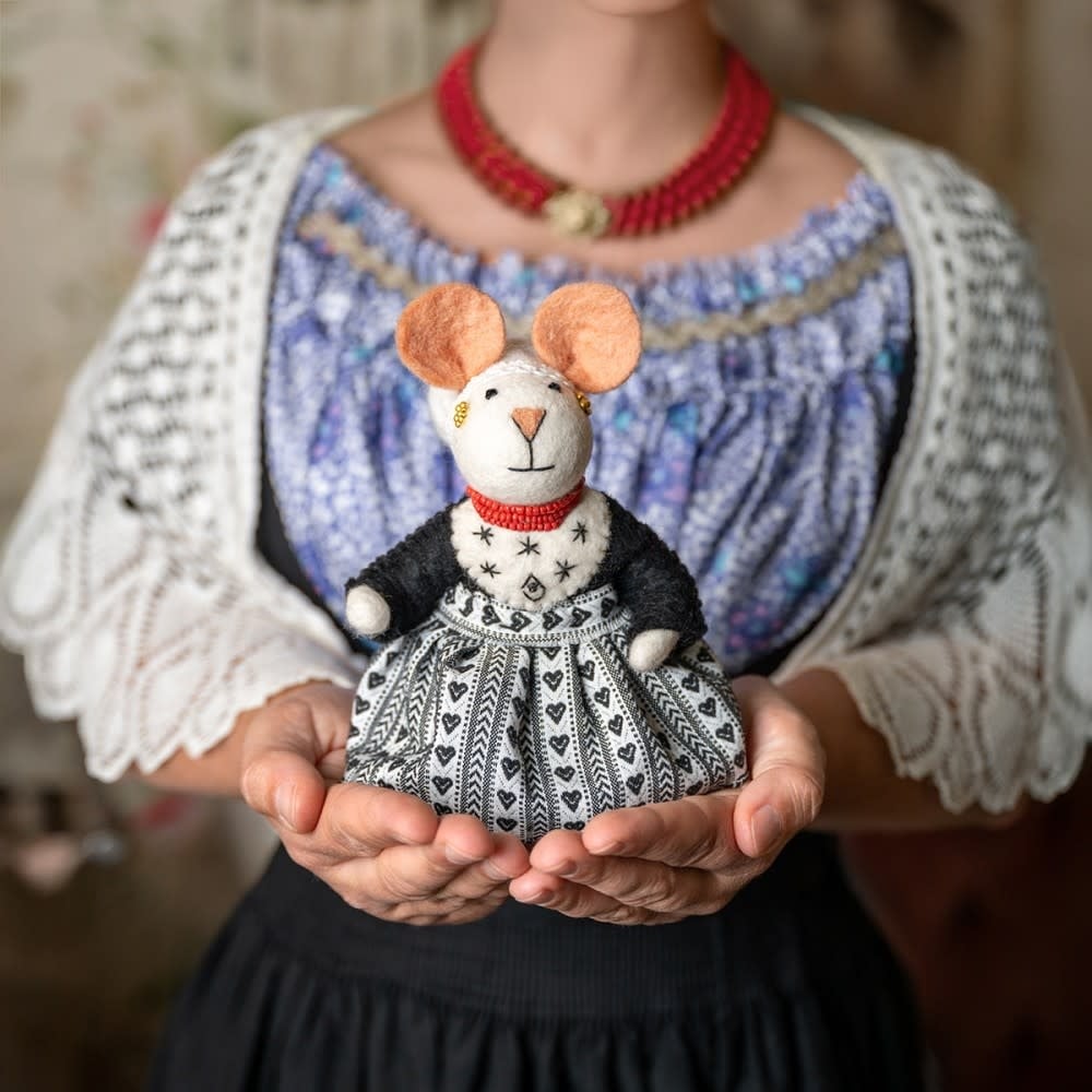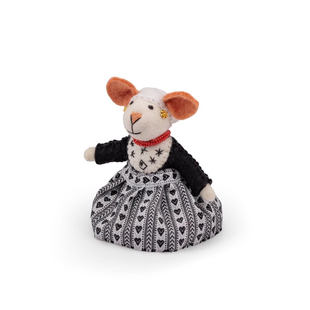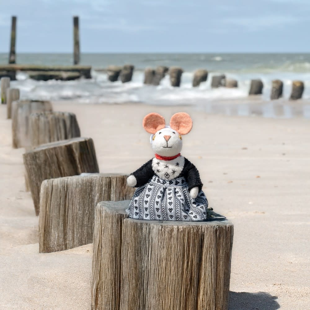 Zeeuws muisje van vilt in traditioneel kostuum. De prachtige details zoals het kralensnoer (in de echte klederdracht zijn dit bloedkoralen), kanten mutsje en zwartwit zeeuws schortenbont geven haar een unieke uitstraling. Een ode aan Zeeland, perfect als decoratief cadeau of verzamelitem.