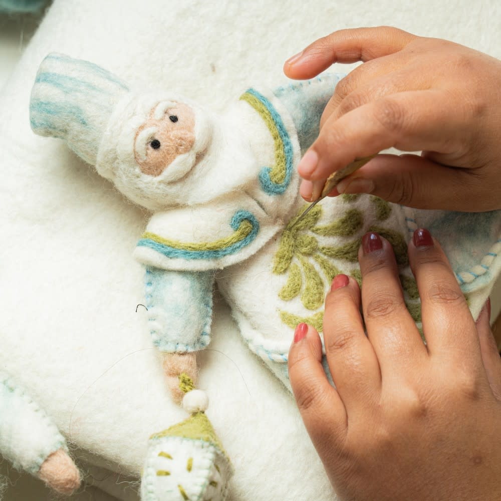 Vilten winterkoning in zachte groen- en wittinten, met verfijnde details en lantaarn in de hand. Een sfeervolle toevoeging die warmte en karakter aan je winterdecor geeft.