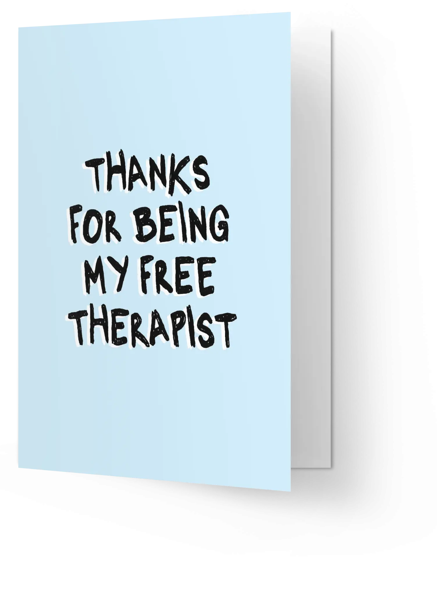 Geef dit jaar eens een leuk kaartje aan je vrienden. Zeg het met een originele kaart. Thanks for being my free therapist. Verras iemand met deze wenskaart. Lees meer