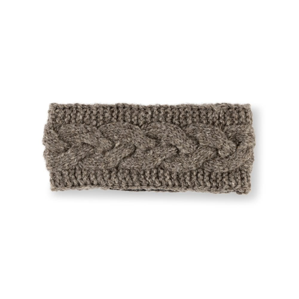 Gebreide haarband met kabelpatroon in de kleur taupe. Van wol, gevoerd met fleece. One size fits all.