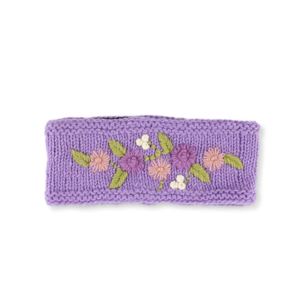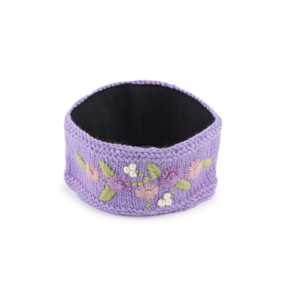 Gebreide wollen haarband uit Nepal in de kleur lila met daarop geborduurde bloemen in rozetinten. Het patroon is hetzelfde als onze handwarmers, dus heel mooi te matchen! Van wol, gevoerd met fleece. One size fits all.