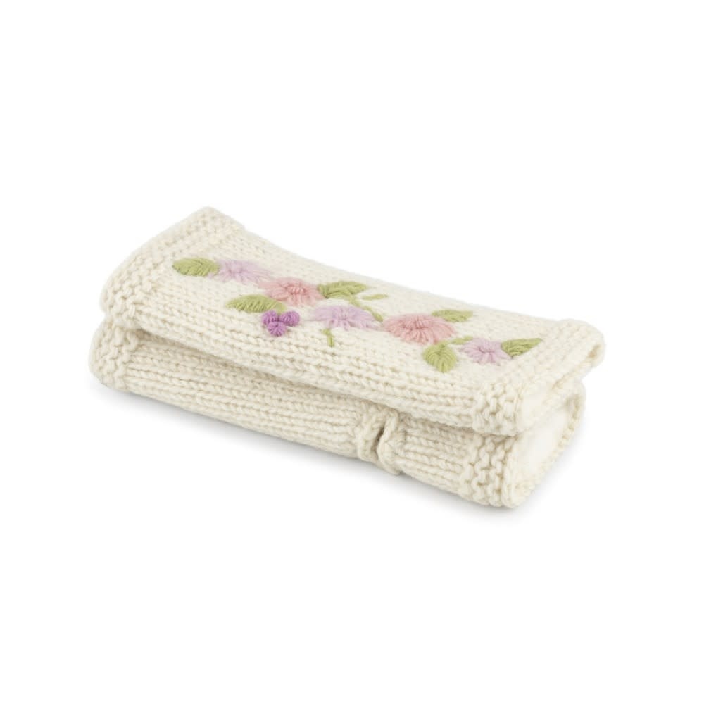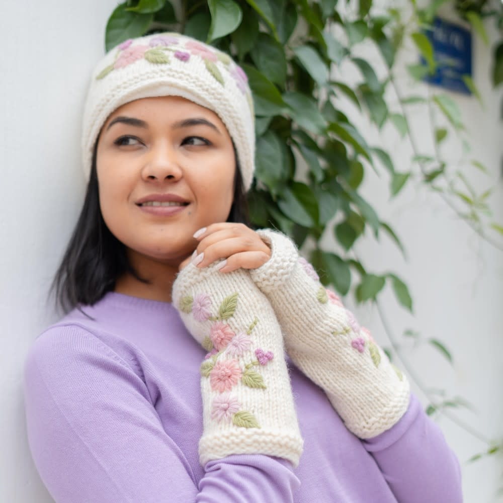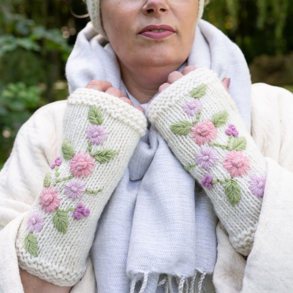 Gebreide wollen handwarmers uit Nepal in de kleur crème met daarop geborduurde bloemen in rozetinten Lees meer