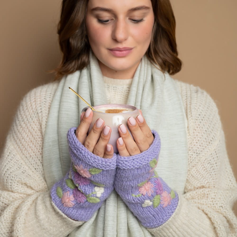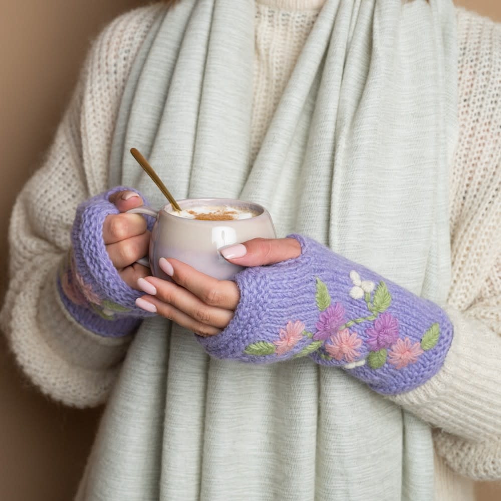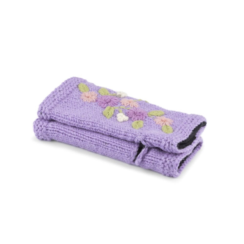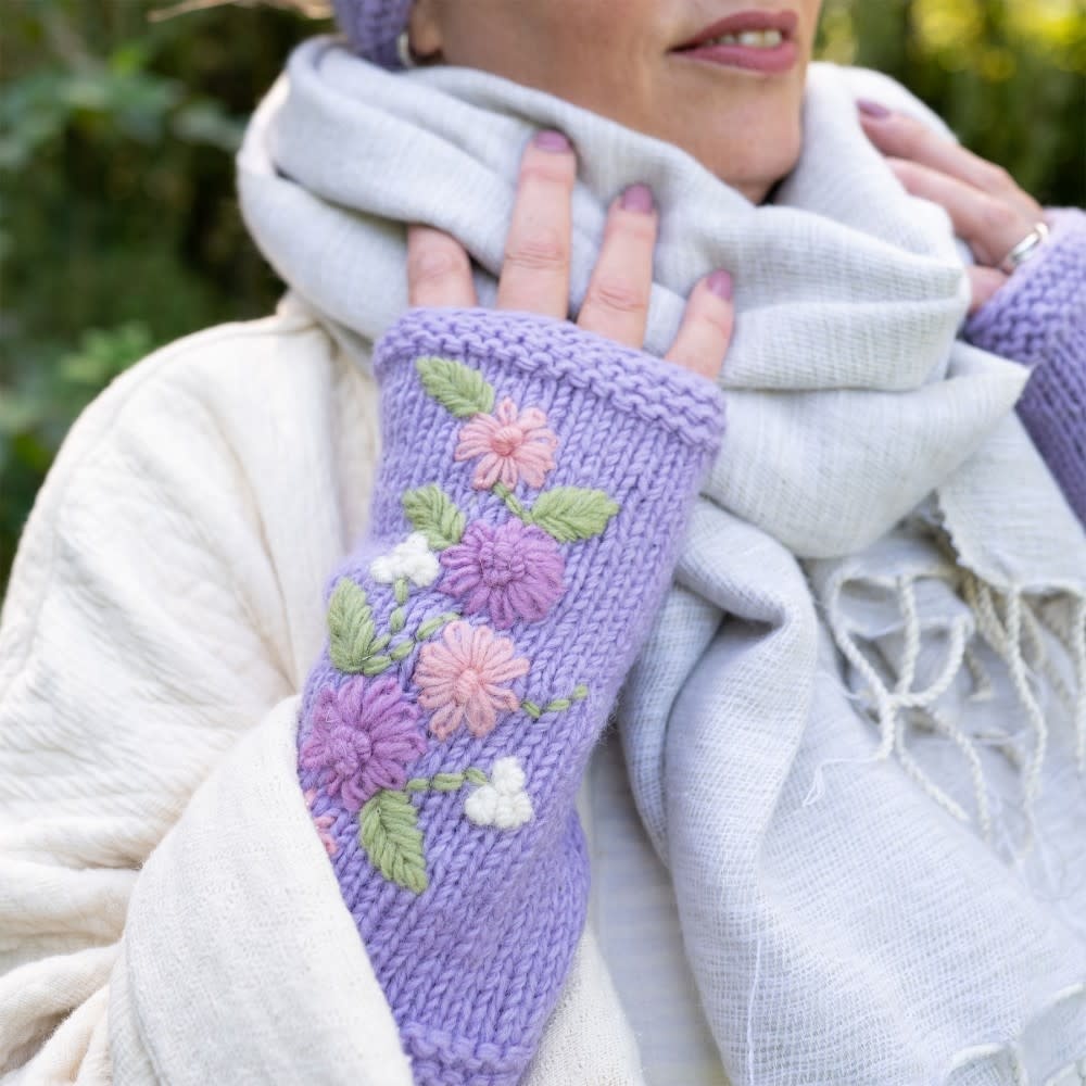 Gebreide wollen handwarmers uit Nepal in de kleur lila met daarop geborduurde bloemen in rozetinten. Lees meer