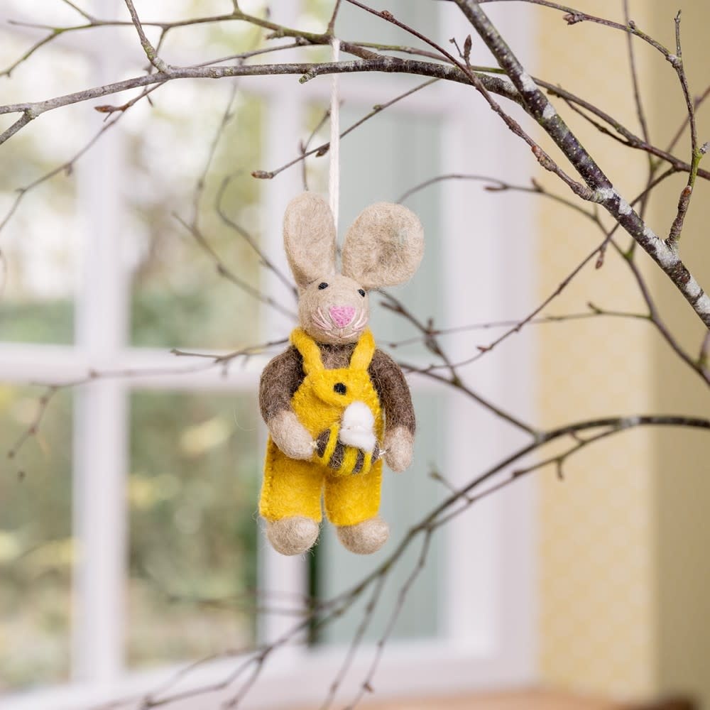 Met zijn felgele tuinbroek en een klein bijtje in zijn pootjes is deze imker een knipoog naar de wereld van de bijen. Voorzien van een touwtje om op te hangen, een speelse decoratie voor liefhebbers van dieren en tuinleven.