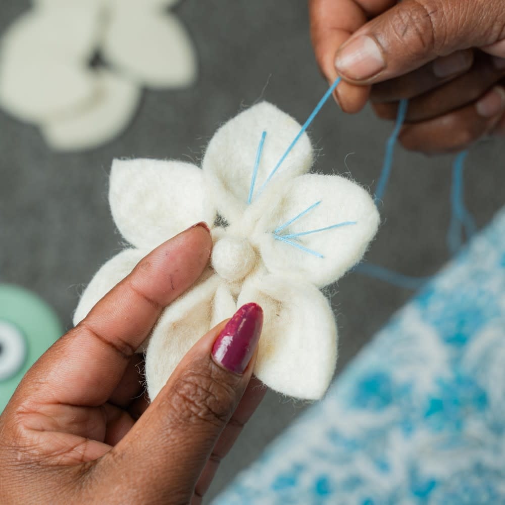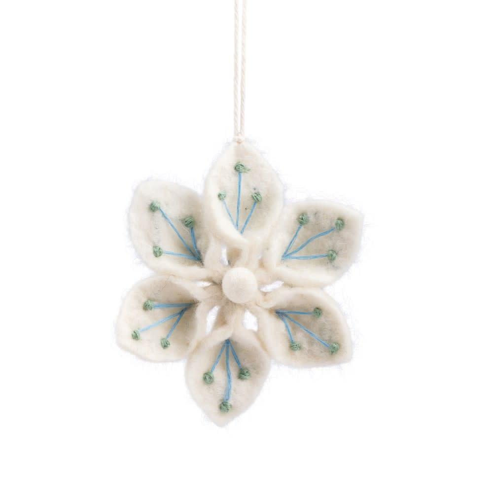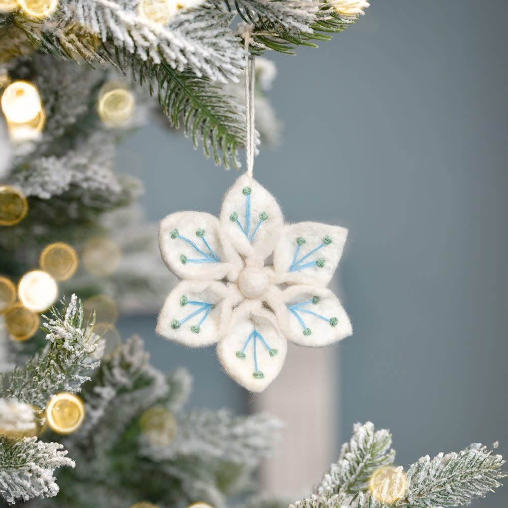 Een met de hand gevilte ijsbloem met subtiele borduurdetails in blauw en groen. Deze sierlijke hanger brengt een vleugje wintermagie in huis. Prachtig in de kerstboom of als decoratief accent aan een tak of krans. Mooi te combineren met andere vilten decoraties voor een sfeervol geheel.