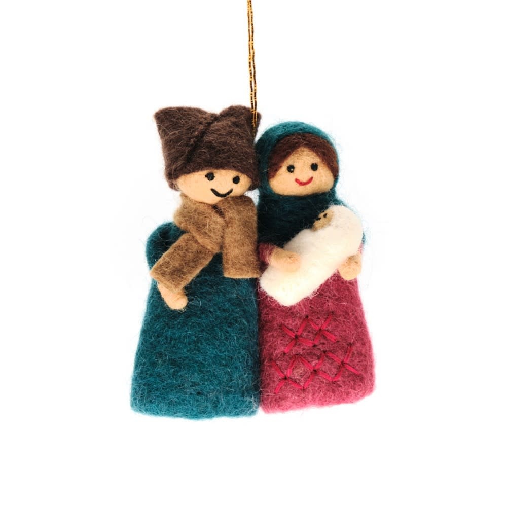 Jozef en Maria van vilt in kleur, met het kindje Jezus in hun armen, vormen een liefdevolle hanger voor in de kerstboom. Een symbool van verbondenheid en het kerstverhaal, en een sfeervolle toevoeging aan iedere winterse setting.