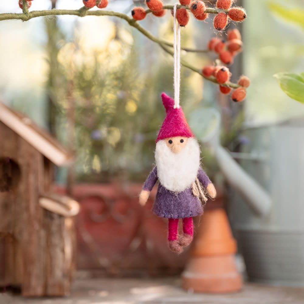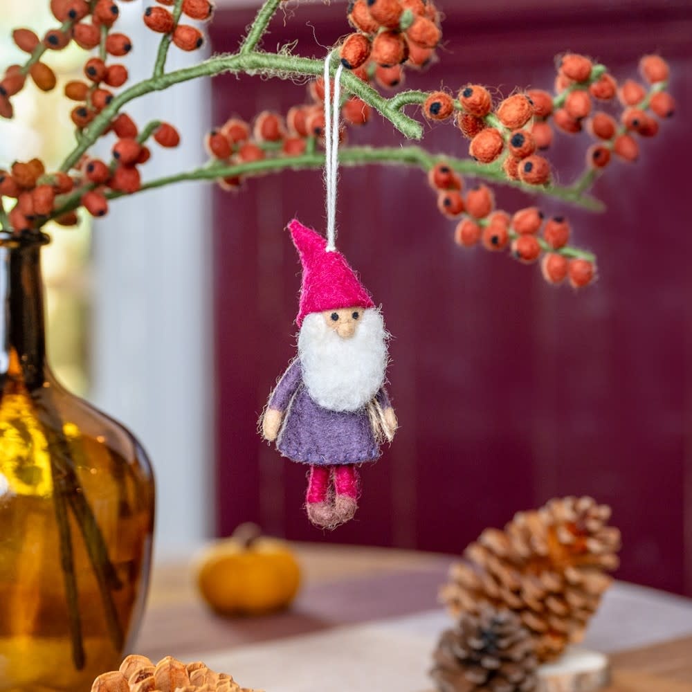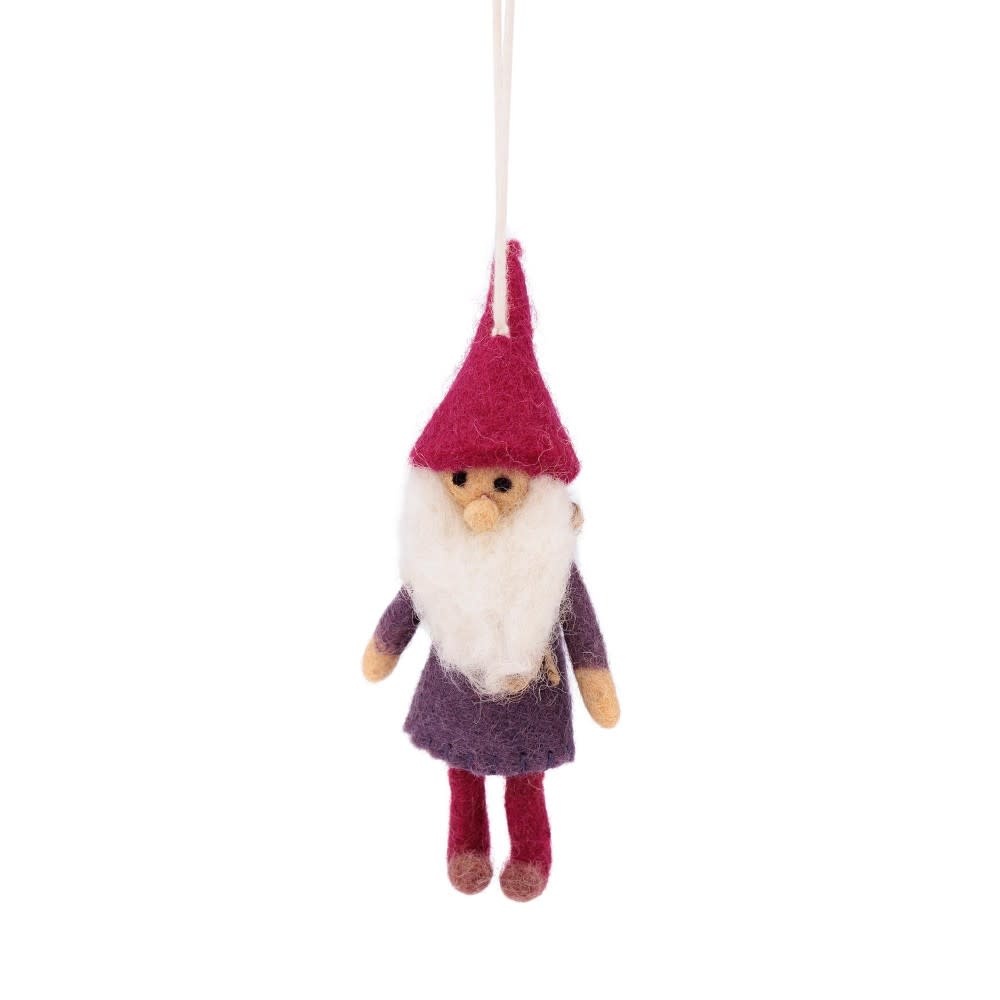 Een sfeervolle vilten kabouter met een paars jasje en een burgundy puntmuts. De warme kleuren en zachte materialen brengen direct gezelligheid in huis. Hang hem in de kerstboom, aan een decoratieve tak of geef hem een mooi plekje op de seizoentafel. Een charmante handgemaakte toevoeging aan je herfst- of kerstdecoratie.