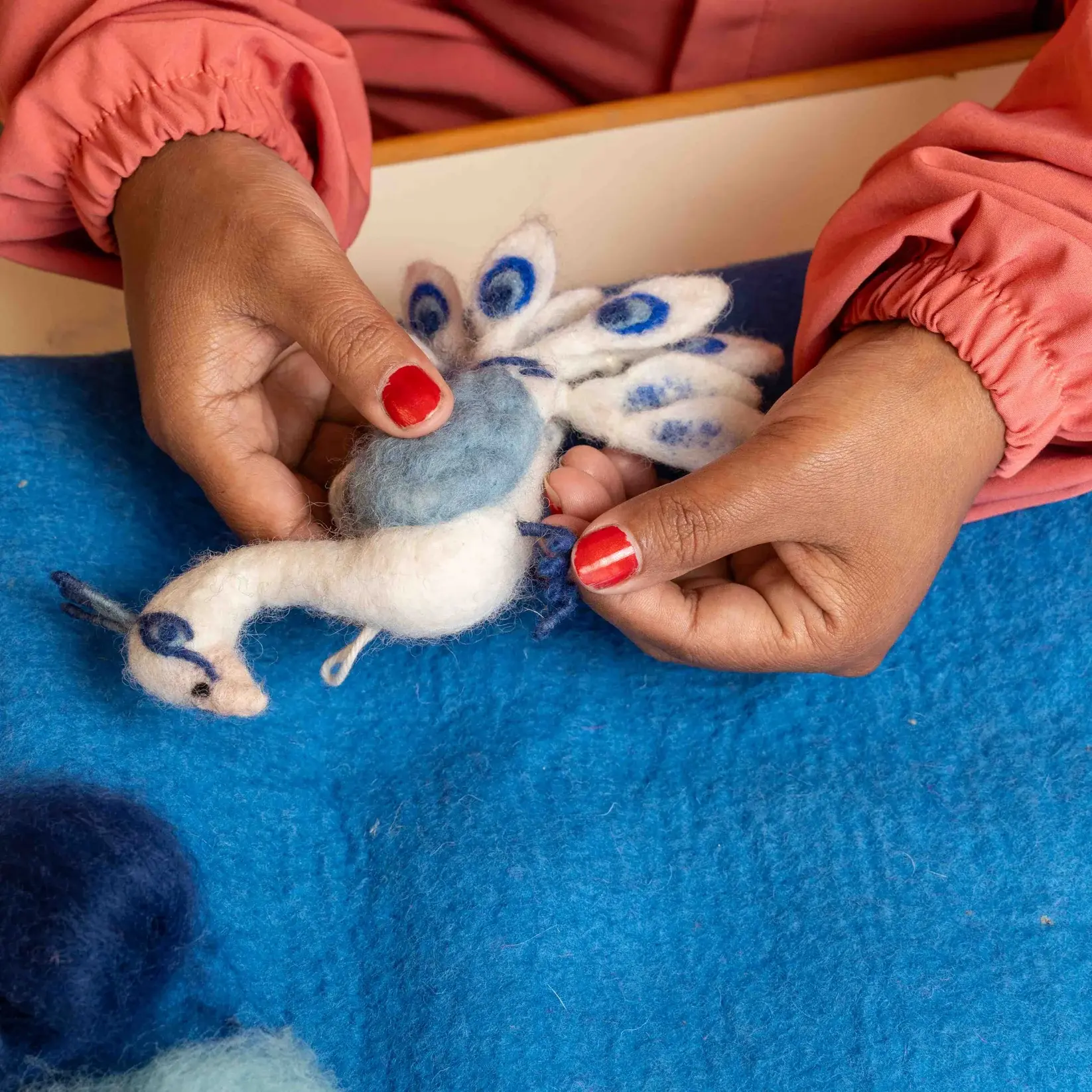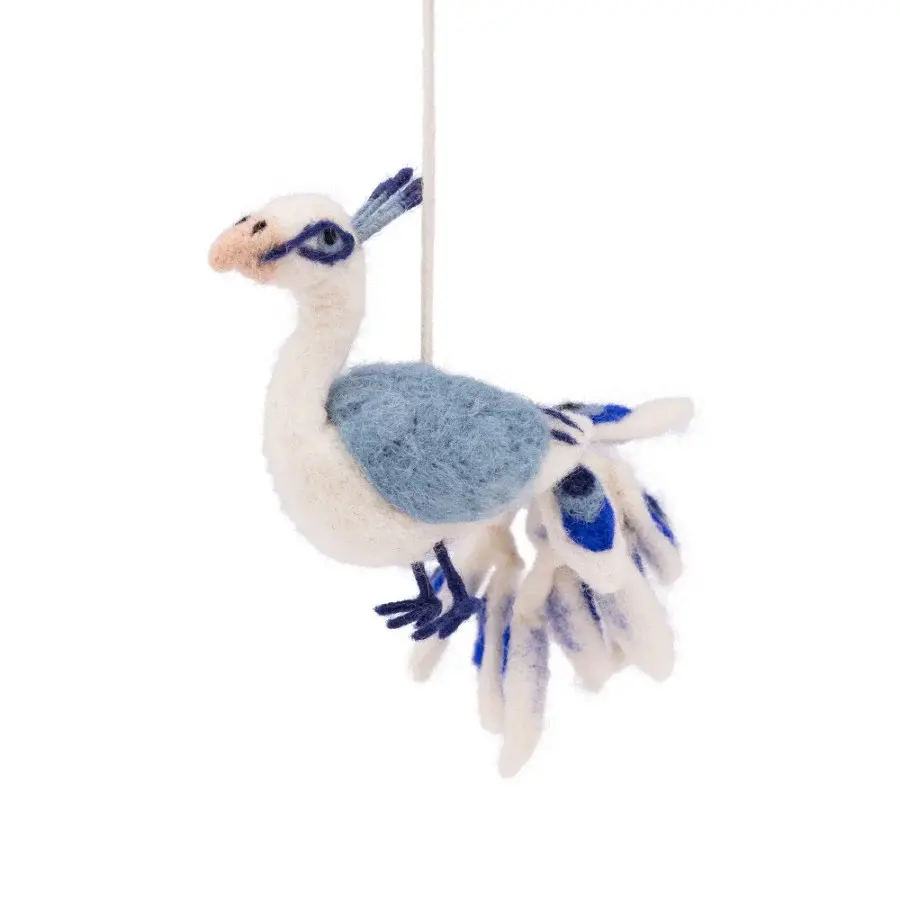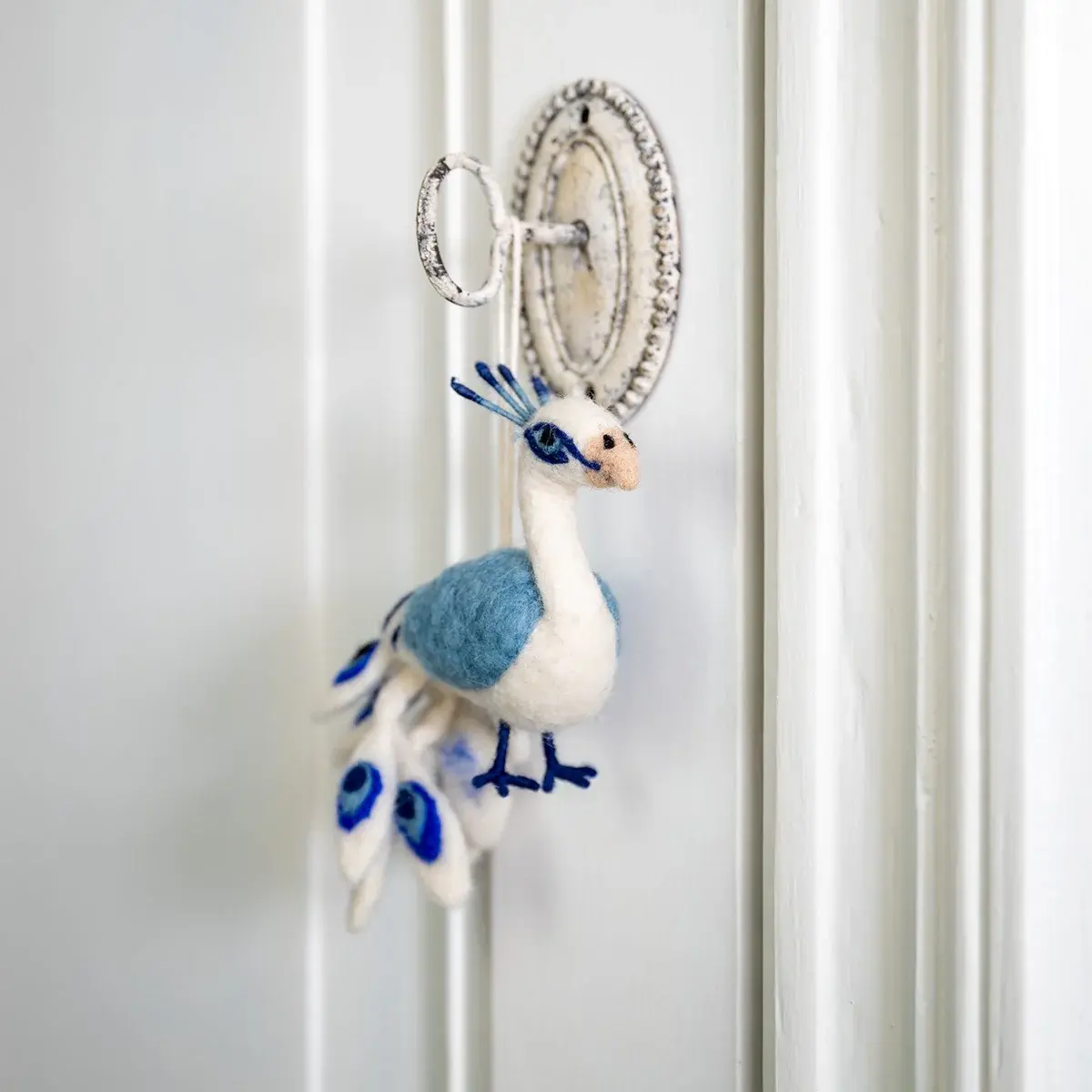 Deze Vilten Pauw in wit met Delfts blauw accenten is een sierlijke decoratie met gedetailleerde blauwe en lichtblauwe versieringen op veren, vleugels en staart. Hang haar aan een touwtje voor een opvallend en elegant interieurdetail.