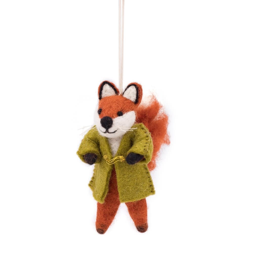 Vilten vos met lichtgroene jas in frisse, natuurlijke tint. Het oranje vachtje en de zachte jas vormen een vrolijk accent aan takken, slingers of wanddecoratie
