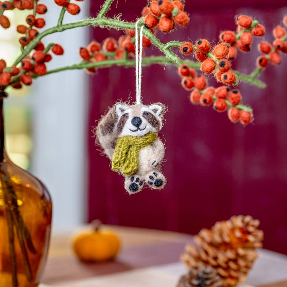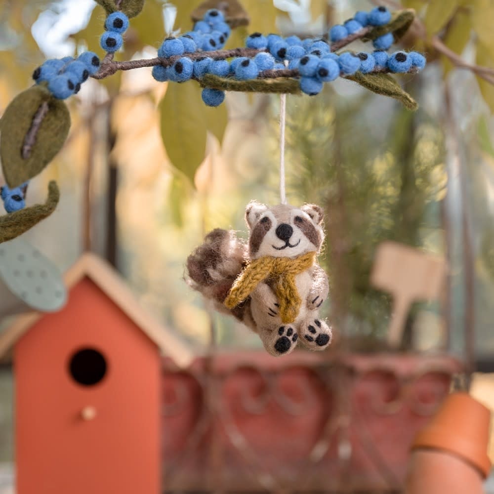 Vilten wasbeer met lichtgroene sjaal en pluizige staart. Zijn vriendelijke glimlach en zachte kleuren maken hem een gezellige toevoeging aan je herfstdecoratie.
