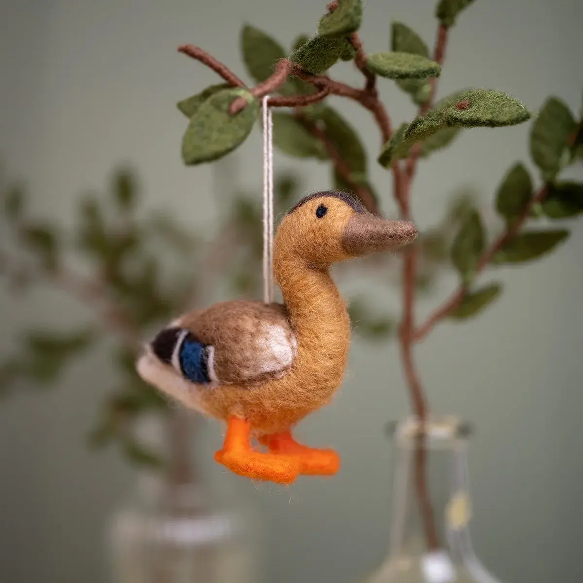 Deze vilten hanger in de vorm van een wilde eend heeft een rustige, zachte uitstraling met herkenbare kleuren en fijne details. Mooi in een paastak, aan een tak in de winkel of als subtiel accent in een presentatie. Ook leuk als klein cadeautje met een knipoog naar het buitenleven.
