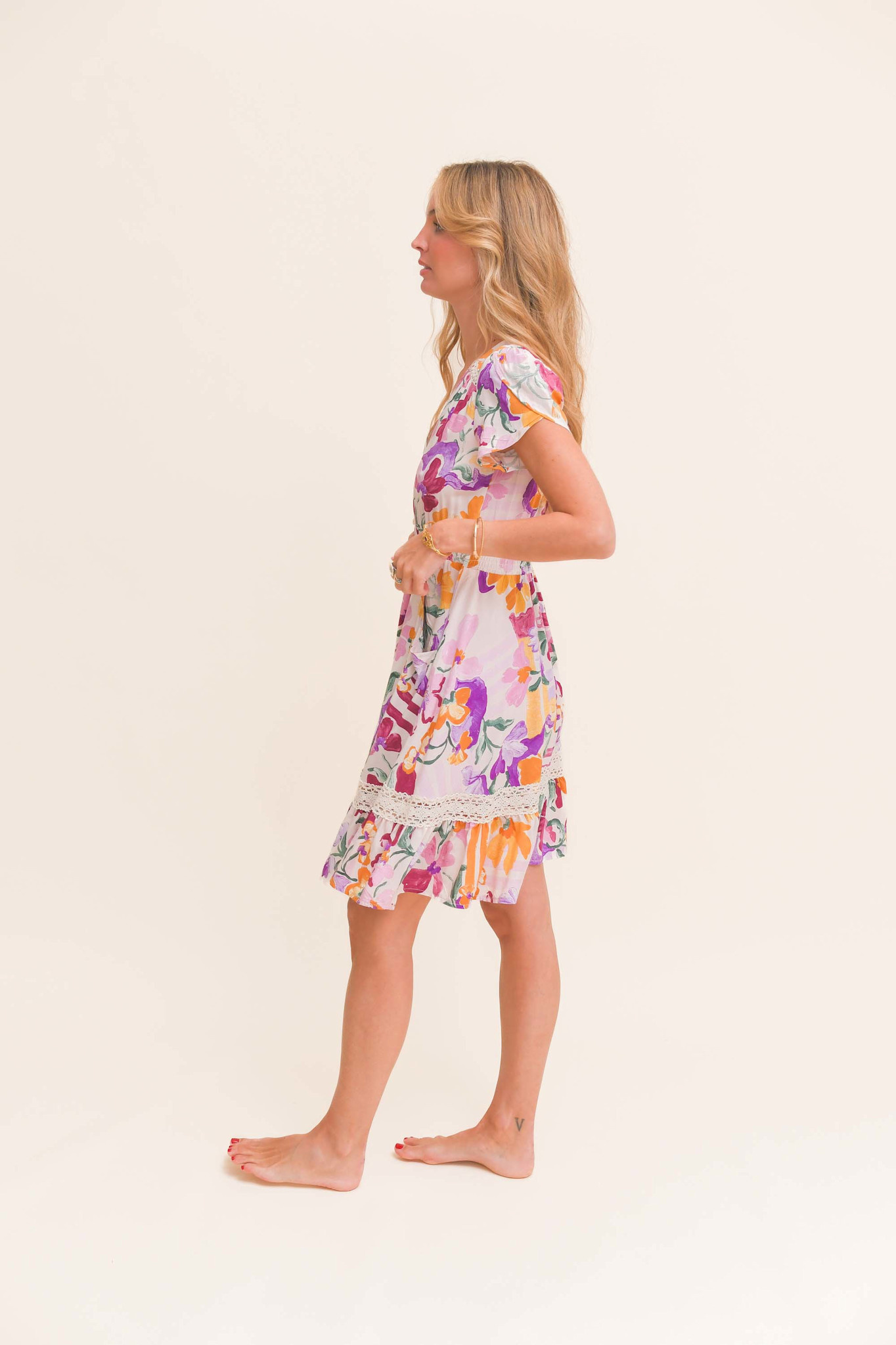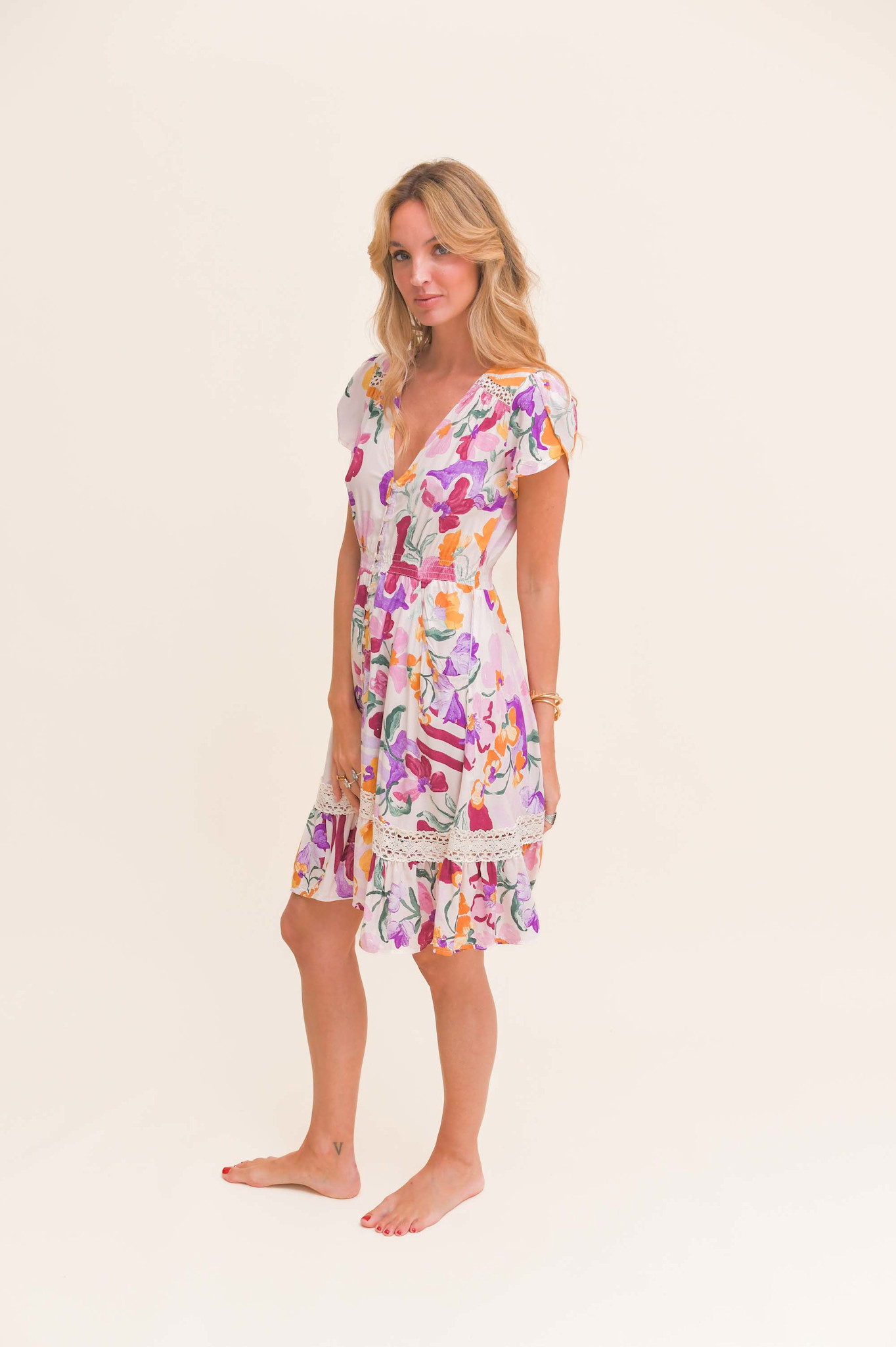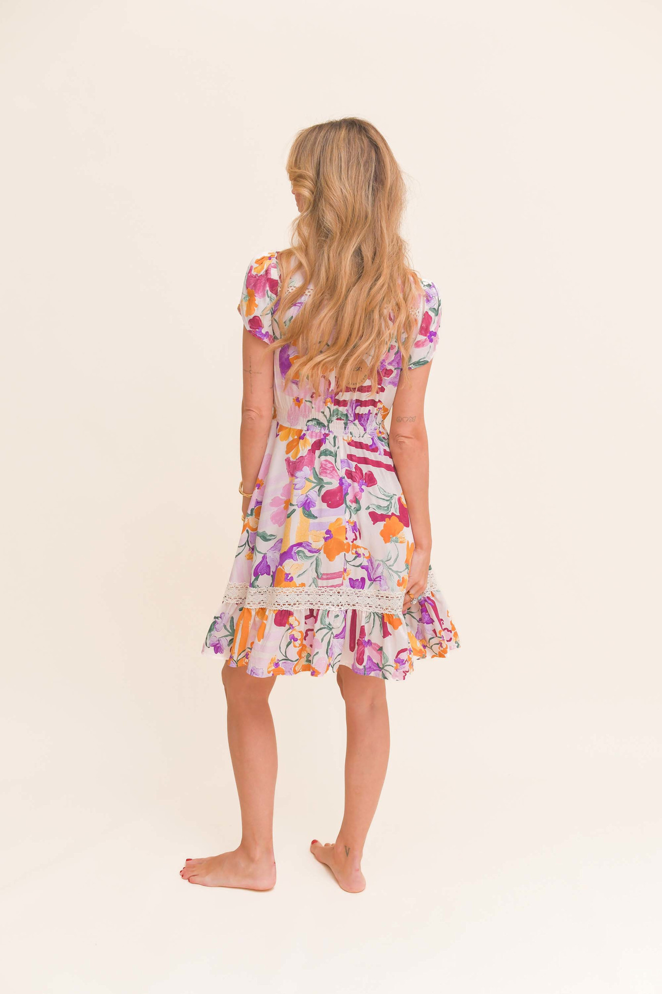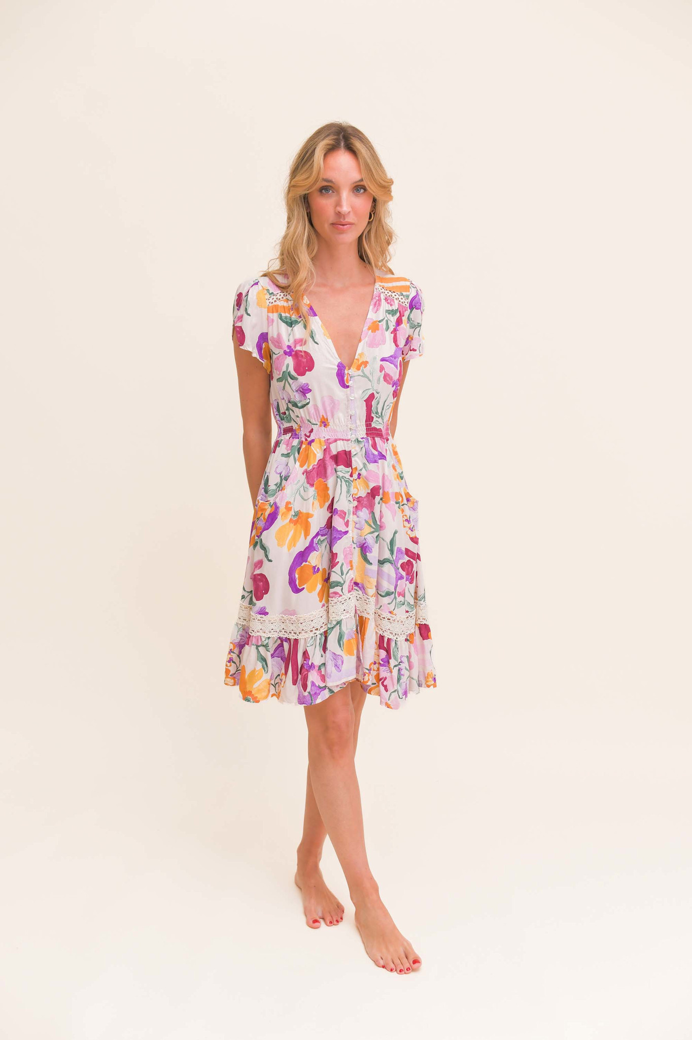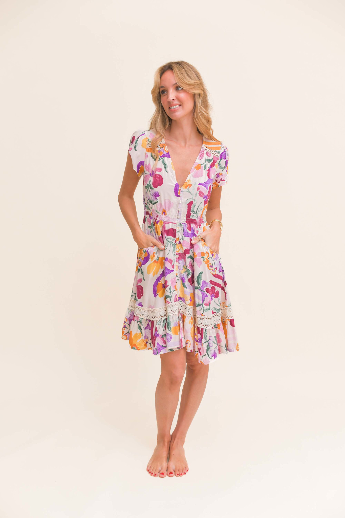 De korte jurk Sweet Lilly Carmen is een topper van het Australische merk Jaase. Een volledig doorgeknoopte korte jurk met een warme zomerse print. De jurk heeft een v-hals en een smalle gesmokte band in de taille. De jurk heeft korte mouwen en steekzakken.