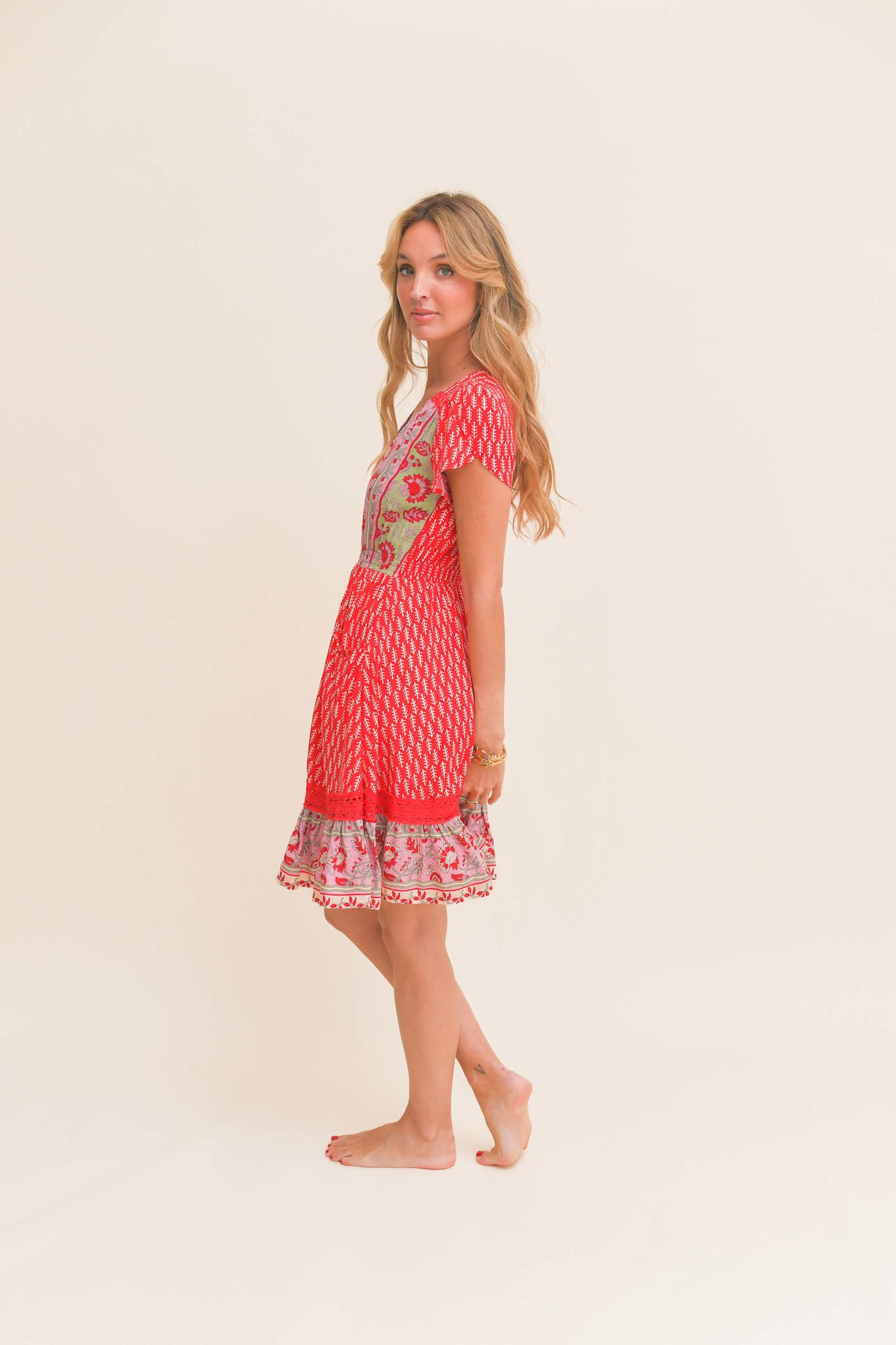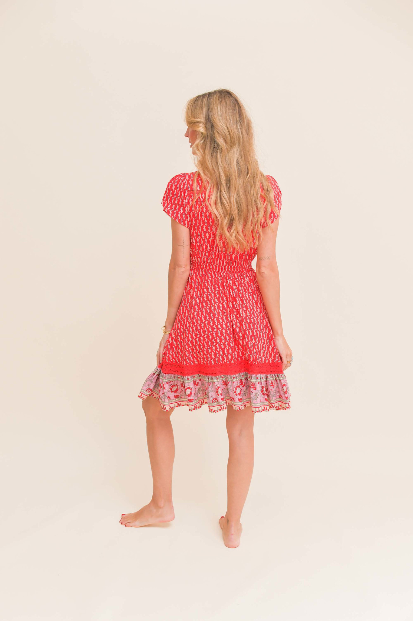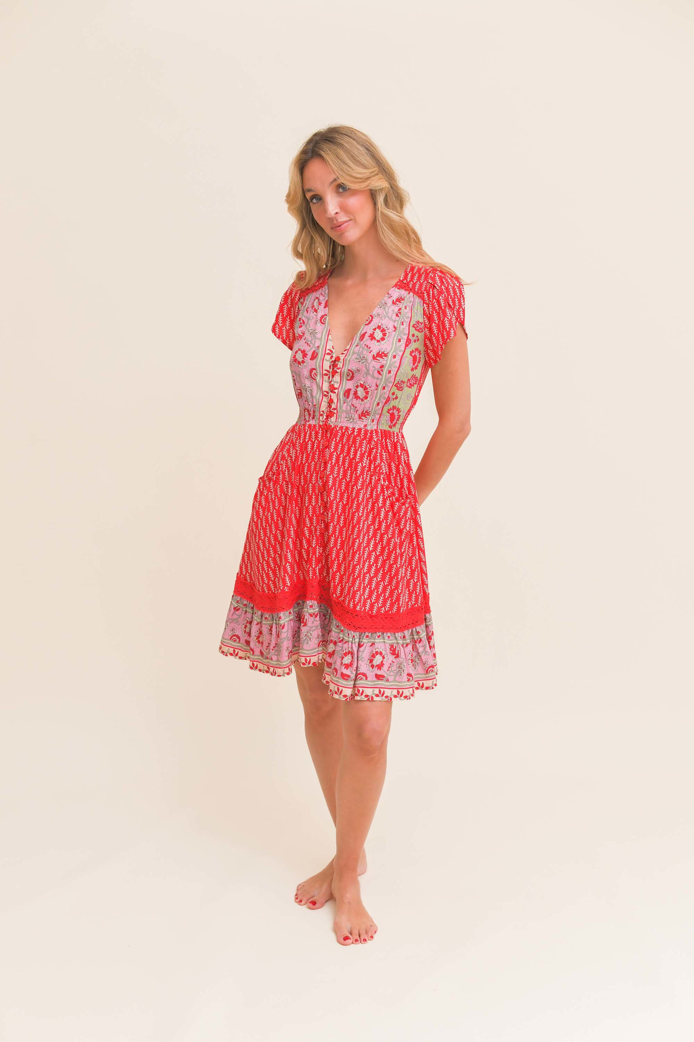 De korte jurk Zelie Carmen is een topper van het Australische merk Jaase. Een volledig doorgeknoopte korte jurk met een warme zomerse print. De jurk heeft een v-hals en een smalle gesmokte band in de taille. De jurk heeft korte mouwen en steekzakken.