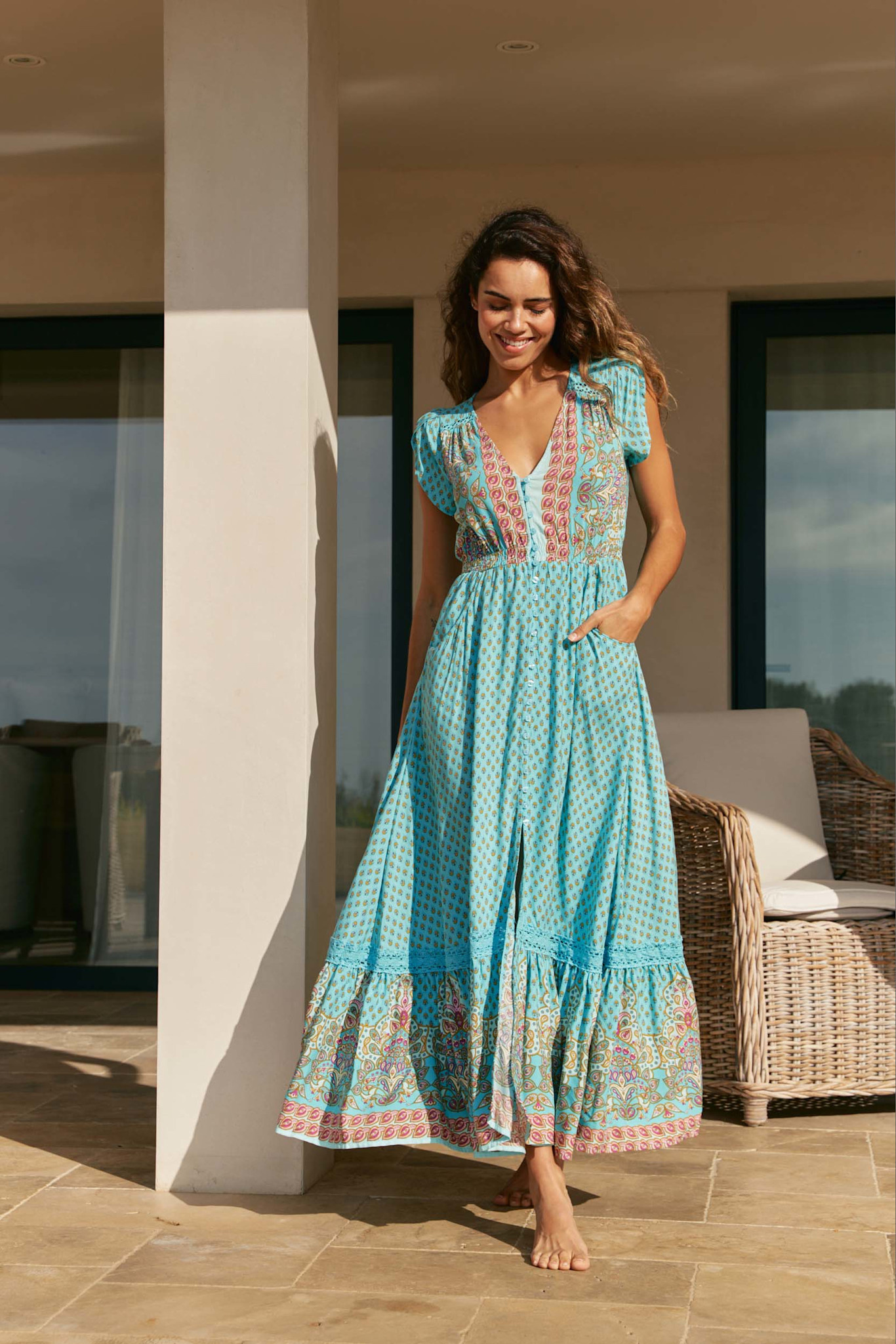 De lange jurk Atlantis Carmen is een topper van het Australische merk Jaase. Een volledig doorgeknoopte maxi jurk met blauwe print. De jurk heeft een v-hals en een smalle gesmokte band in de taille. De jurk heeft korte mouwen en steekzakken.