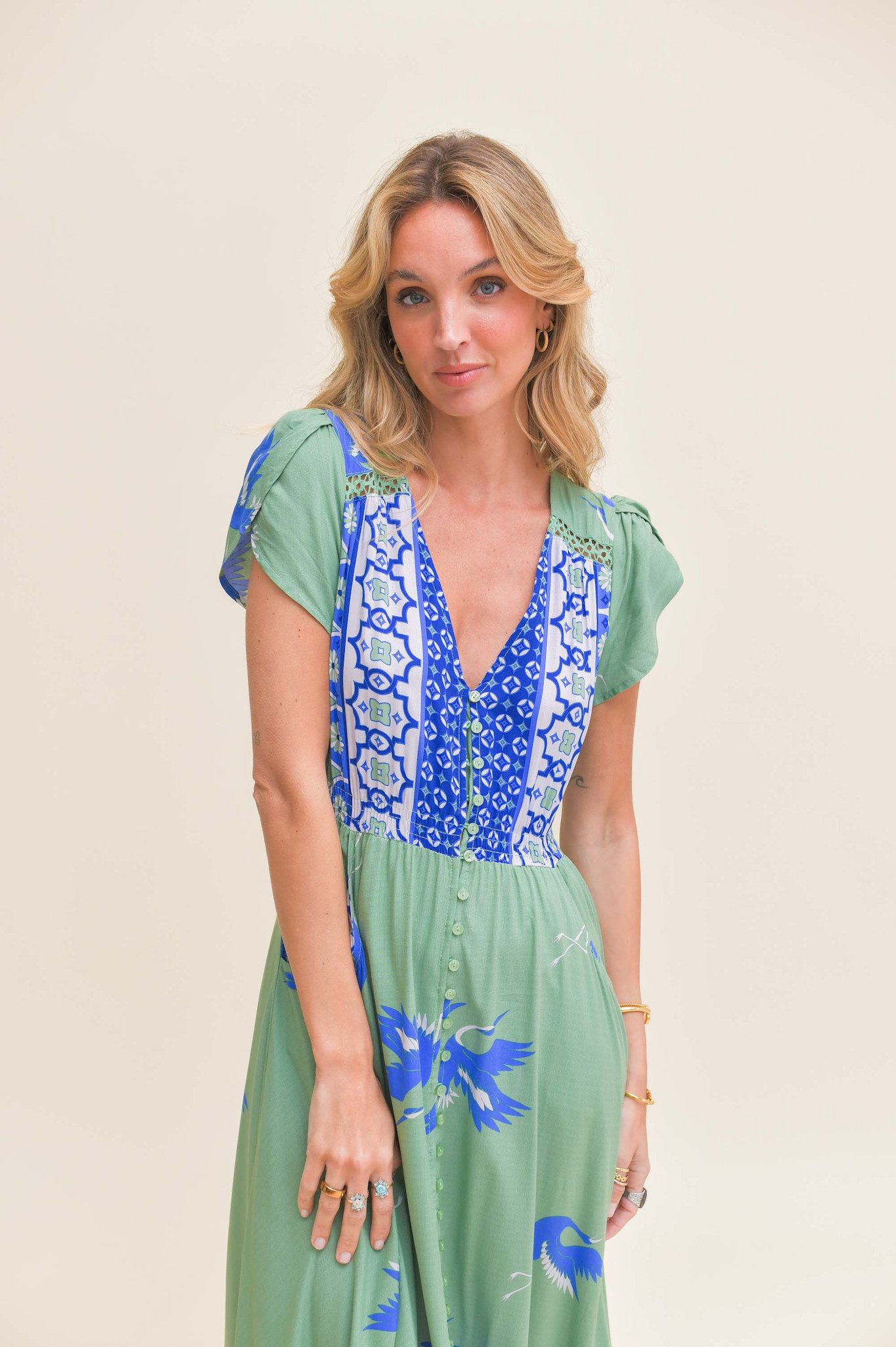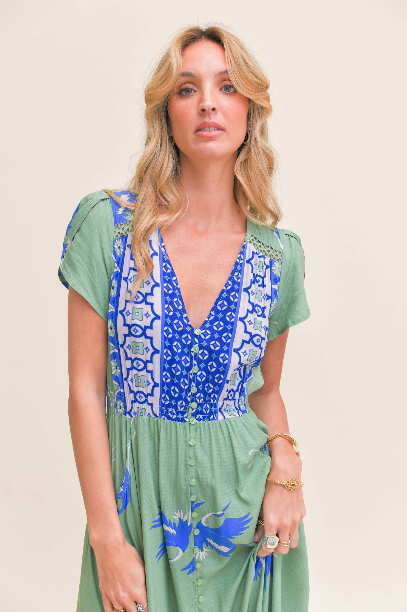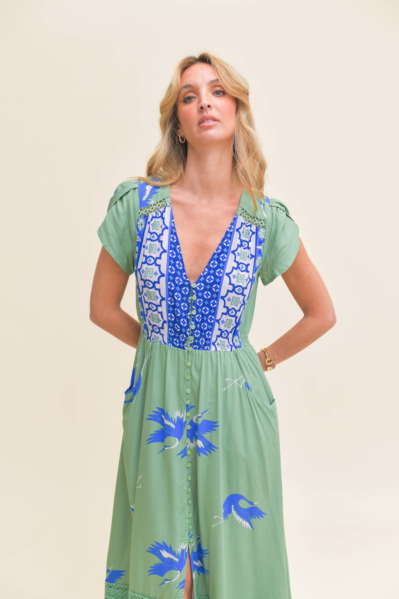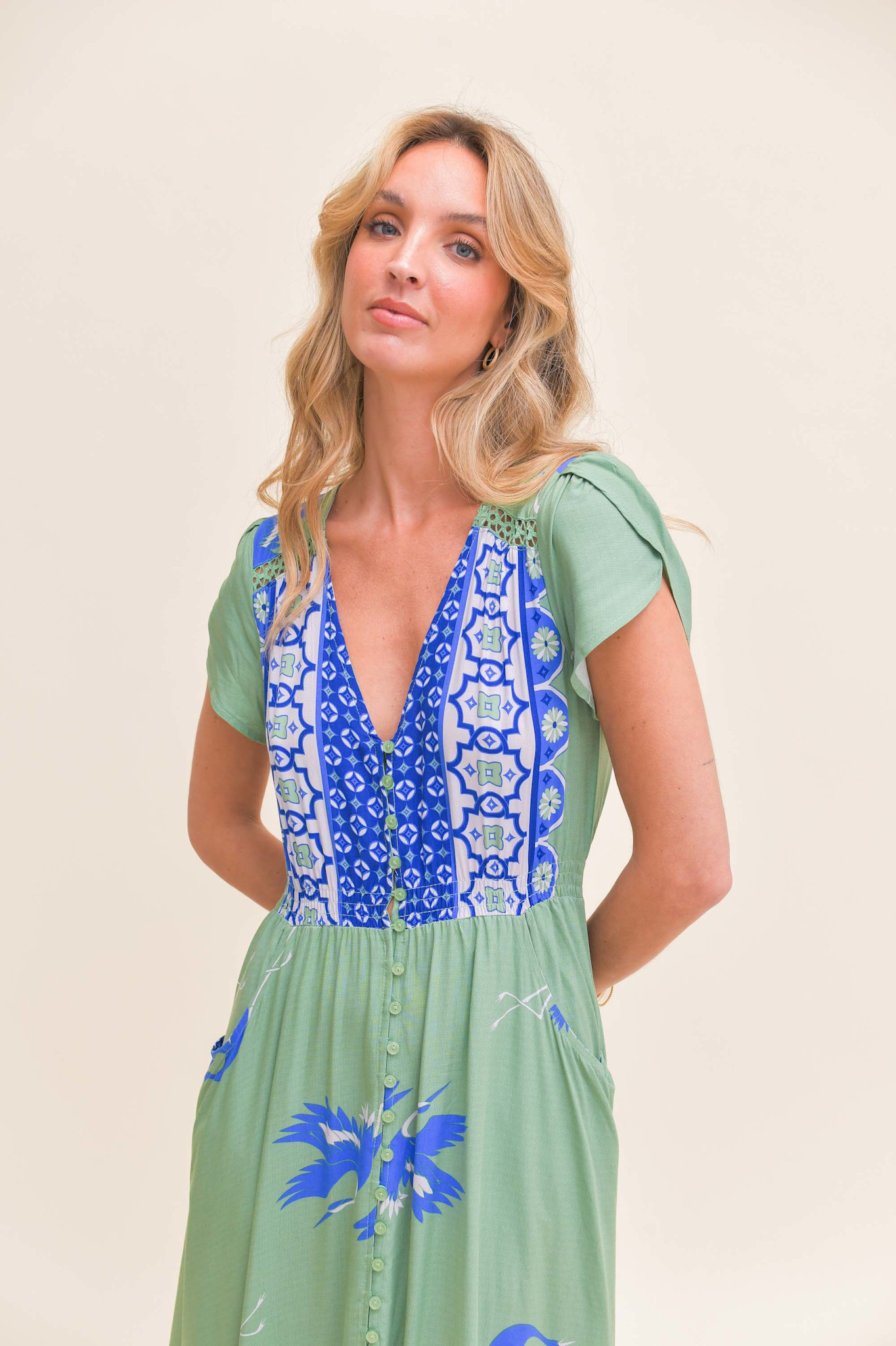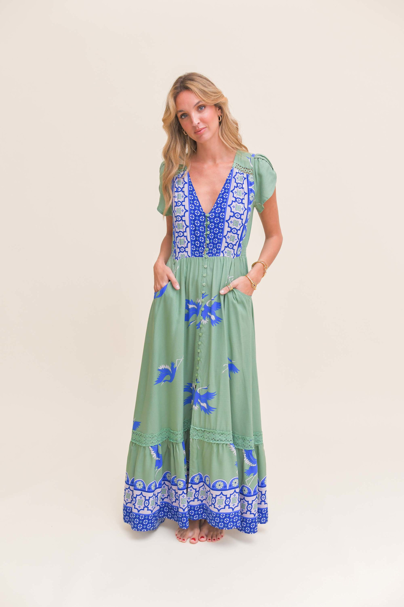 De lange jurk Blue Bird Carmen is een topper van het Australische merk Jaase. Een volledig doorgeknoopte maxi jurk met een warme zomerse print. De jurk heeft een v-hals en een smalle gesmokte band in de taille. De jurk heeft korte mouwen en steekzakken.