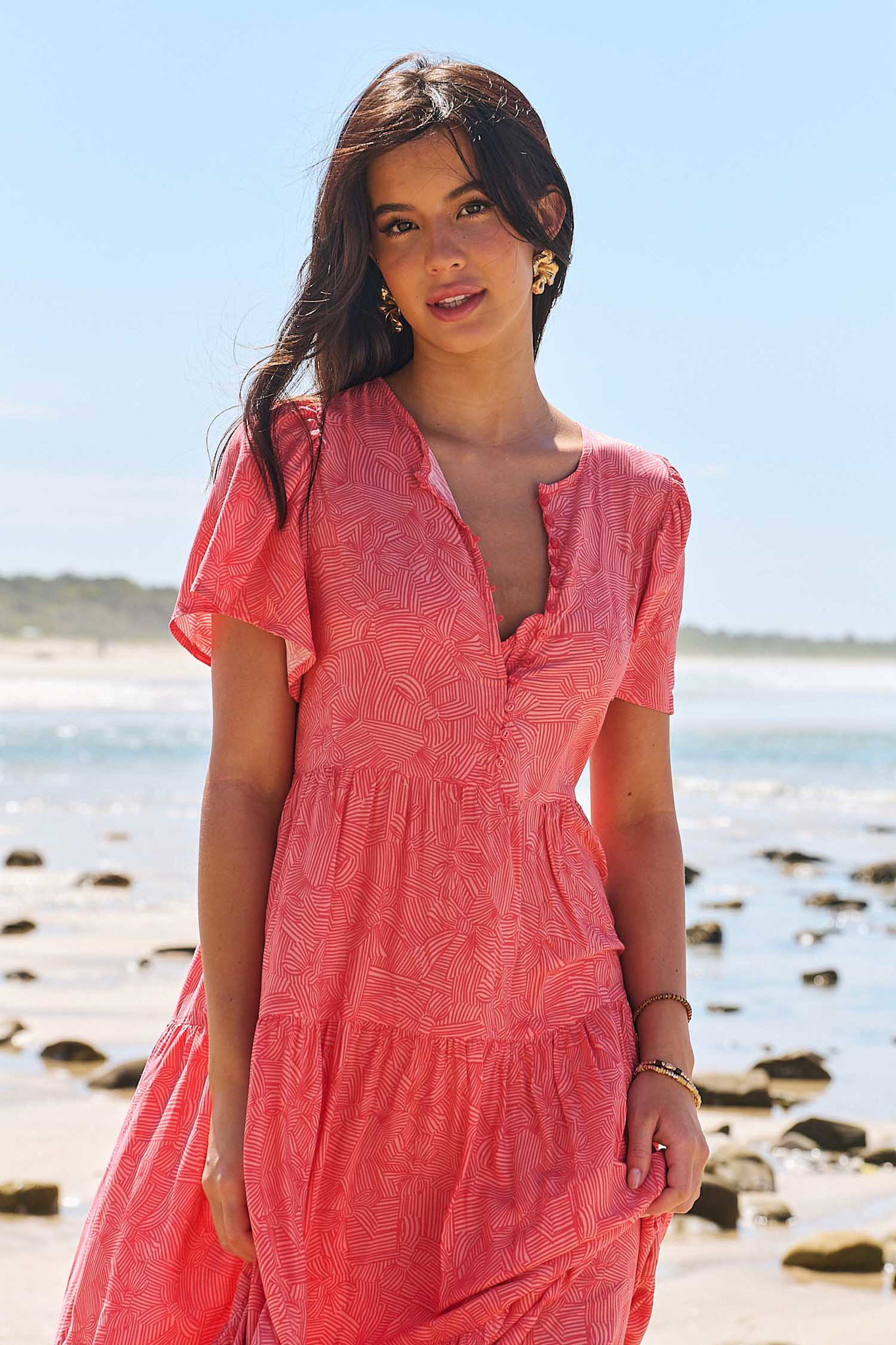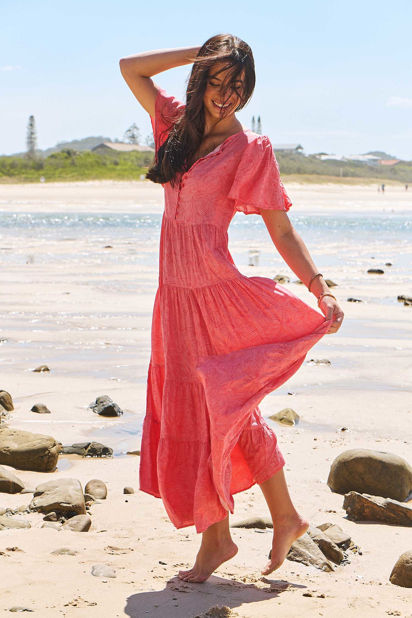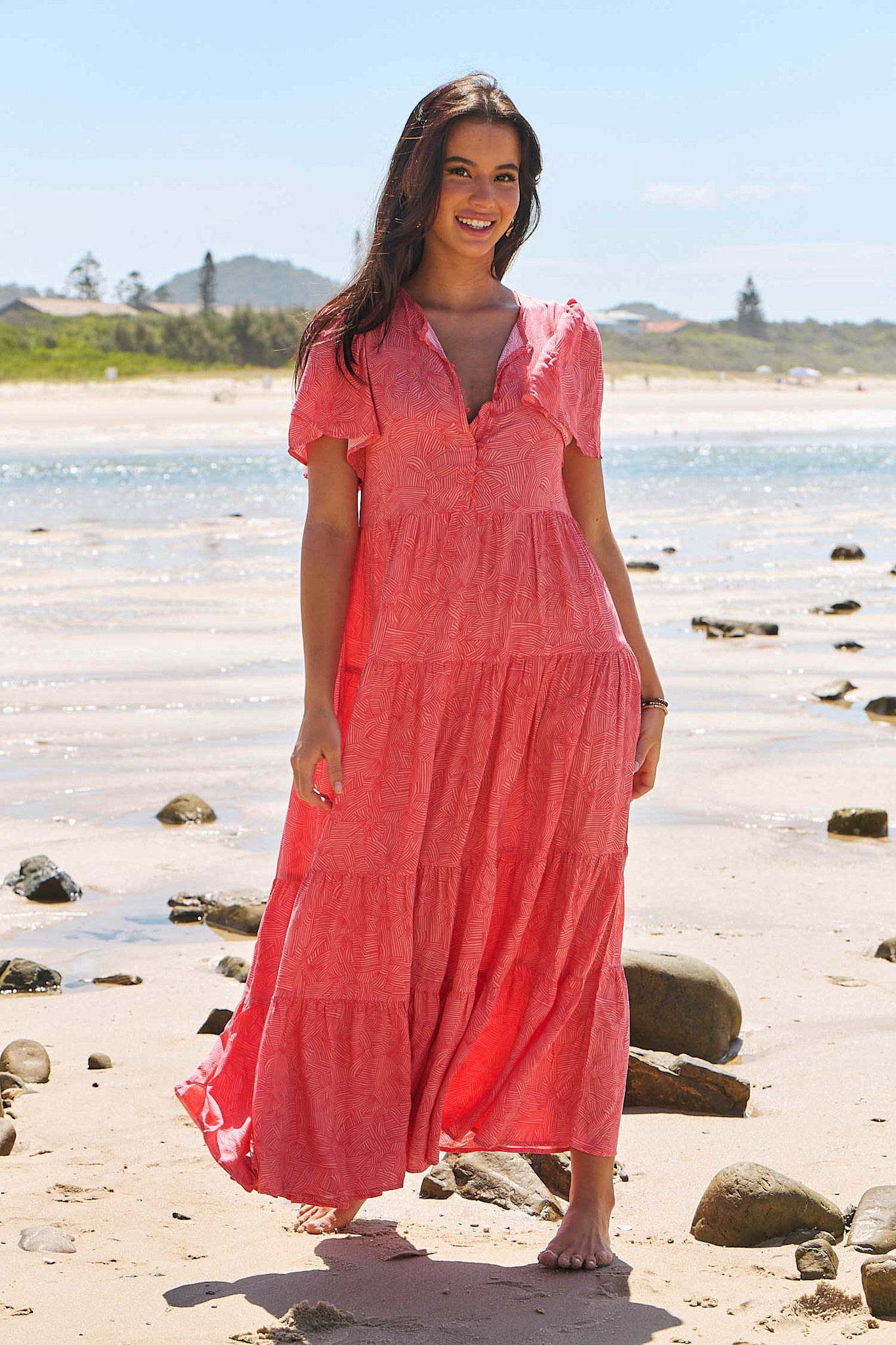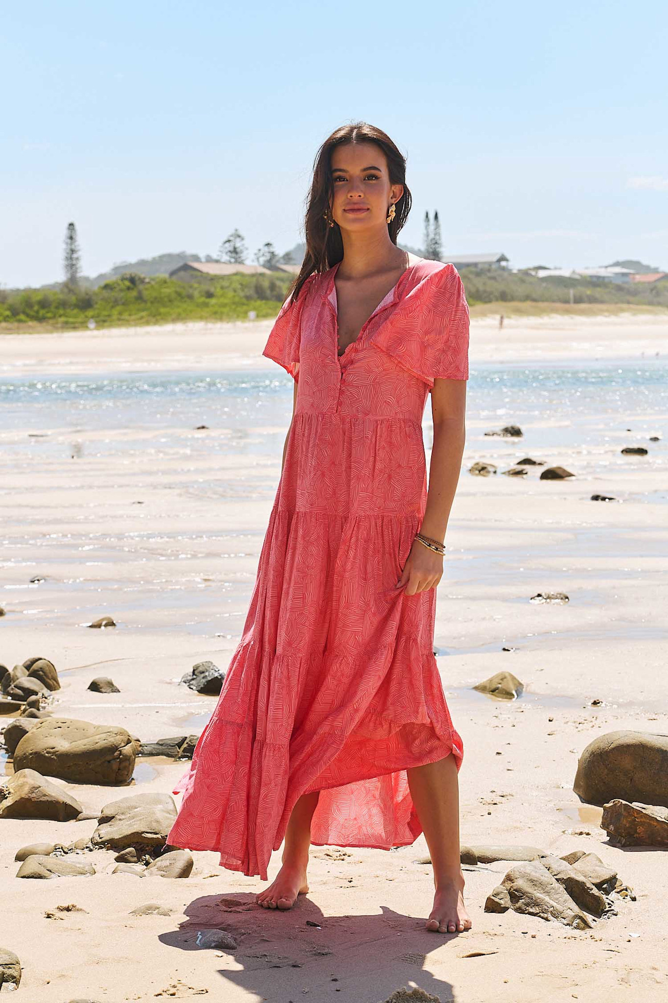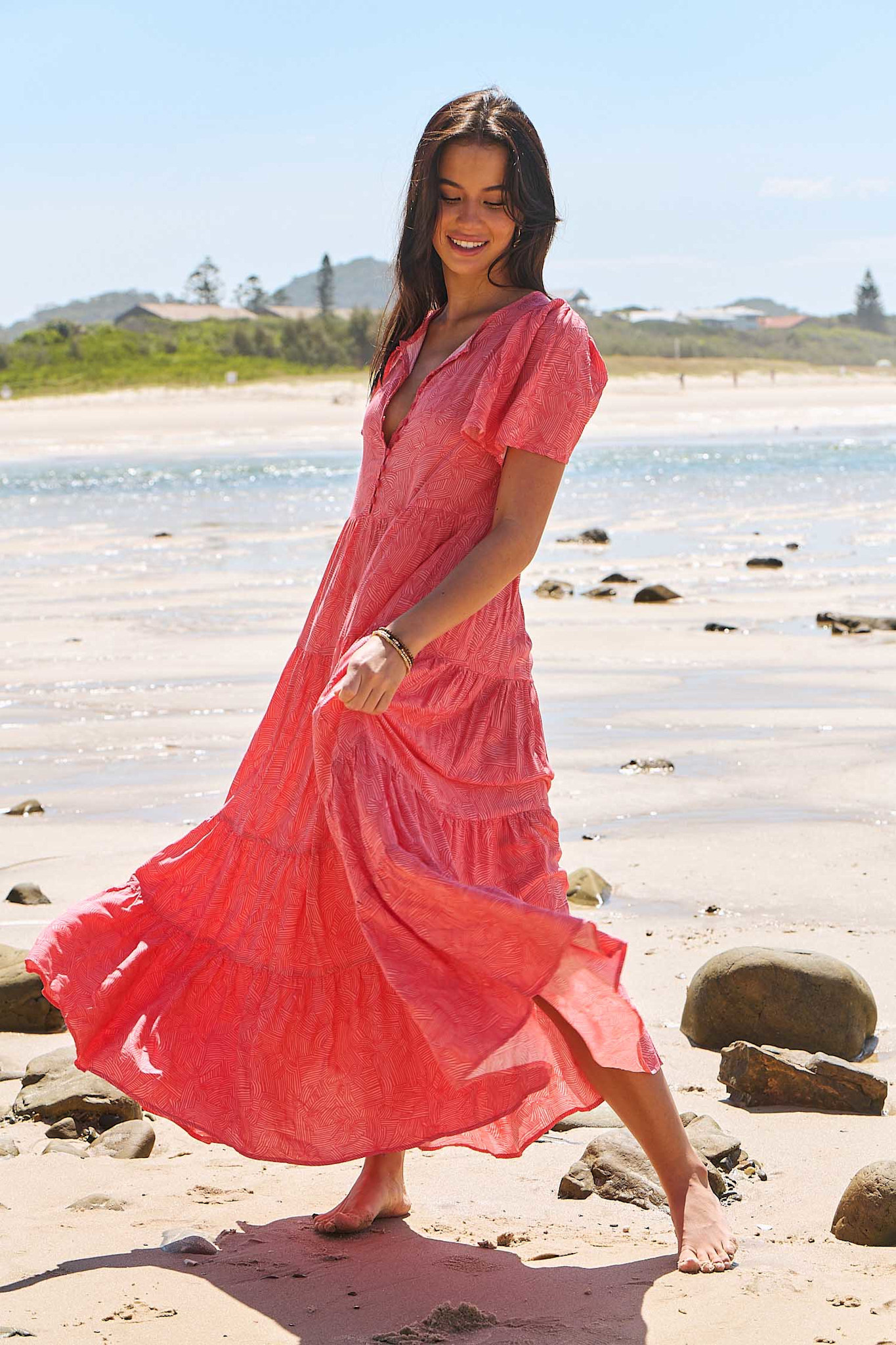 De lange jurk Little Bow Valentine van het merk Jaase heeft een v-hals en sluit aan de voorzijde met knoopjes. De jurk heeft korte kap mouwtjes en een gelaagde rok.