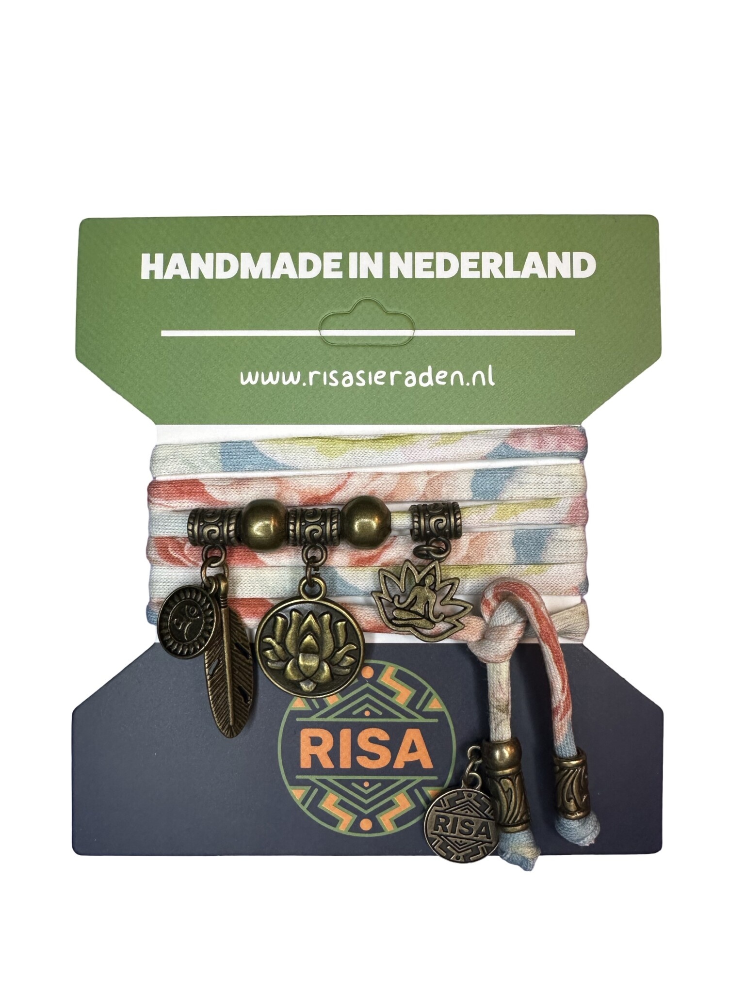 Wikkelarmband gemaakt van gerecycled katoen met bronzen bedels in het thema Lotus. De kleur van het bandje is multi. Lees meer