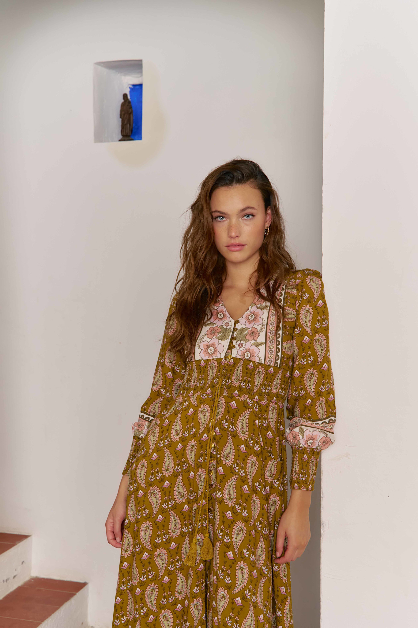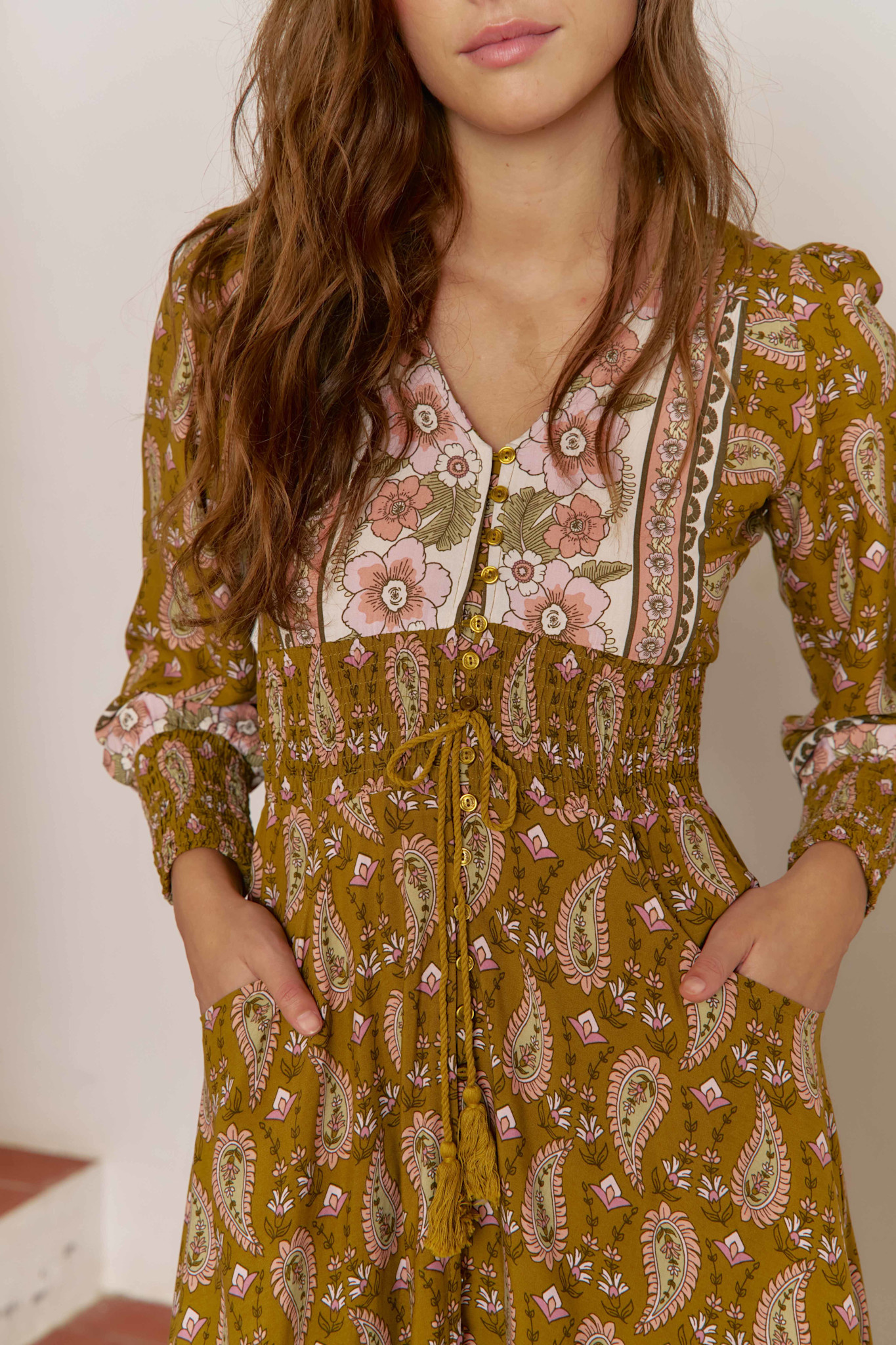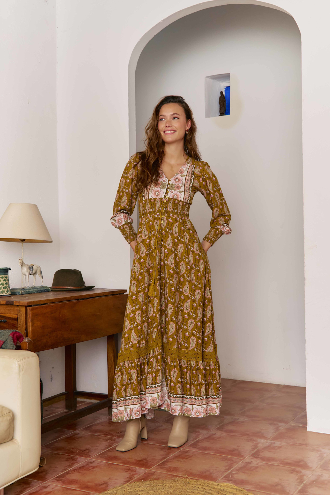 De lange Jurk Amalie Sabrina is een topper van het Australische merk Jaase. Een volledig doorgeknoopte maxi jurk met een mooie herfst print. De jurk heeft een v-hals en een brede gesmokte band in de taille met deco touwtjes in de kleur van de jurk. De jurk heeft lange mouwen met brede gesmokte banden rondom de pols en steekzakken.