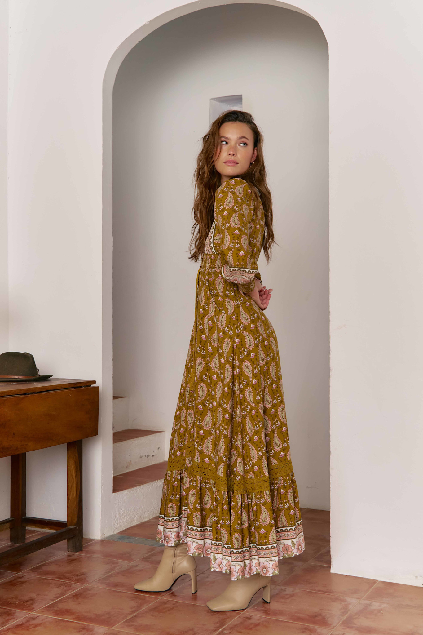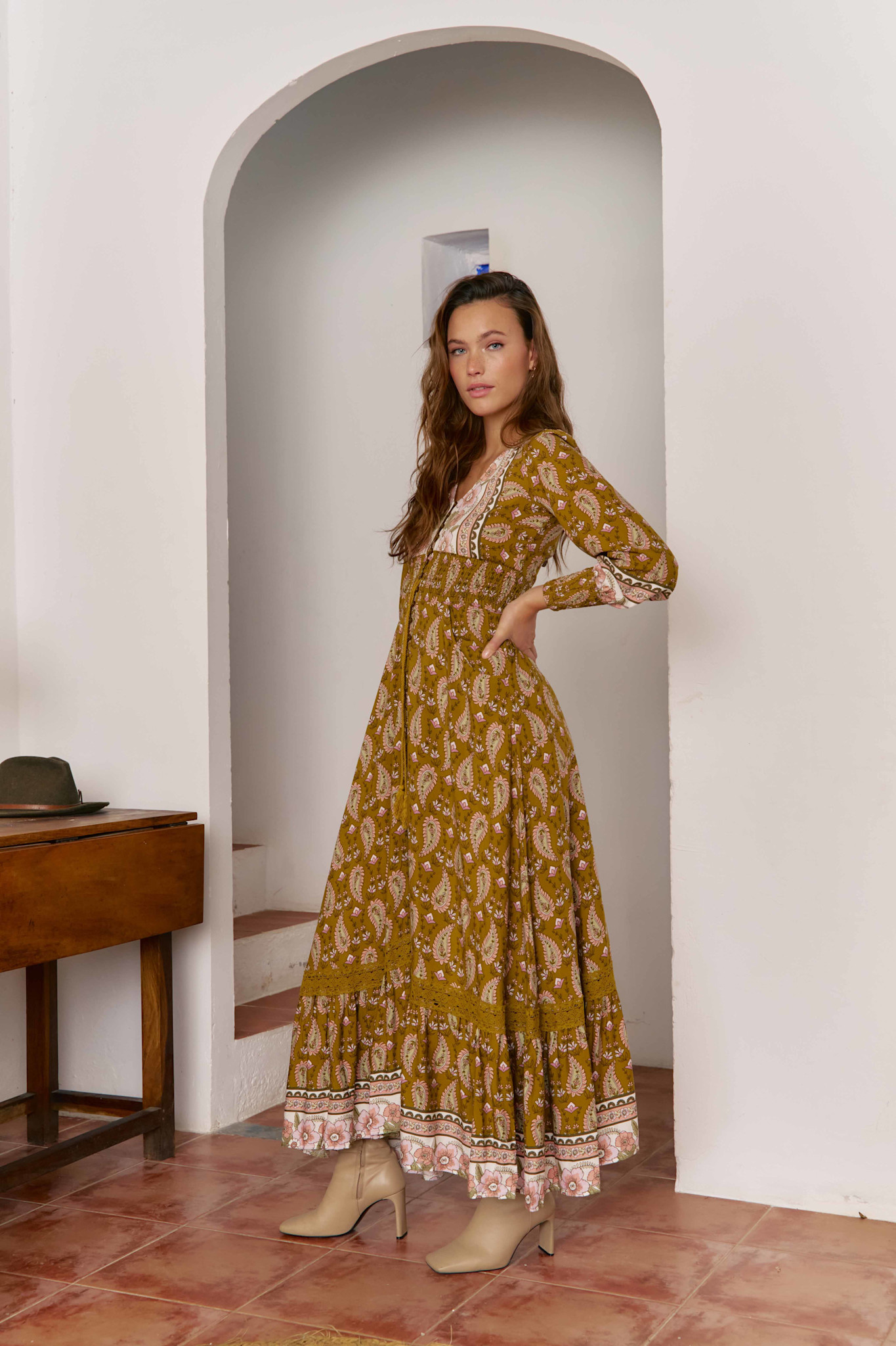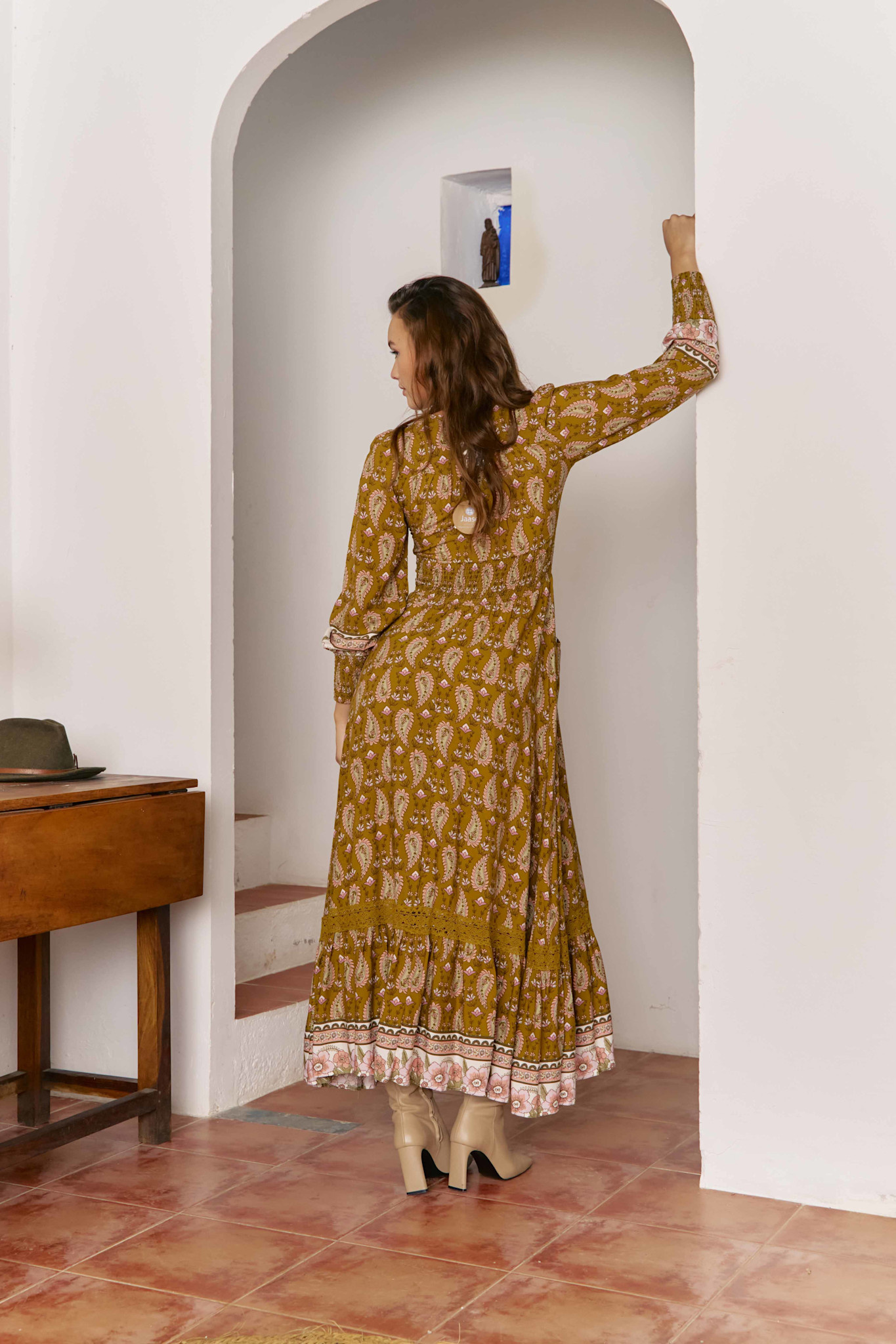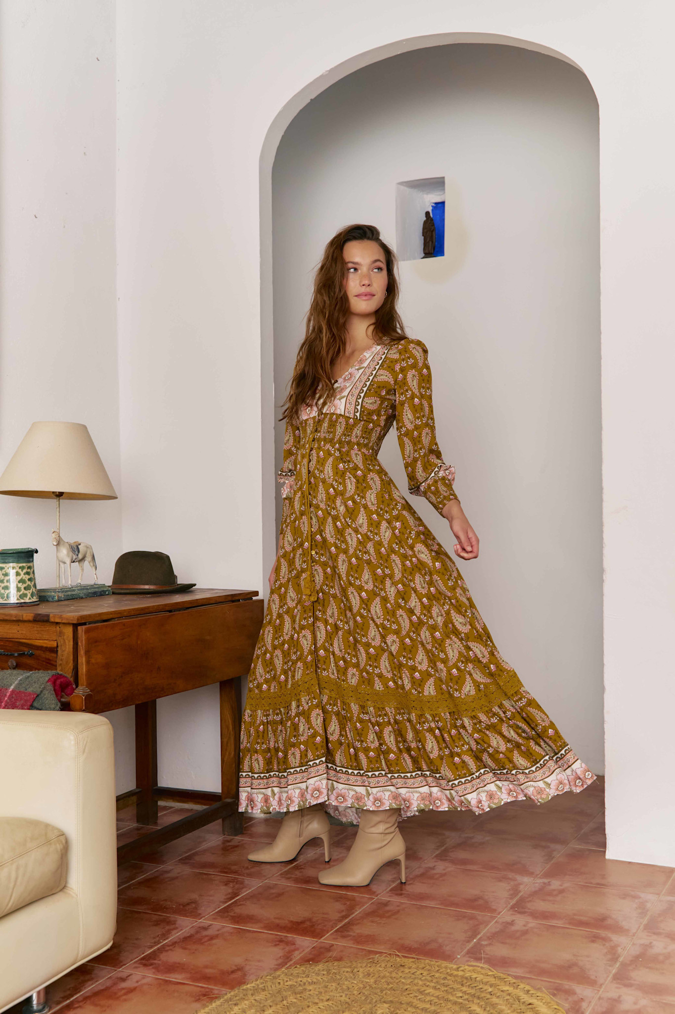 De lange Jurk Amalie Sabrina is een topper van het Australische merk Jaase. Een volledig doorgeknoopte maxi jurk met een mooie herfst print. De jurk heeft een v-hals en een brede gesmokte band in de taille met deco touwtjes in de kleur van de jurk. De jurk heeft lange mouwen met brede gesmokte banden rondom de pols en steekzakken.