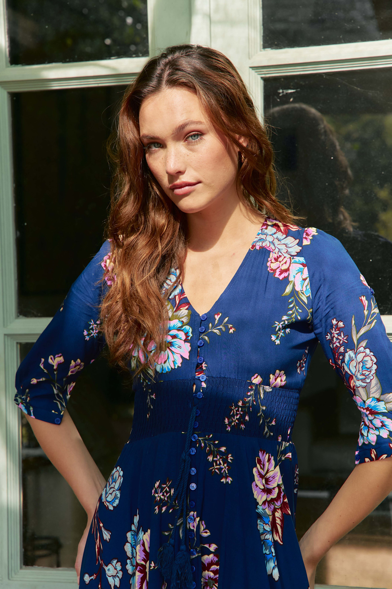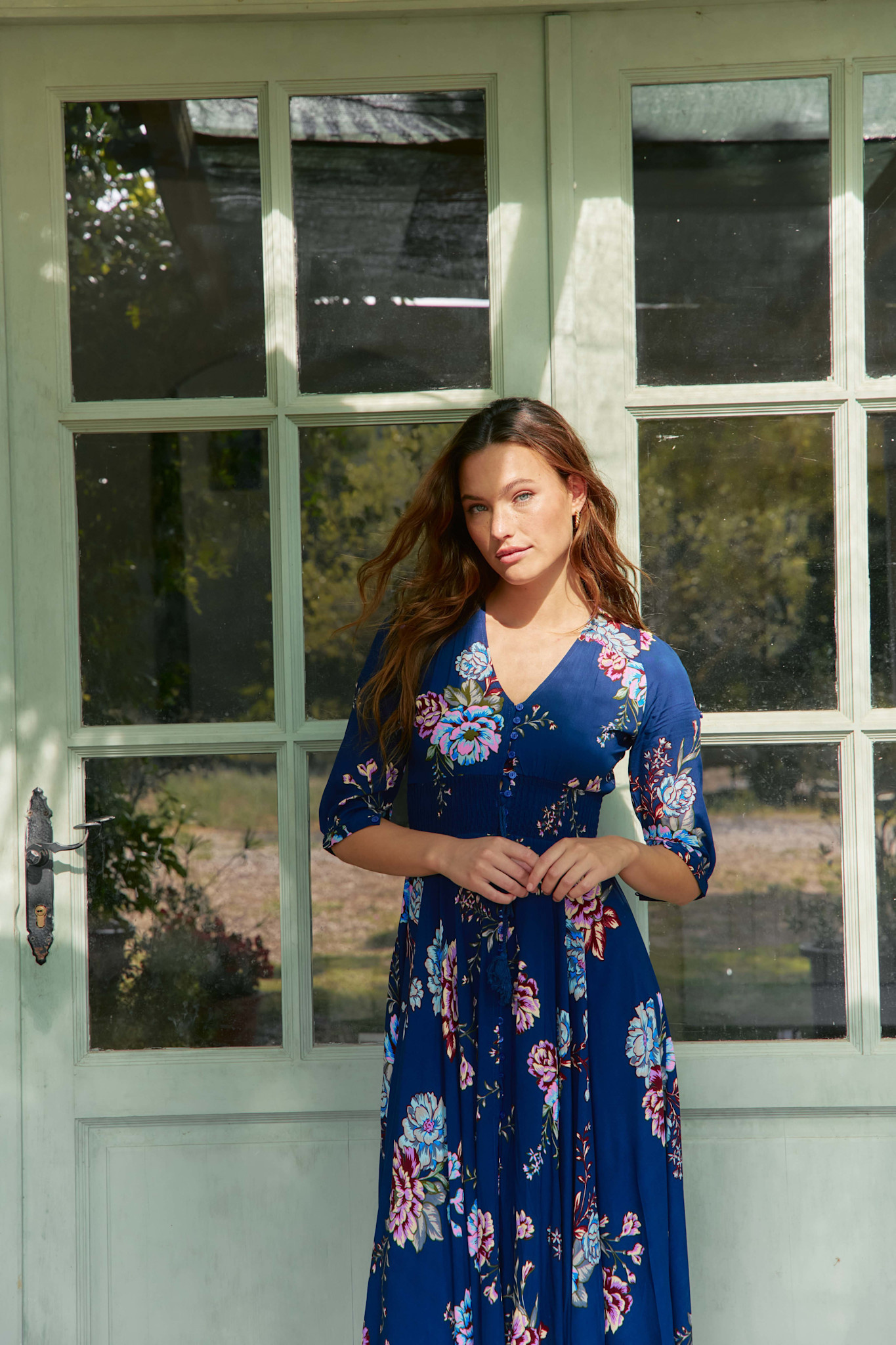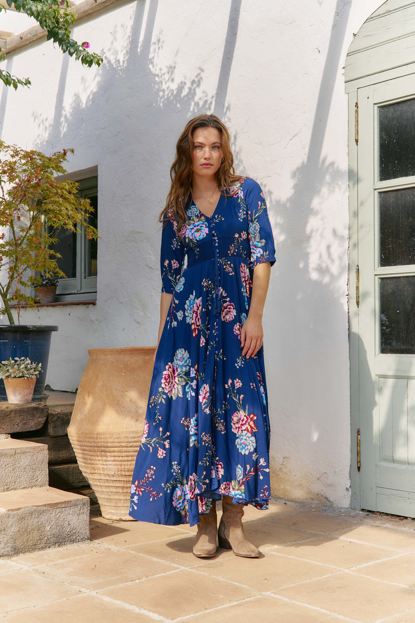 Deze Indiana jurk is een bestseller van Jaase. Een volledig doorgeknoopte maxi jurk met een mooie bloemenprint. De jurk heeft een v-hals en een koord in de taille met een brede gesmokte band. De jurk heeft half lange mouwen en steekzakken.