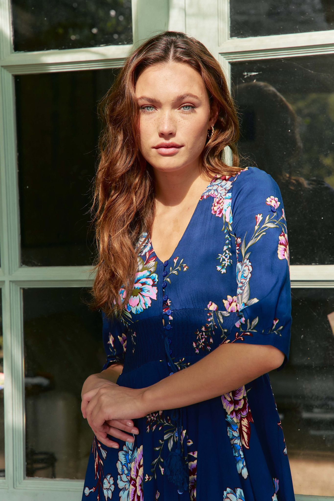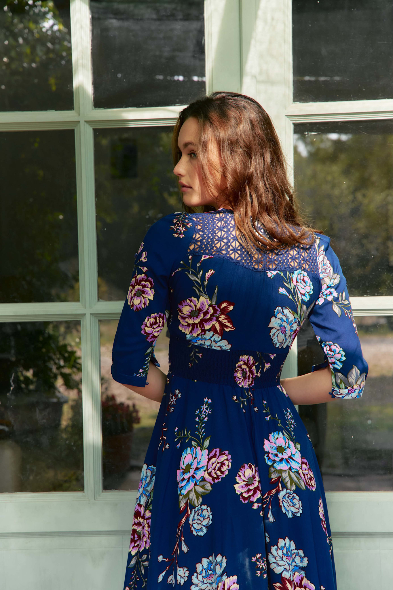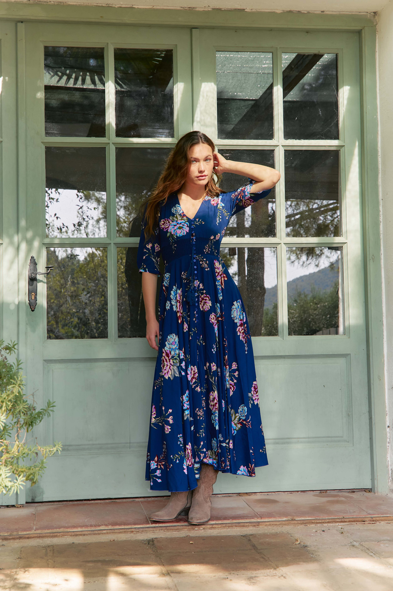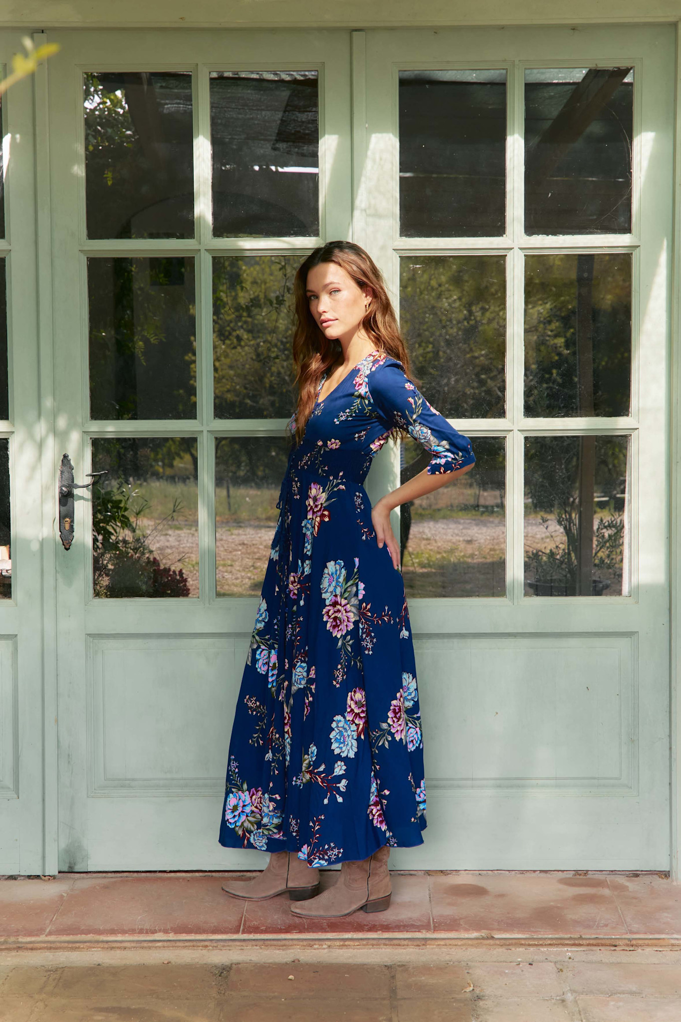 Deze Indiana jurk is een bestseller van Jaase. Een volledig doorgeknoopte maxi jurk met een mooie bloemenprint. De jurk heeft een v-hals en een koord in de taille met een brede gesmokte band. De jurk heeft half lange mouwen en steekzakken.