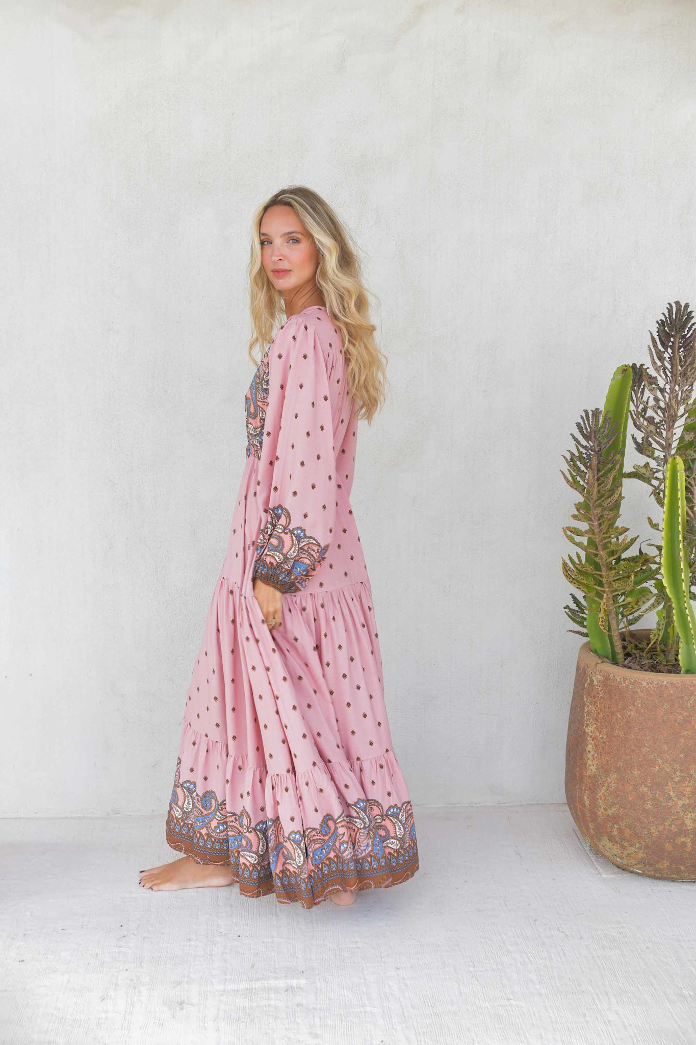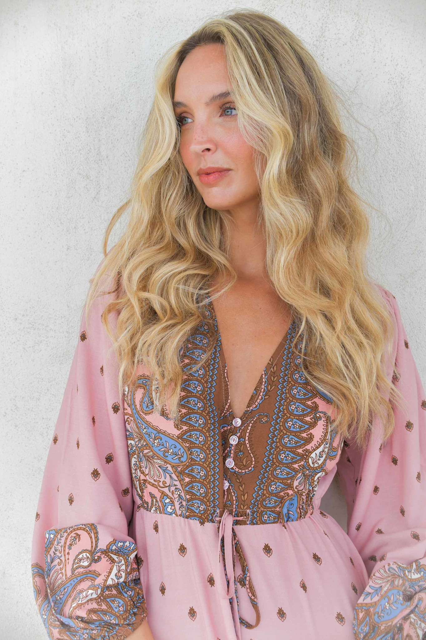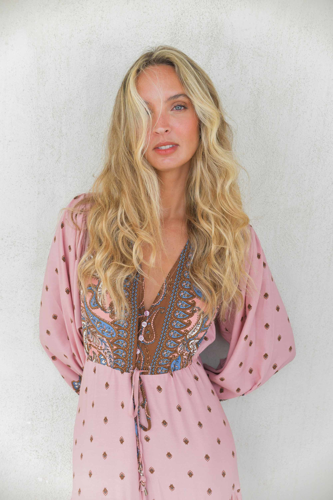 De lange jurk Saraphina Teresa van het merk Jaase heeft een prachtige print, een v-hals en sluit aan de voorzijde met knoopjes en een koord in de taille die kan worden aangetrokken. De jurk heeft Lange, wijdere mouwen met een elastische band rond de armen aansluitend en heeft een split aan de voorzijde en een losse comfortabele fit.
