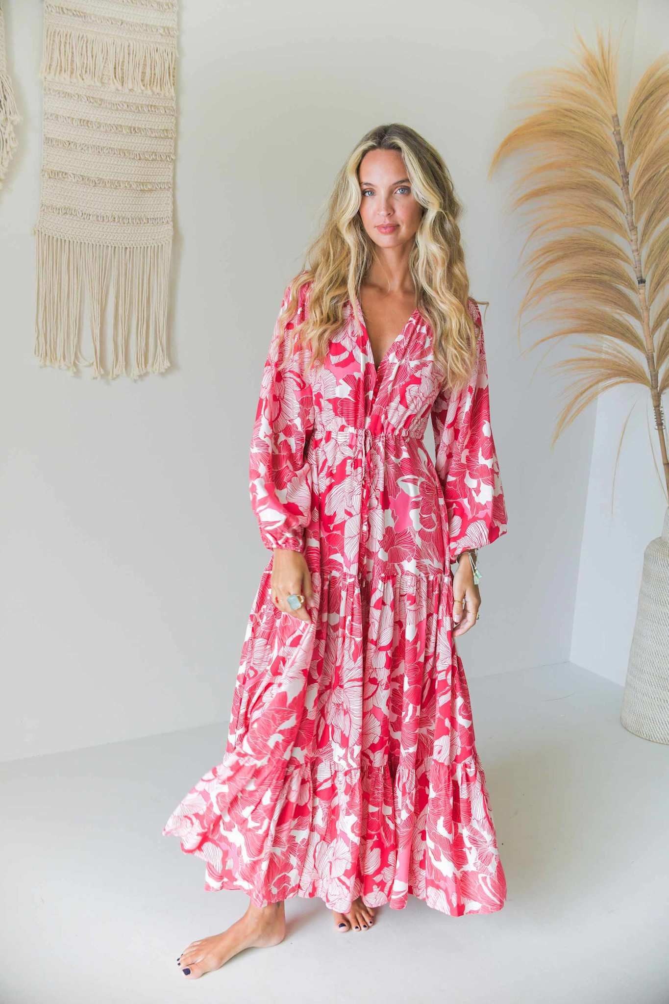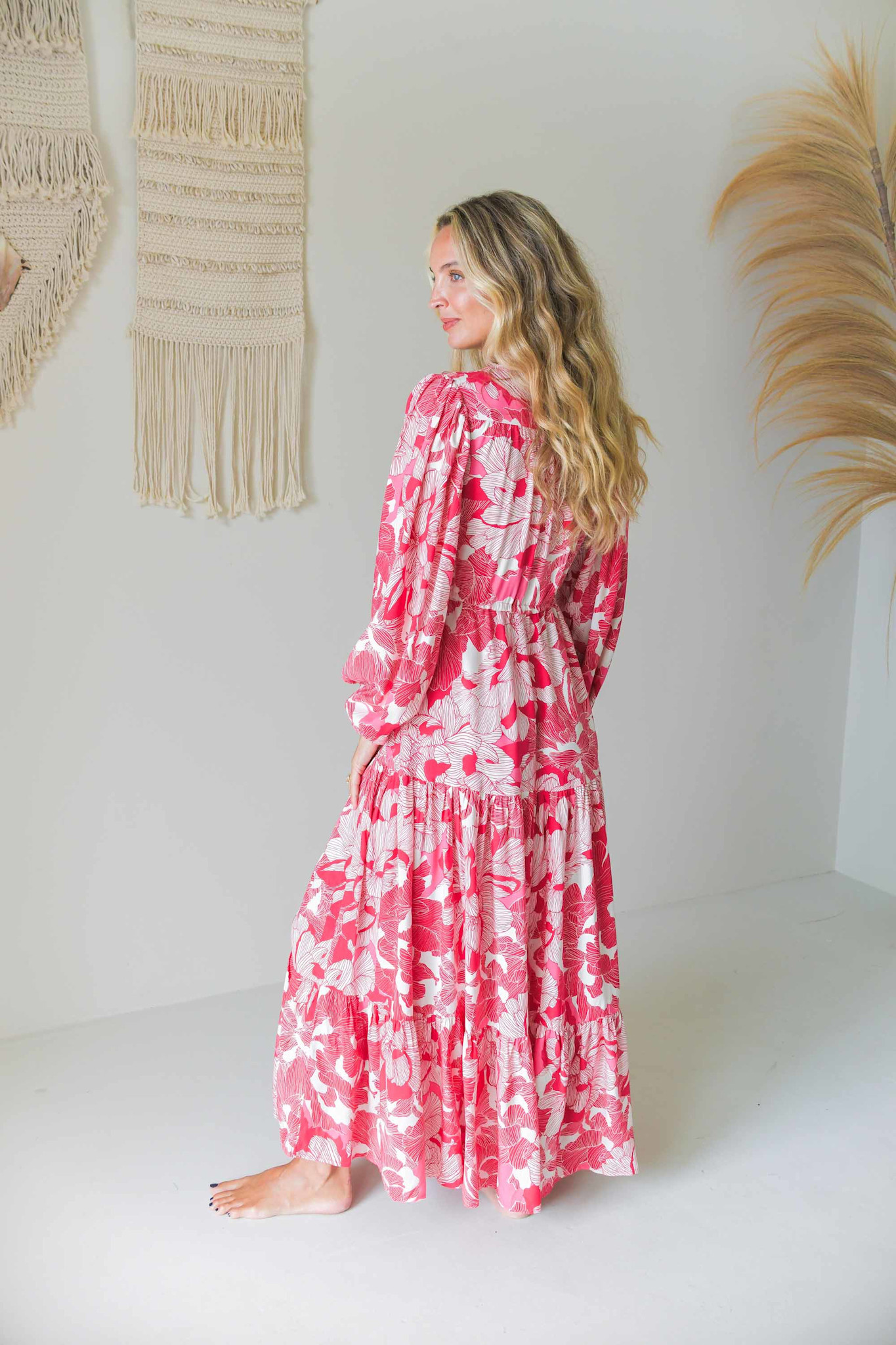 De lange jurk Soulina Teresa van het merk Jaase heeft een prachtige print, een v-hals en sluit aan de voorzijde met knoopjes en een koord in de taille die kan worden aangetrokken. De jurk heeft Lange, wijdere mouwen met een elastische band rond de armen aansluitend en heeft een split aan de voorzijde en een losse comfortabele fit.