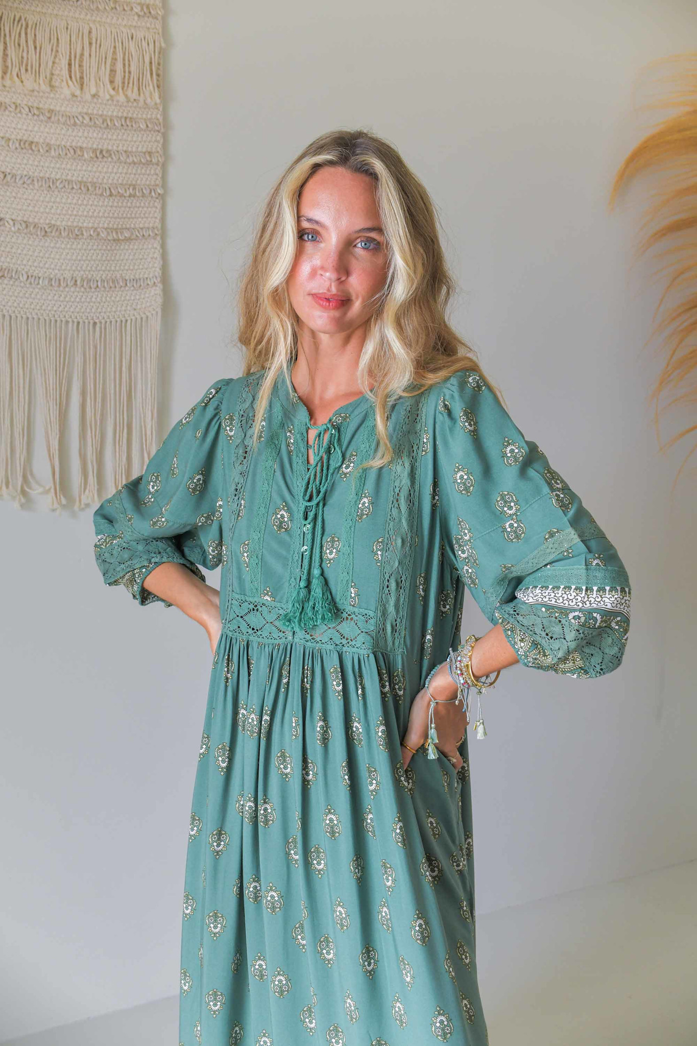 De lange jurk Viridian Meadow van het merk Jaase heeft een prachtige groene print, een v-hals en sluit aan de voorzijde met knoopjes en een koord. De jurk heeft wijdere driekwart mouwen met een elastische band rond de armen. De jurk is op meerdere plekken opengewerkt en heeft een losse comfortabele fit.