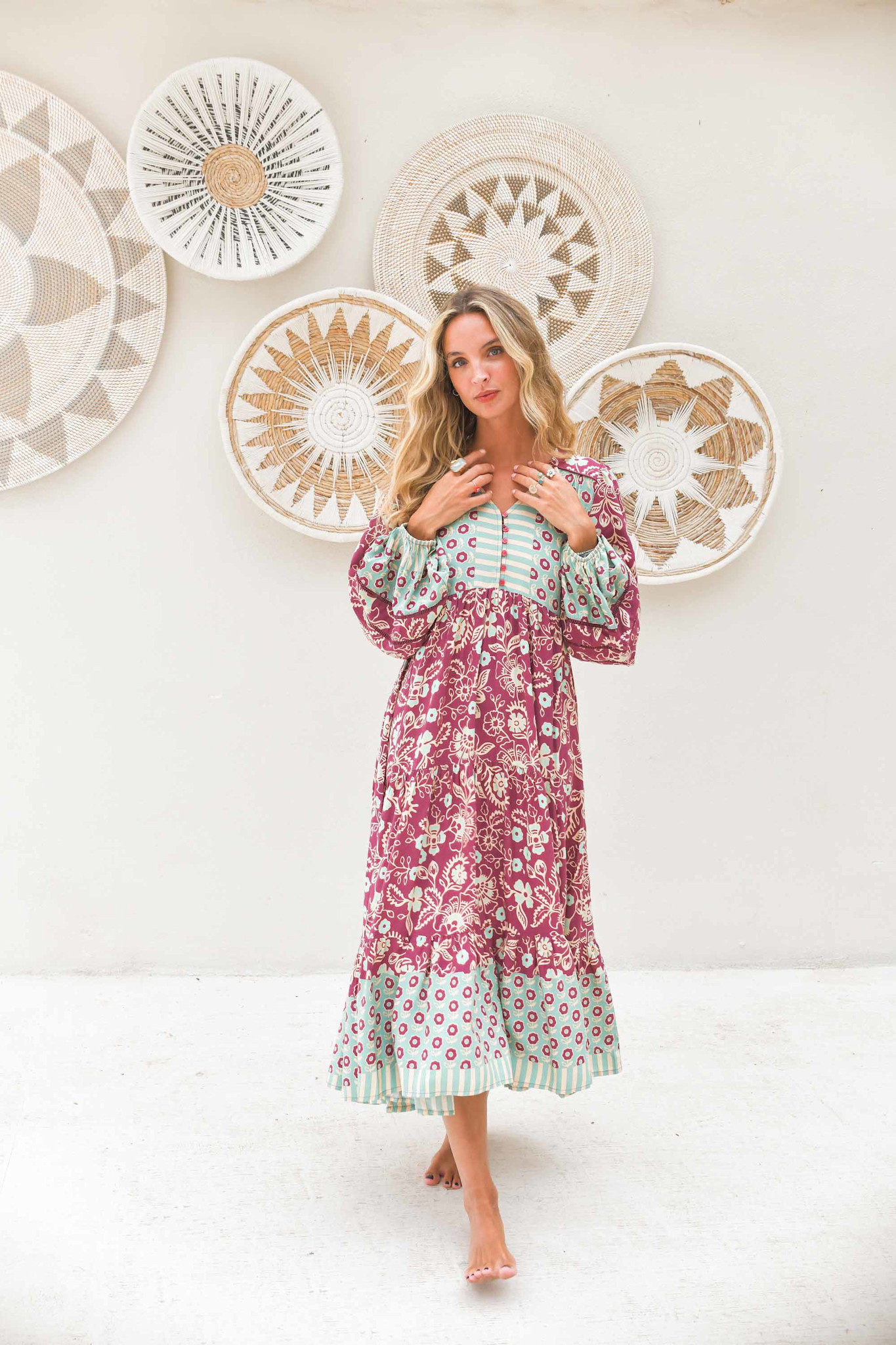 De midi-jurk Athena Eve van het merk Jaase heeft een v-hals met knoopjes. De halflange jurk heeft lange mouwen met een losse smalle elastische band rond de polsen. De jurk heeft een losse comfortabele fit.