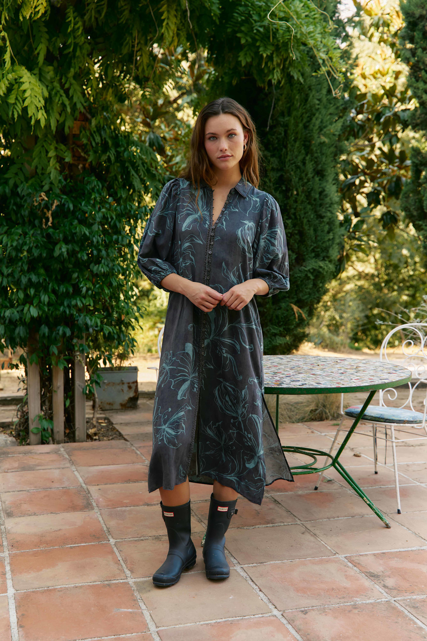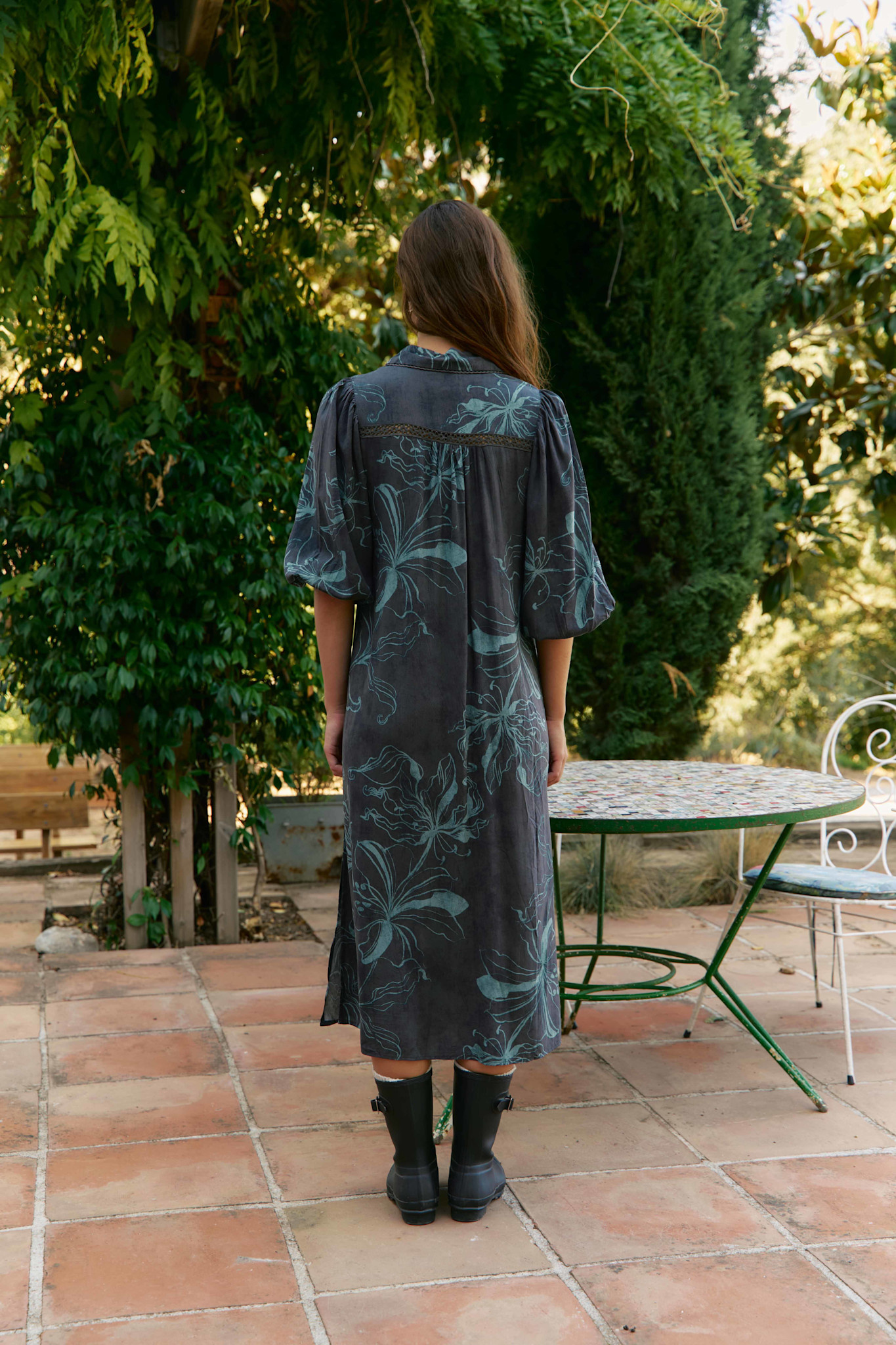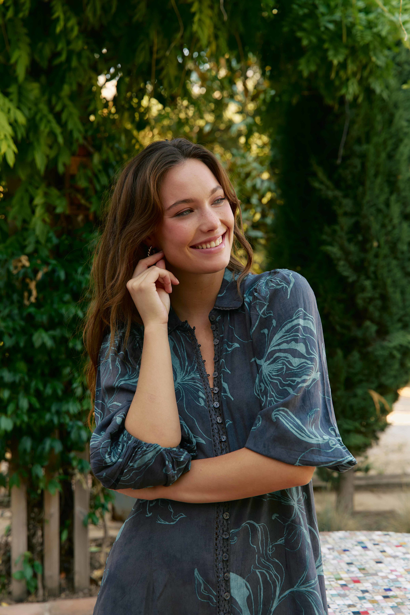 De midi-jurk Midnight Lilly Whitney van het merk Jaase heeft een kraagje en is volledig doorgeknoopt. De halflange jurk heeft wijde driekwart mouwen met een elastische band rond de armen. De jurk heeft een grijsblauwe print en een losse comfortabele fit.