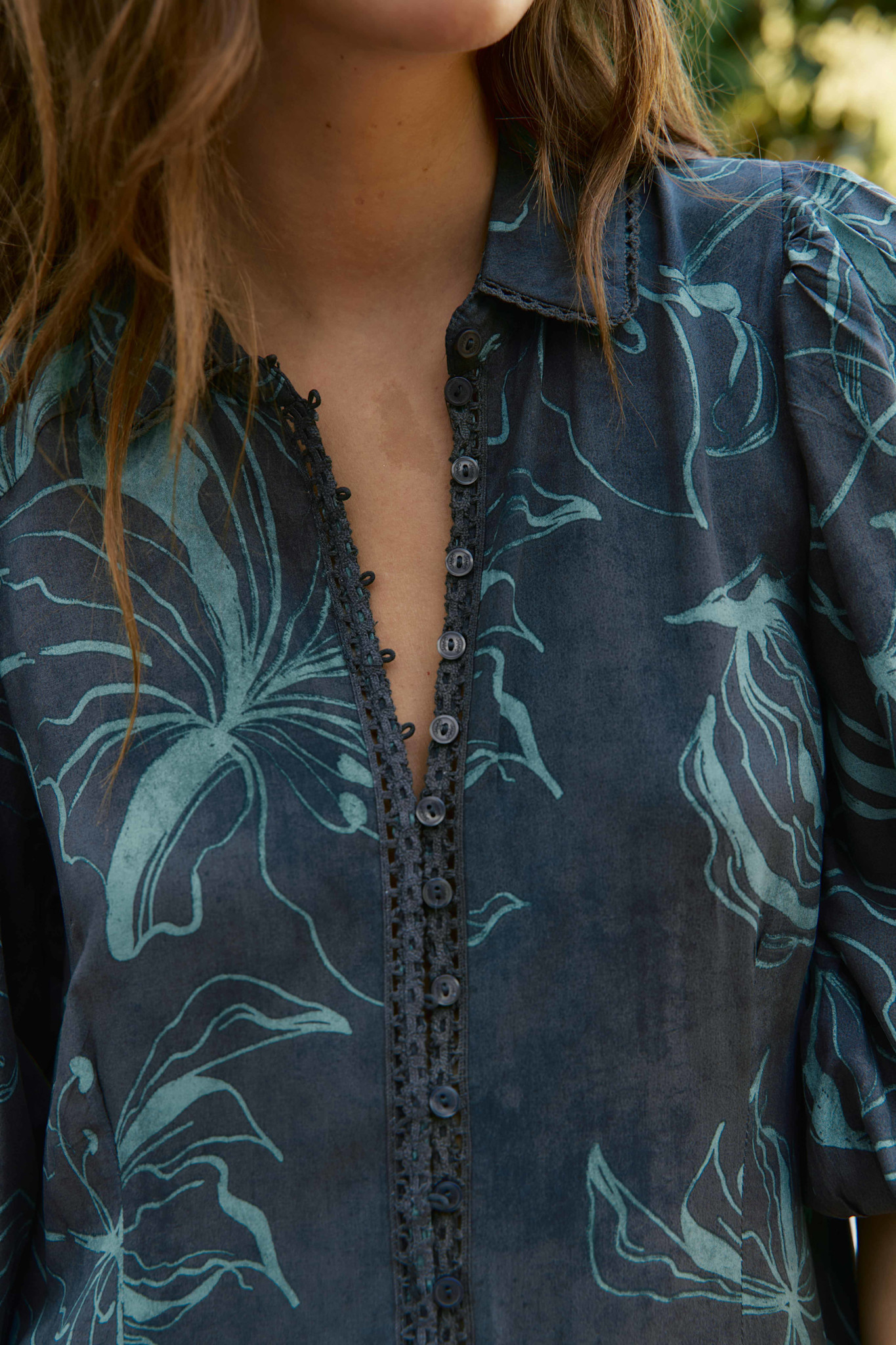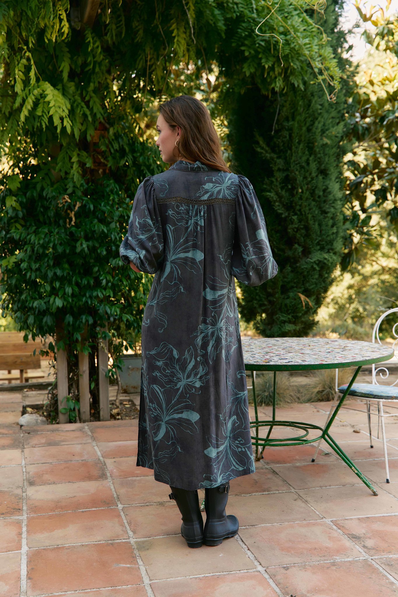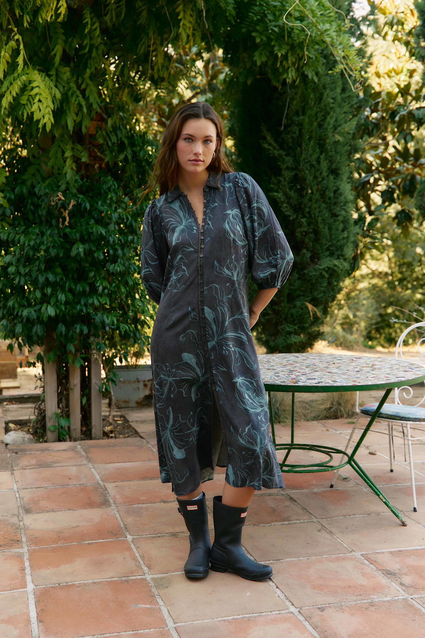 De midi-jurk Midnight Lilly Whitney van het merk Jaase heeft een kraagje en is volledig doorgeknoopt. De halflange jurk heeft wijde driekwart mouwen met een elastische band rond de armen. De jurk heeft een grijsblauwe print en een losse comfortabele fit.