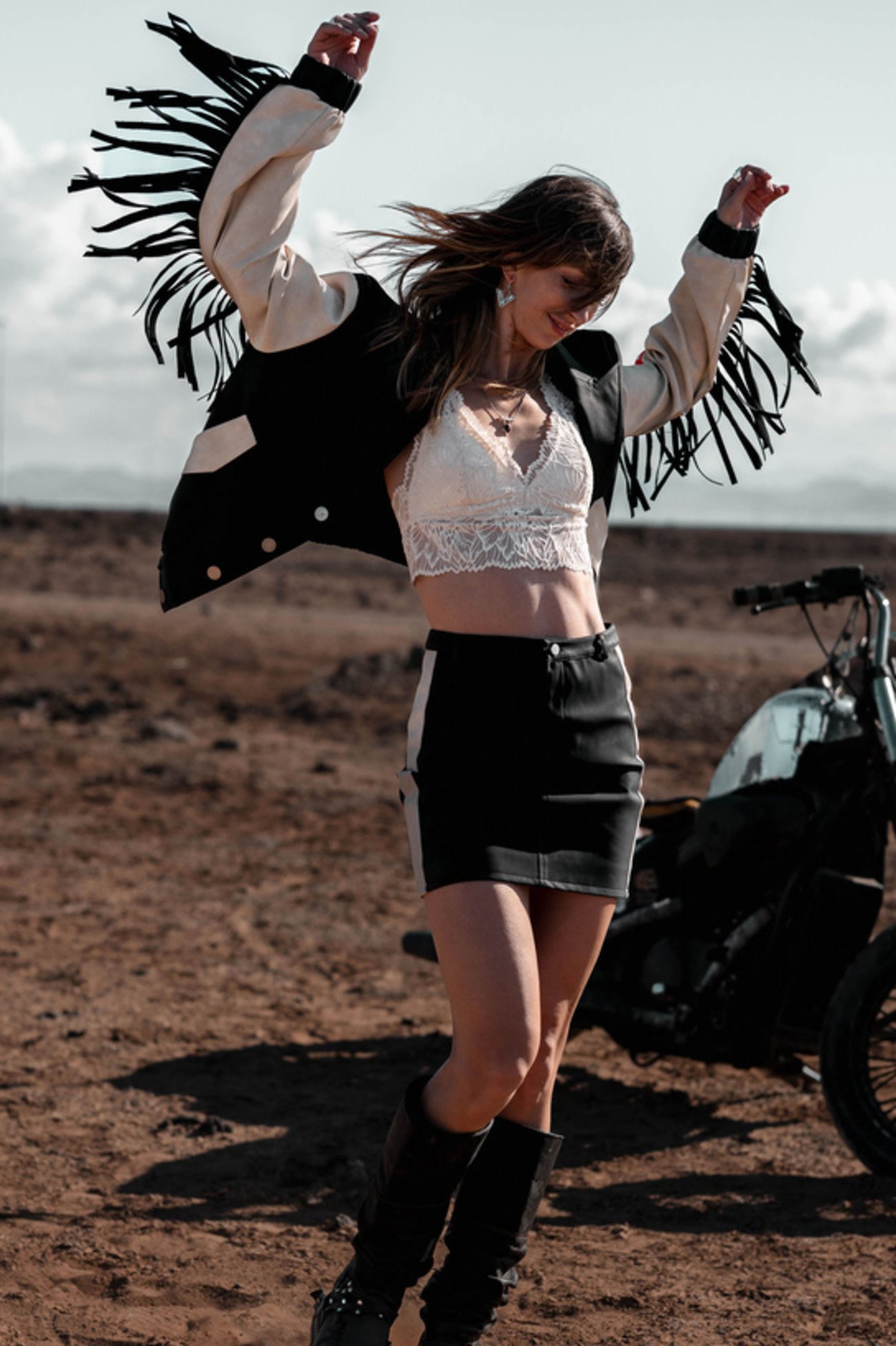 De Mable motor jacket van Moost Wanted is een krachtige eyecatcher voor je herfst- en wintergarderobe. Het klassieke motorjack krijgt een moderne upgrade met speelse fringes op de rug en mouwen. Gemaakt van hoogwaardig materiaal, met een comfortabele pasvorm en stoere uitstraling. Of je nu op de motor stapt of gewoon een statement wilt maken, dit jack trekt direct de aandacht.