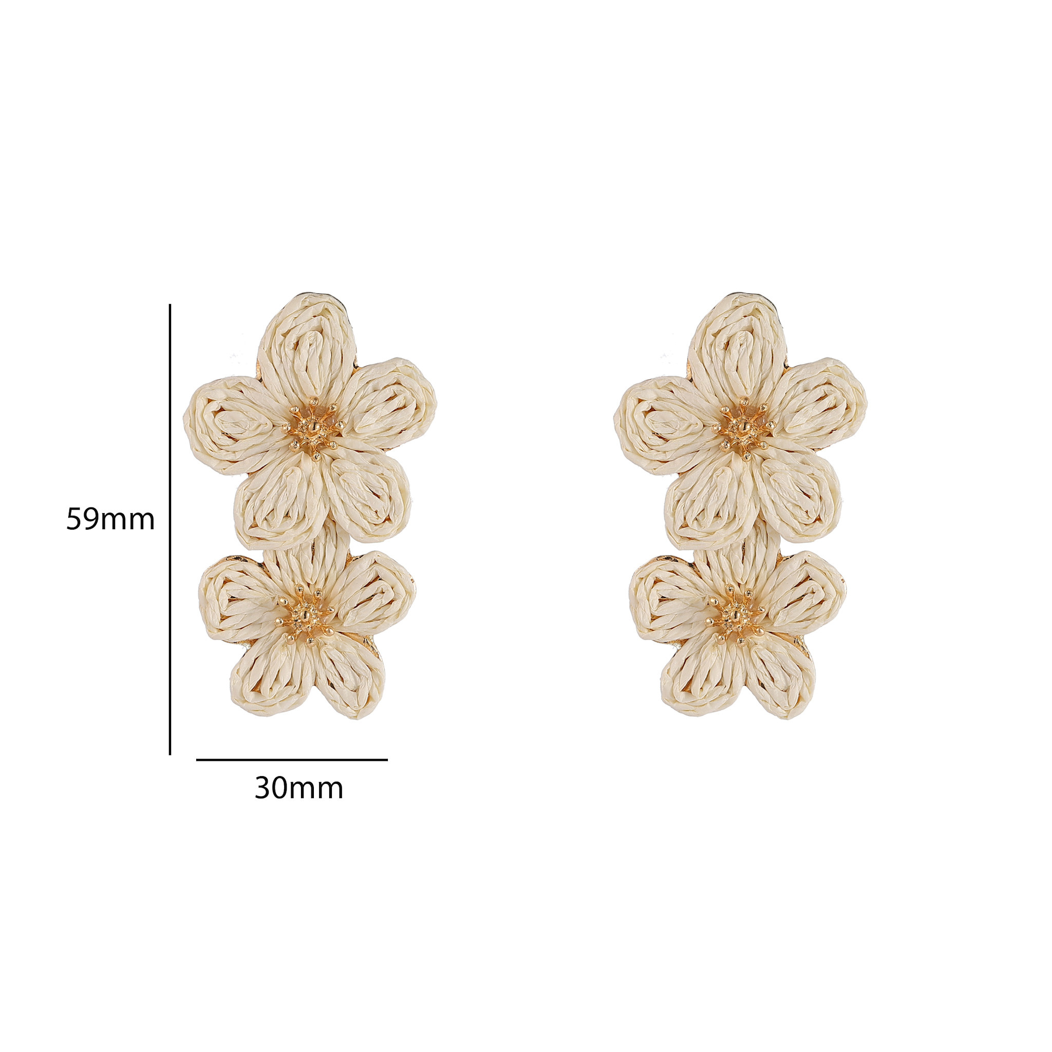 Raffia oorbellen met een dubbele bloem in off white. Het formaat is 59 x 30 mm. De raffia zorgt voor een licht model met een zomerse look.