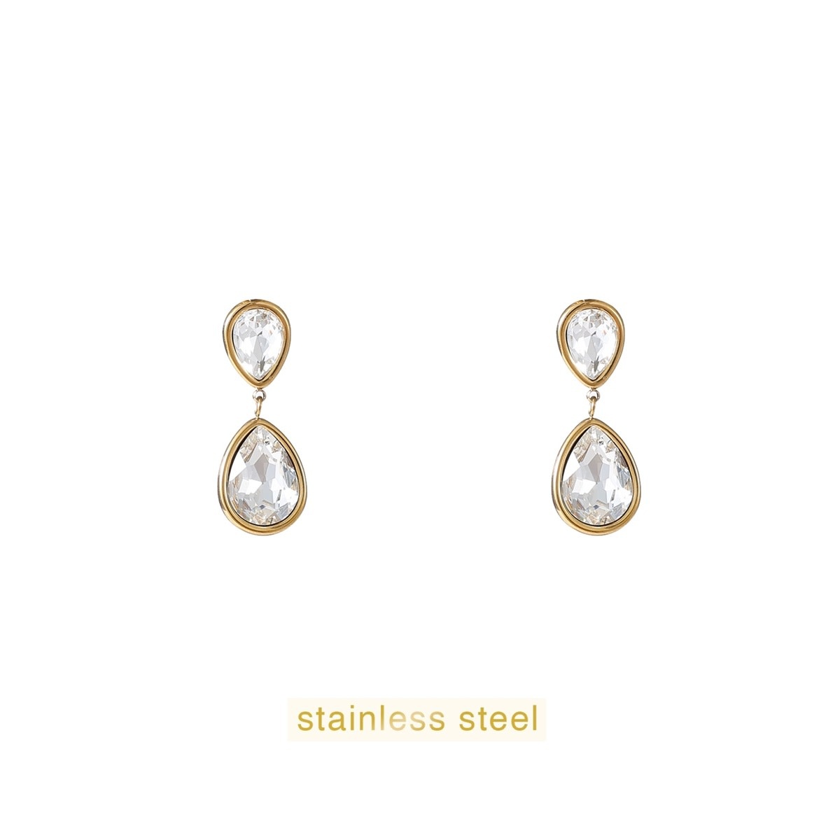 Oorbellen met een dubbele druppelvorm, afgewerkt met strass steentjes. Met een formaat van 33 x 12,5 mm hebben deze oorbellen een opvallend model met een subtiele glans.