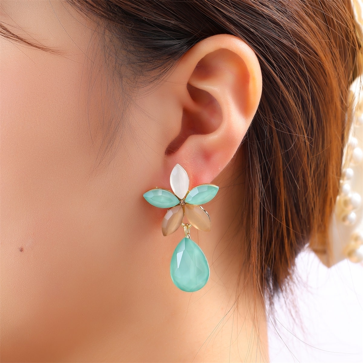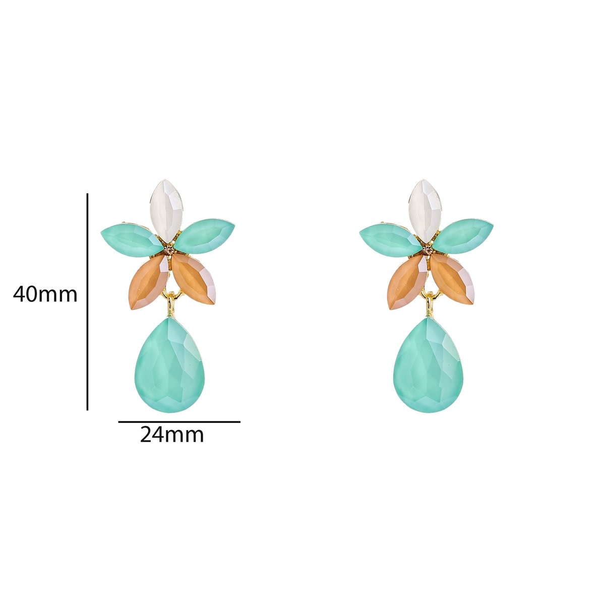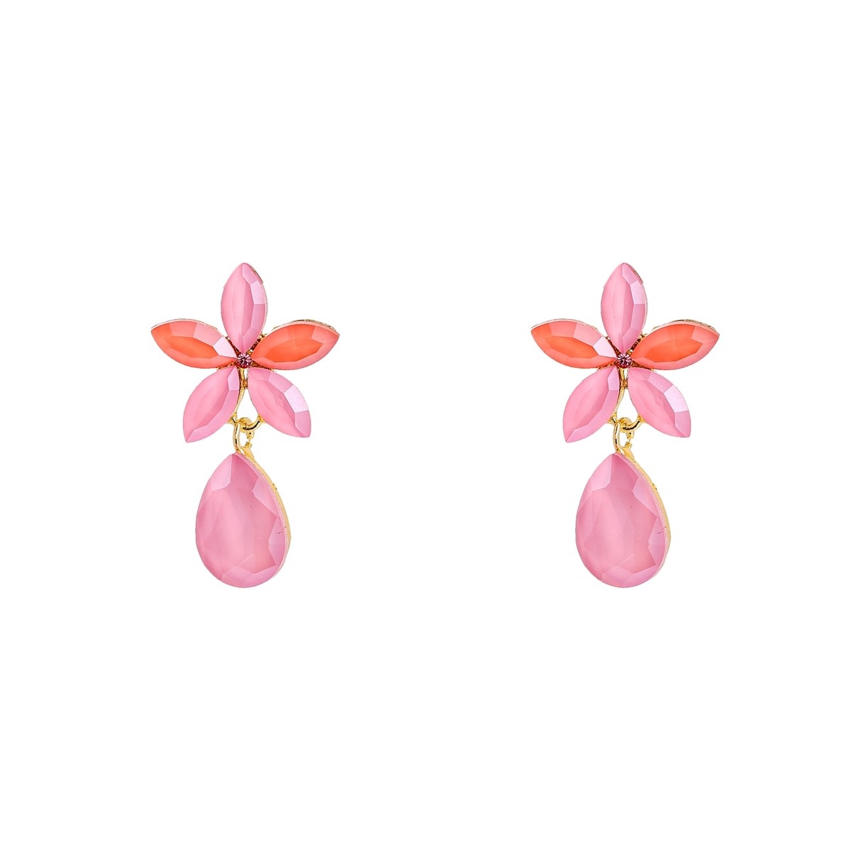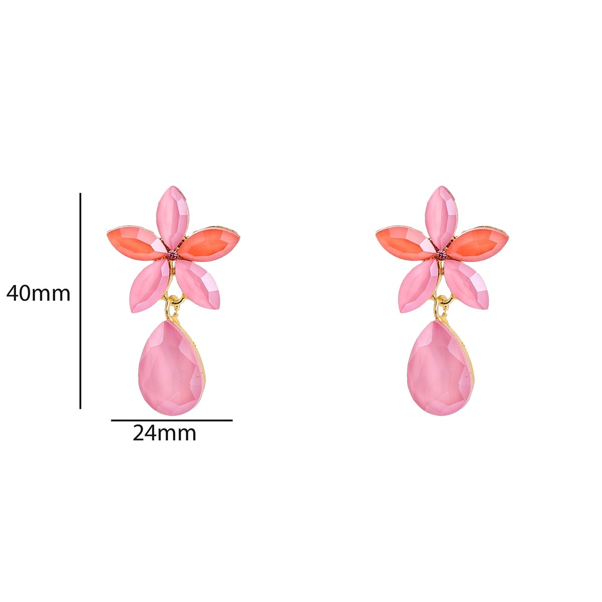 Kleurrijke oorbellen met een bloemenstud waar een druppelvormige hanger aan hangt. Met een formaat van 40 x 24 mm zijn deze oorbellen een opvallend model. Verkrijgbaar in twee kleuren: roze en mint.