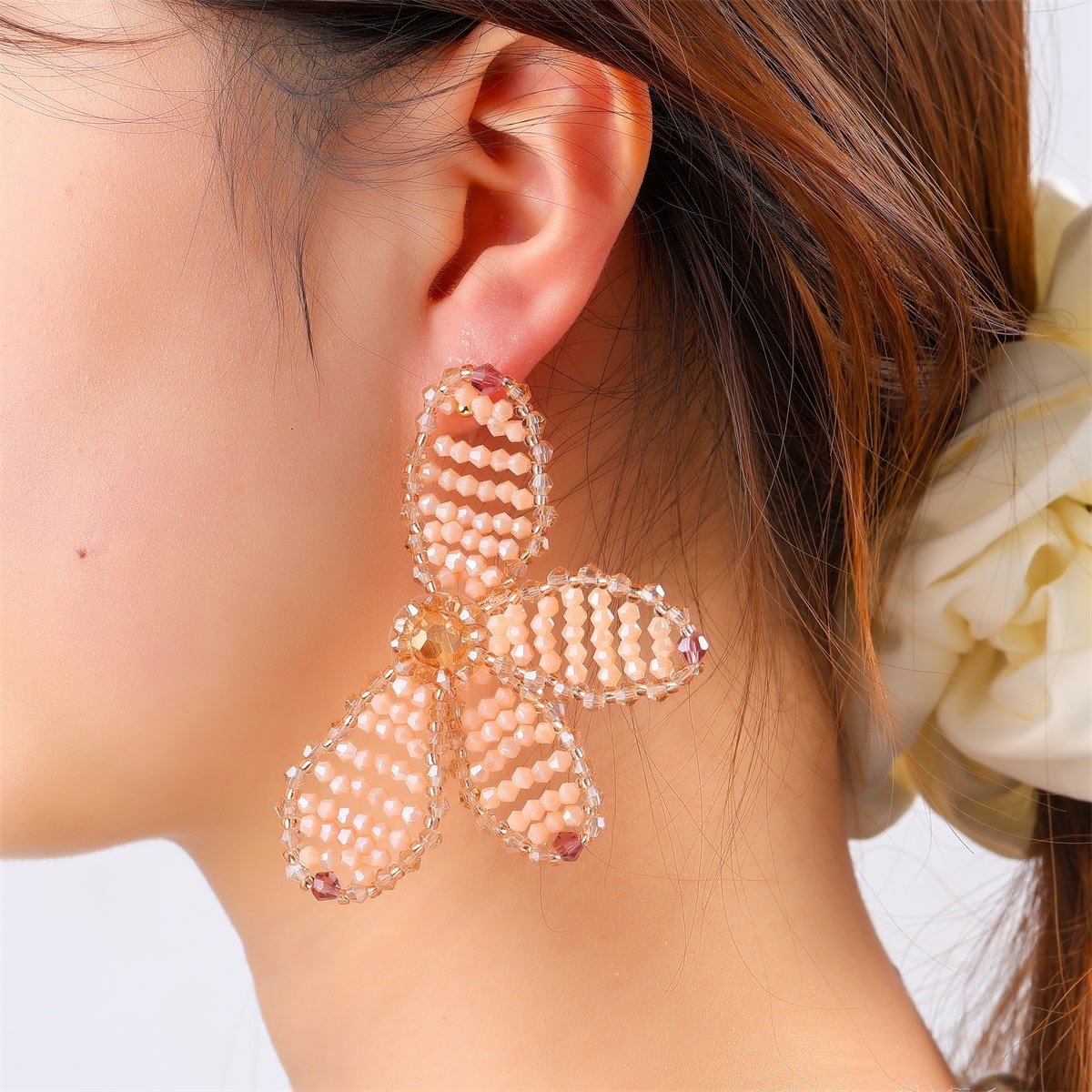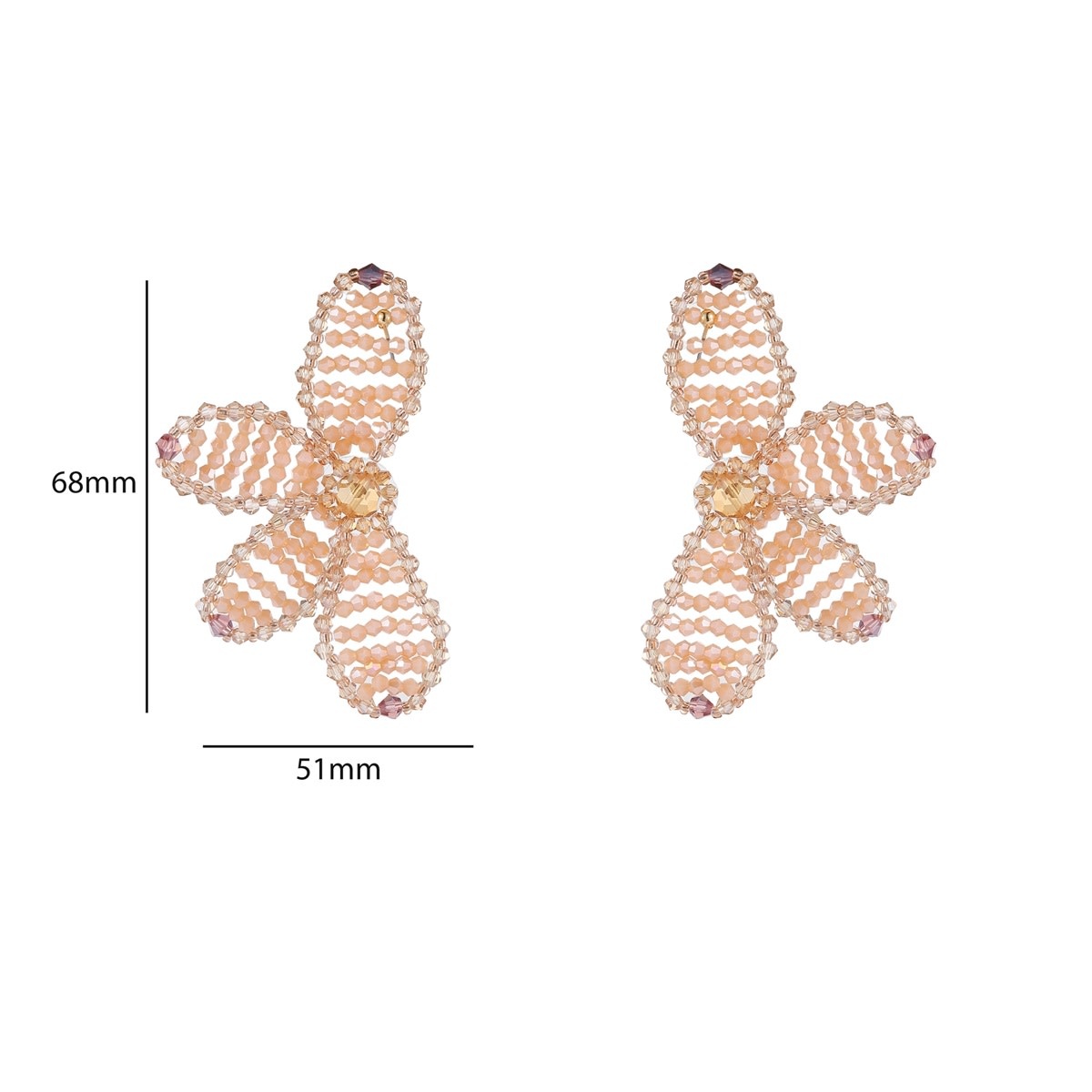 Oorstekers van stainless steel in de vorm van een halve bloem die onder het oor hangt en aan één blad in het oor wordt gedragen. De oorbel is opgevuld met kleine beads en valt goed op door het formaat. De afmetingen van de oorbellen zijn 68 x 51 mm.
