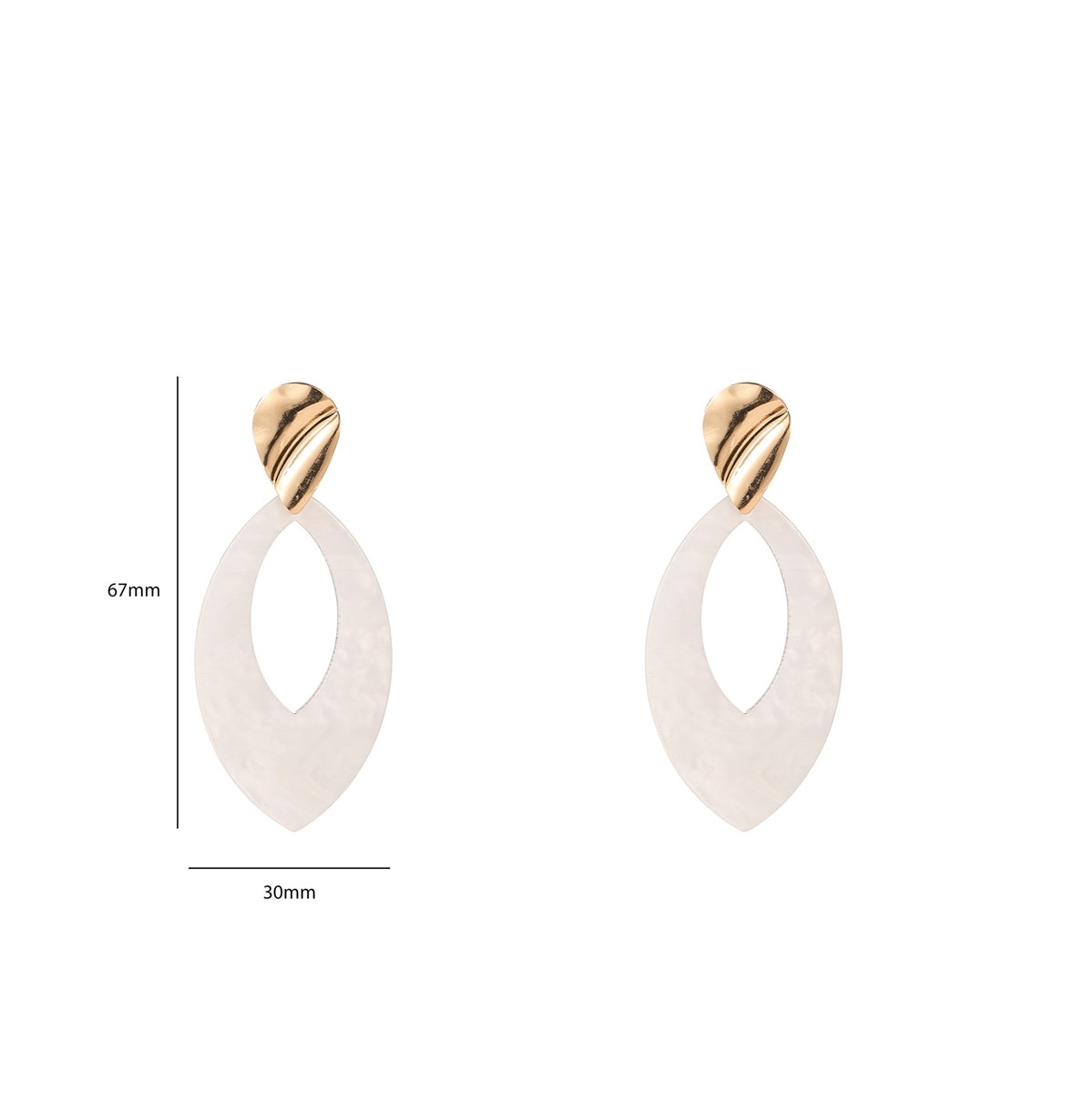 Oorstekers van stainless steel met een druppelvormige stud en een witte hanger die vrij beweegt. De afmetingen van de oorbellen zijn 67 x 30 mm.