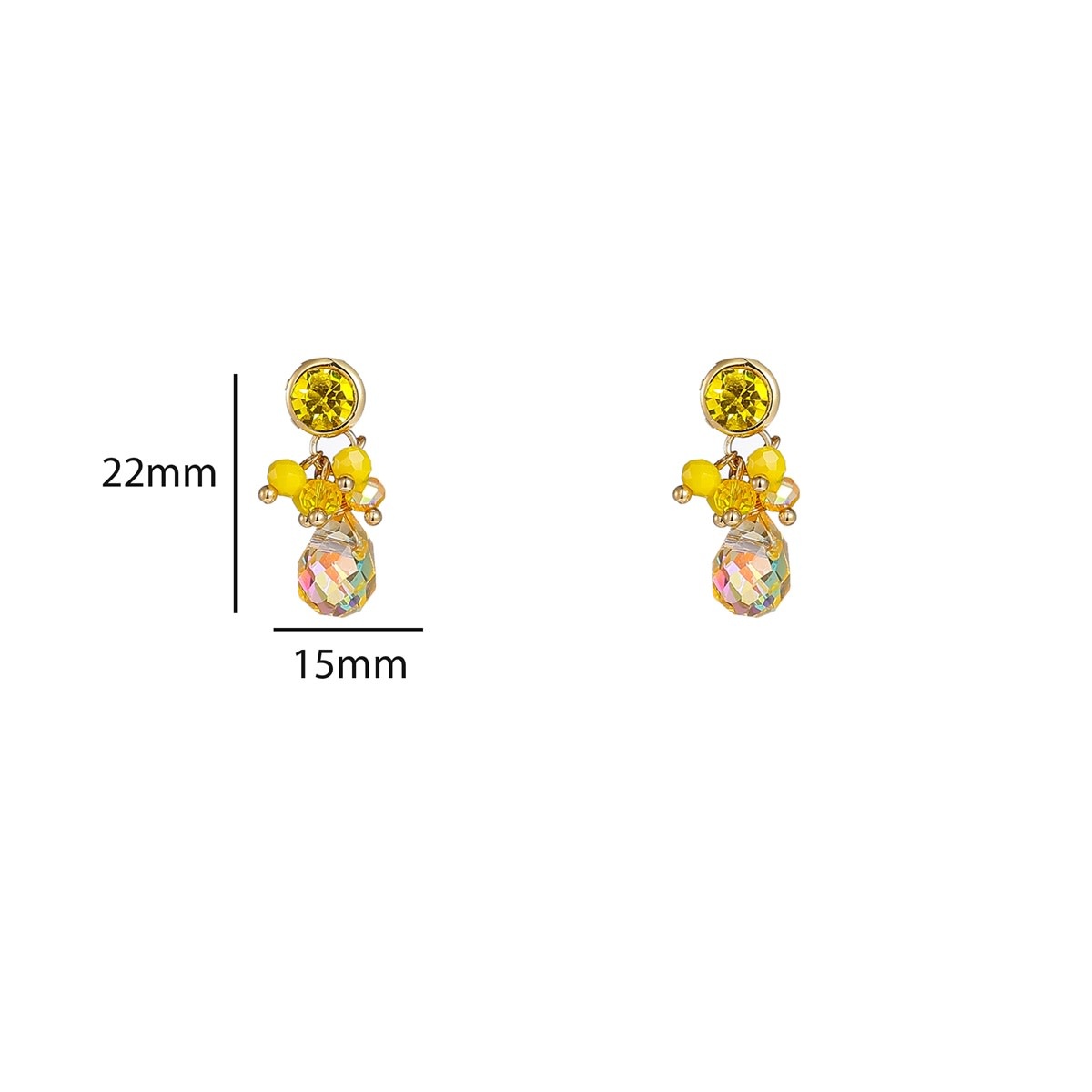 Oorbellen van stainless steel in geel met beads en een strass steen. Compacte oorbellen met een verfijnd model. De afmetingen van de oorbellen zijn 22 x 15 mm.