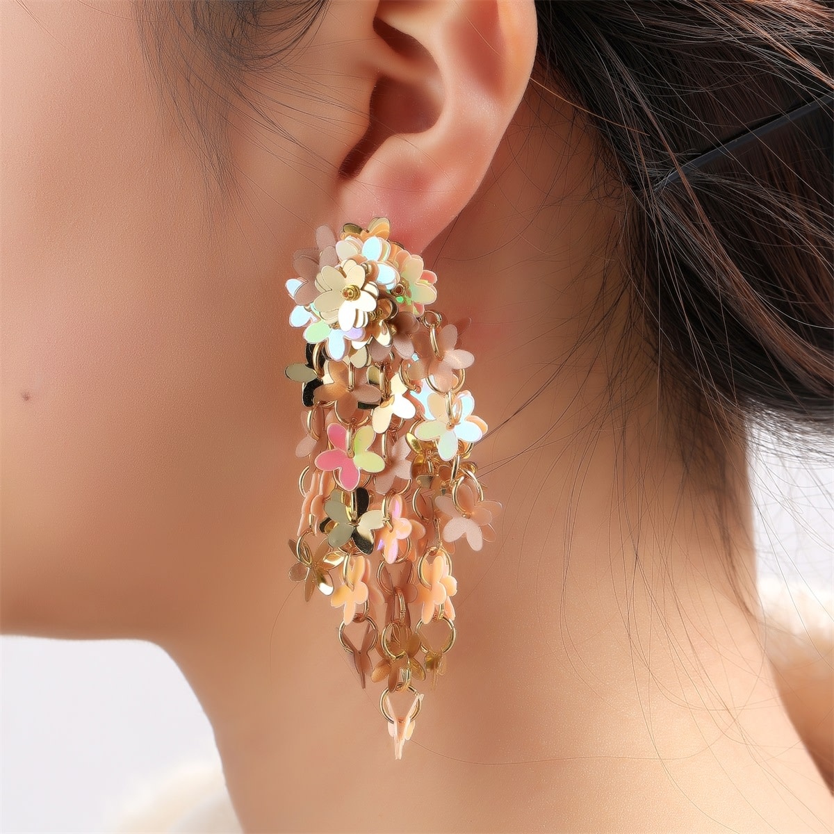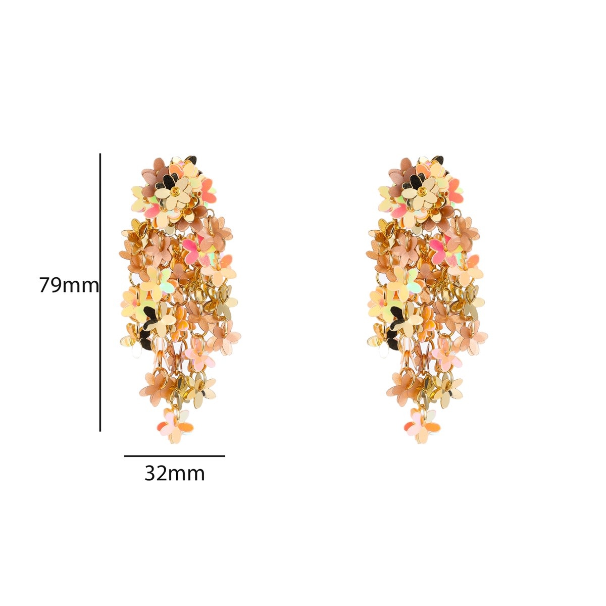 Statement oorbellen met waterval van pailletten in bloemvorm. De afmetingen van de oorbellen zijn 79 x 32 mm.