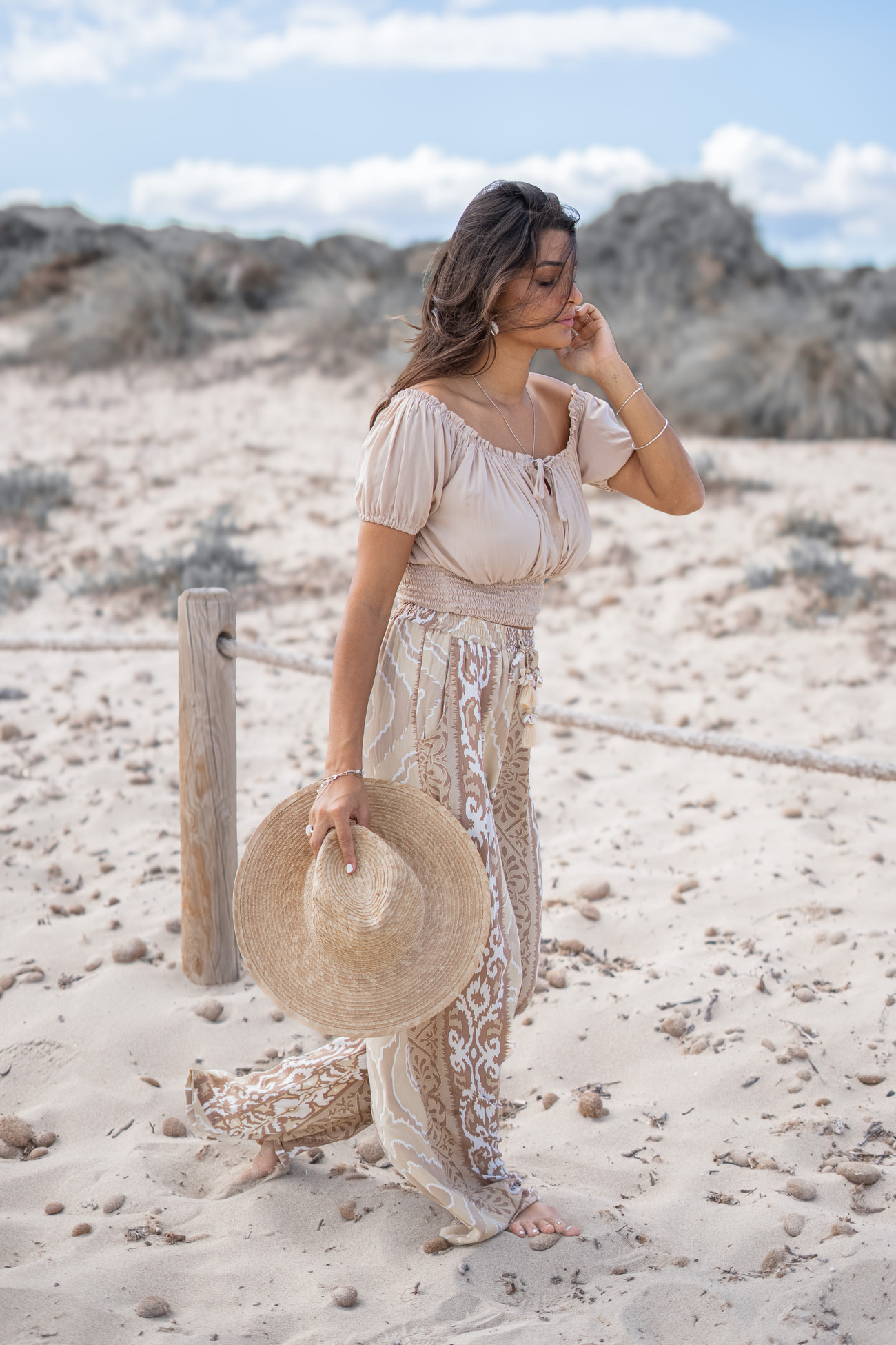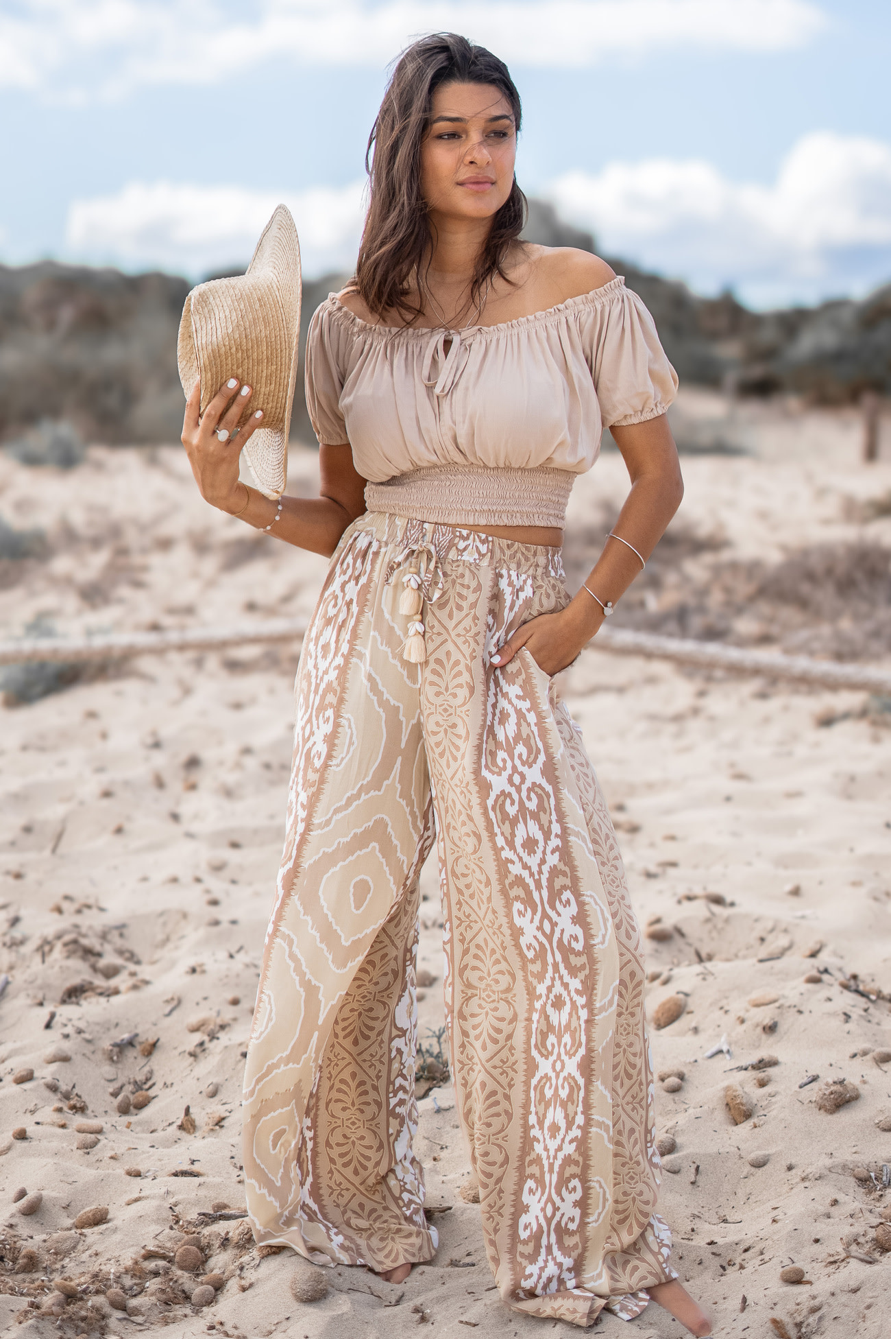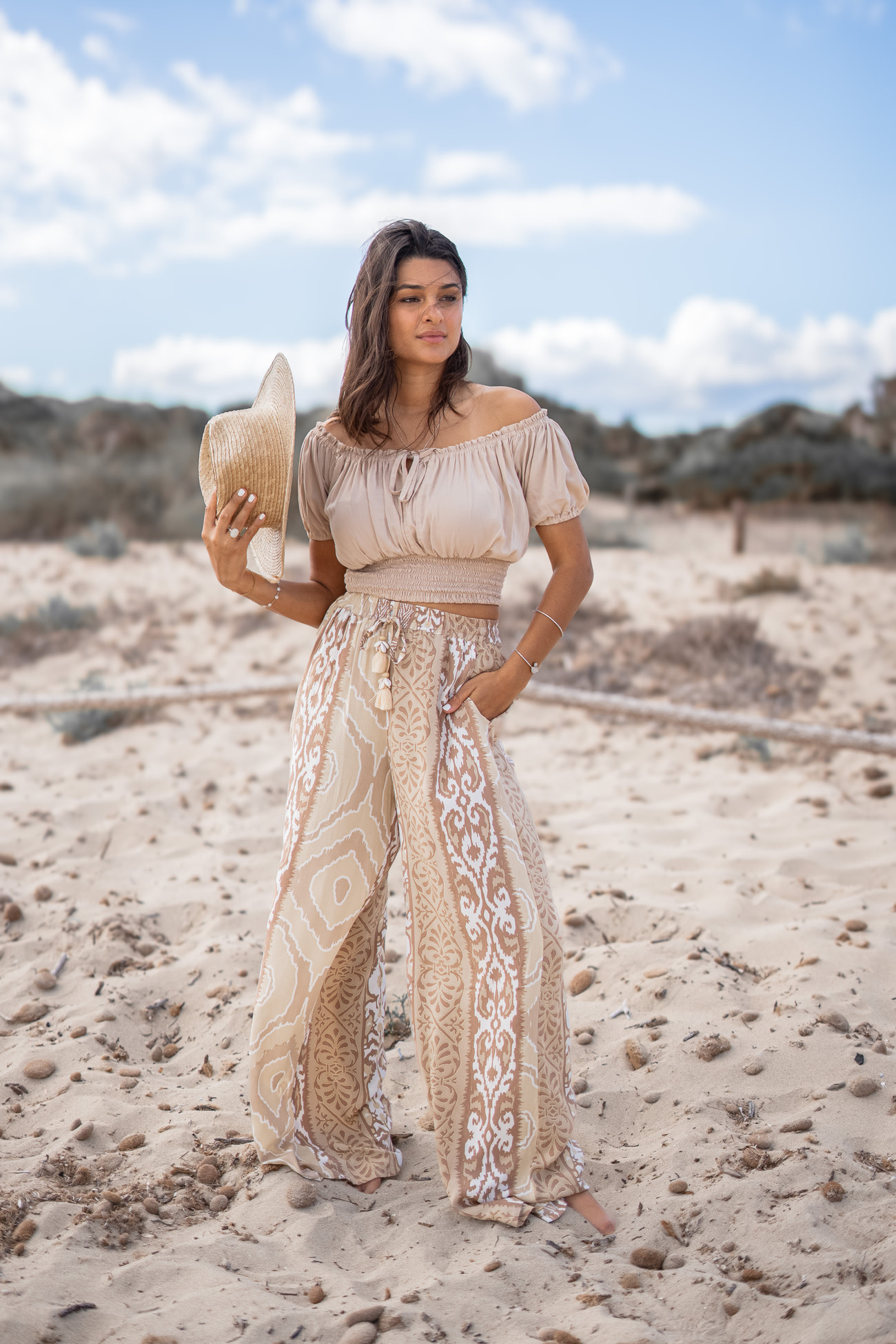 De pantalon Brisa Sun Natural van het Nederlandse merk Ibzmode is perfect voor zomerse dagen: licht, stijlvol en bohemian.
